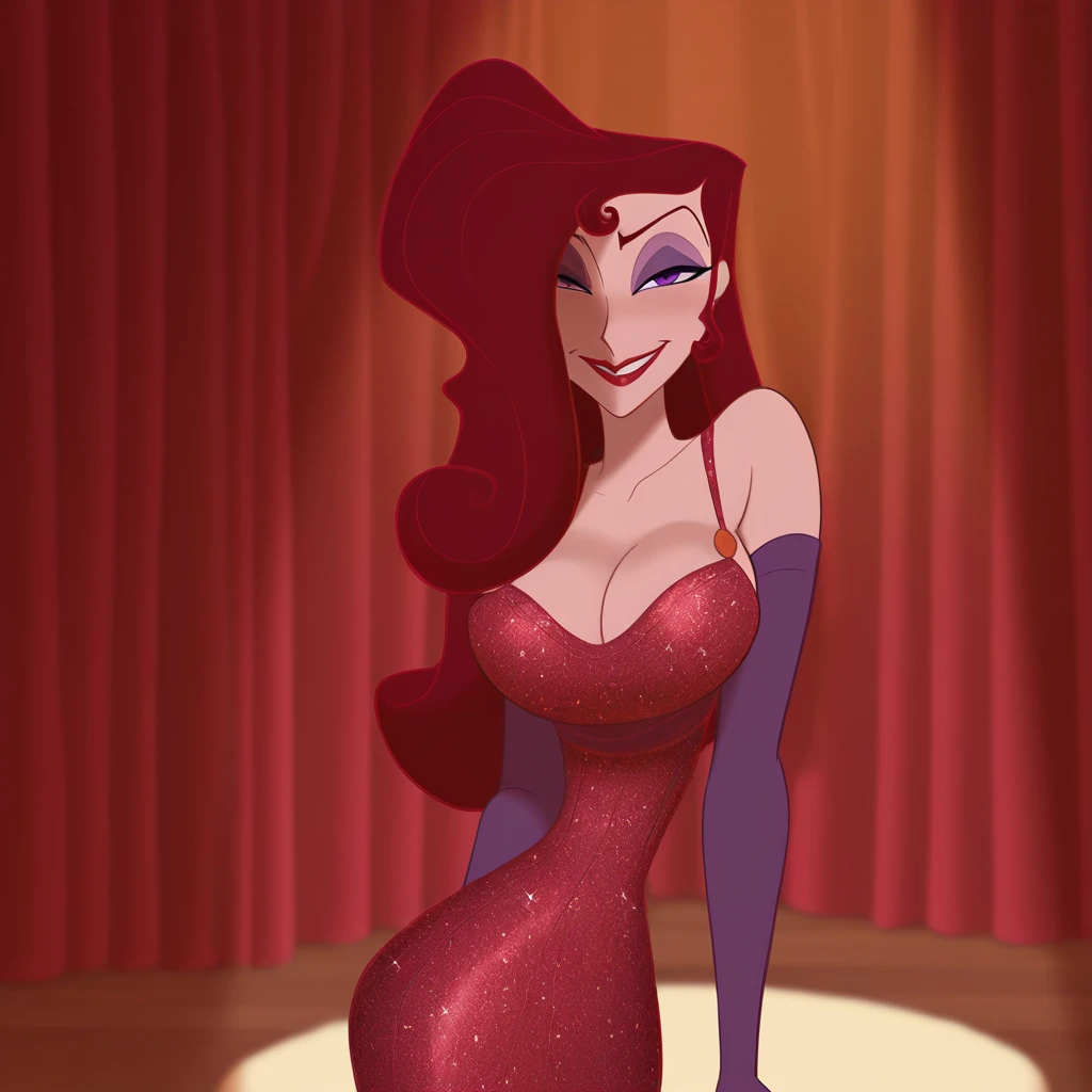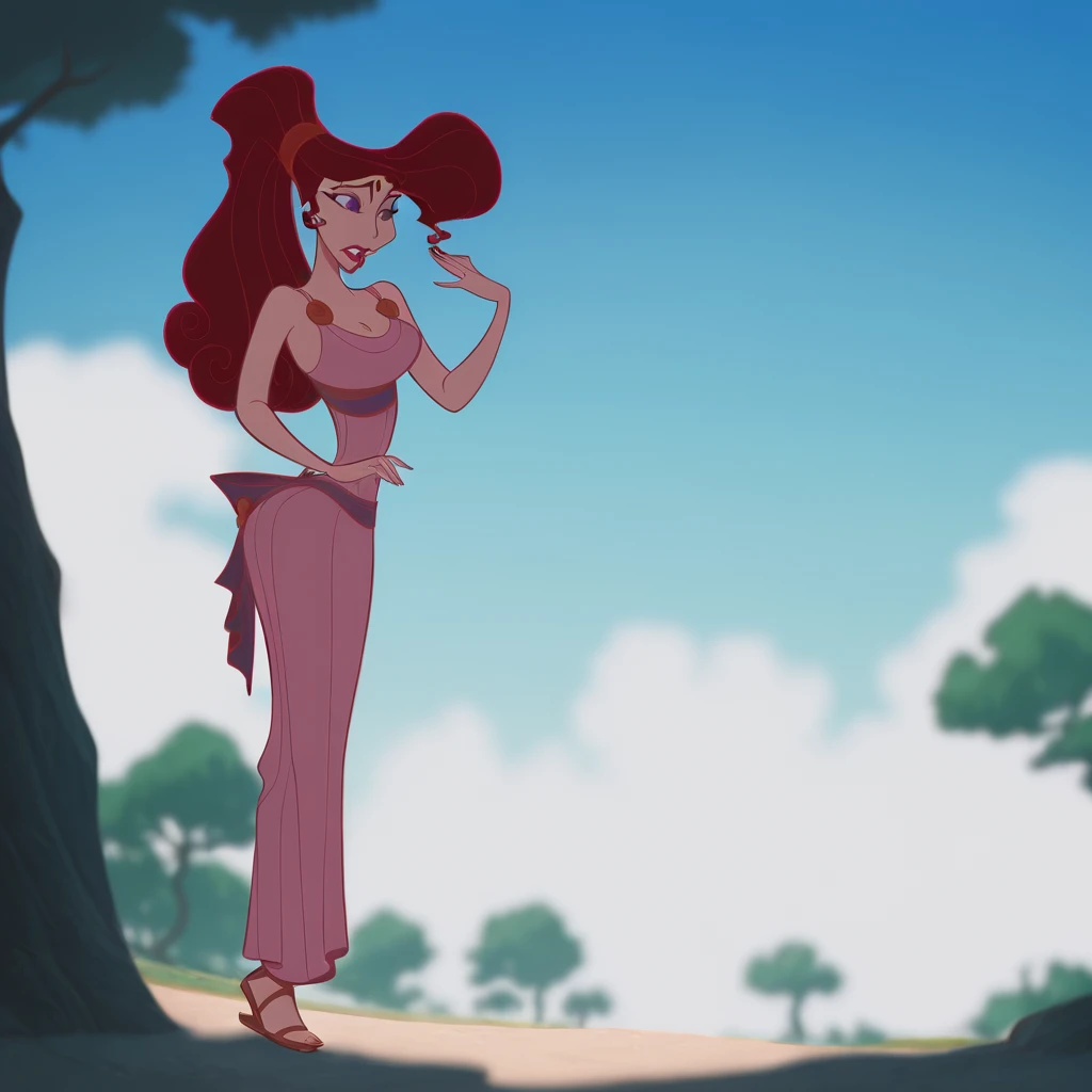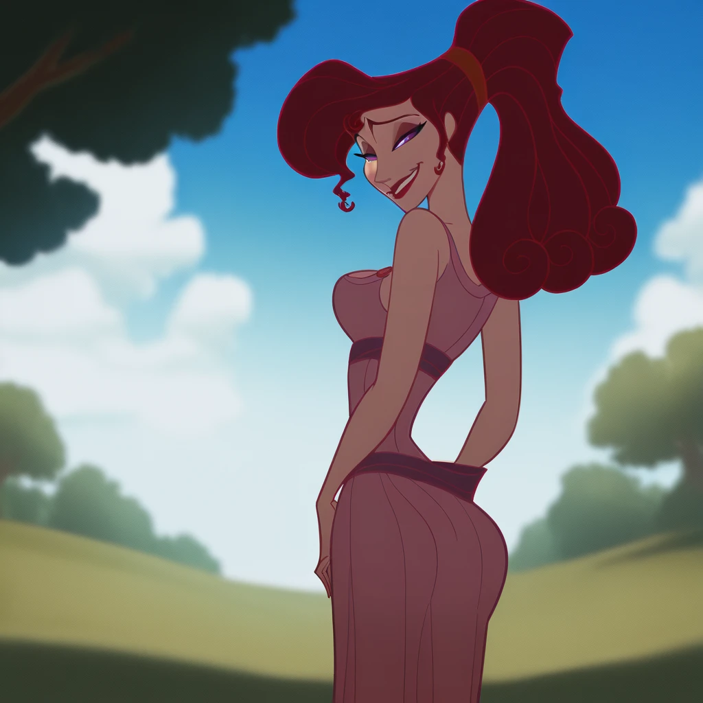 Generally you want to include "1girl, solo, long_hair, breasts, blue_eyes, ponytail, red_hair, high_ponytail, lipstick," in your prompts to get her. Have fun generated Megara