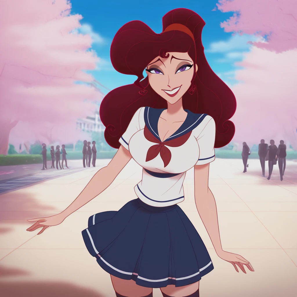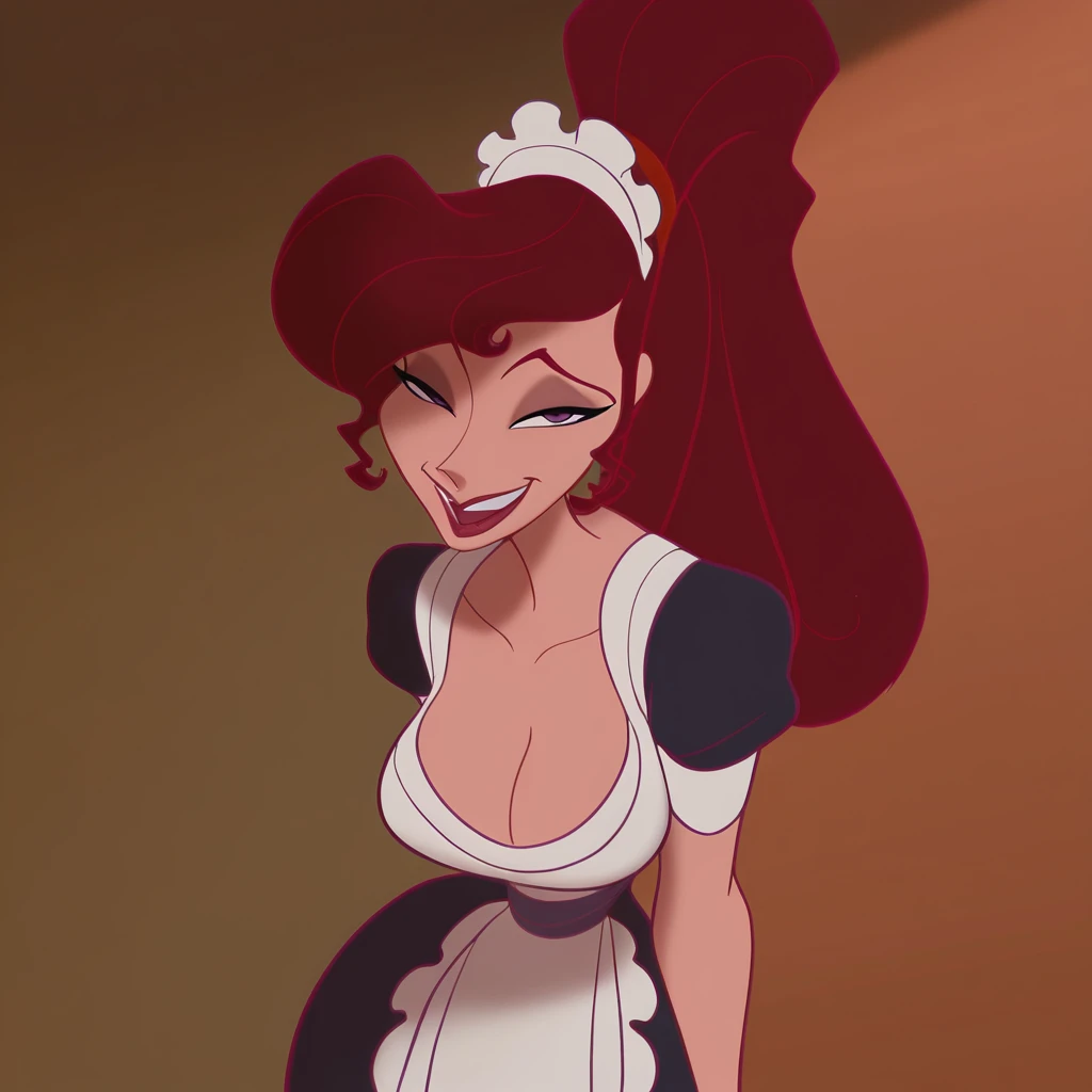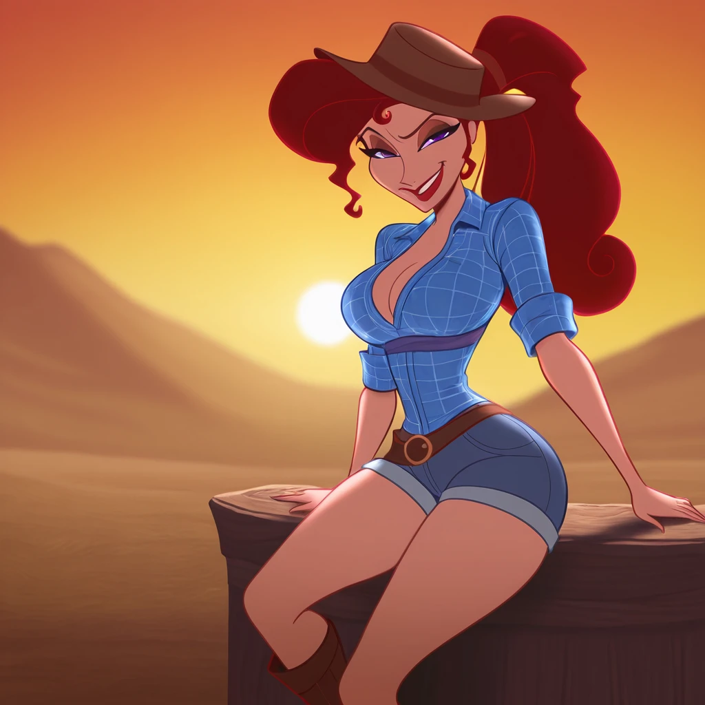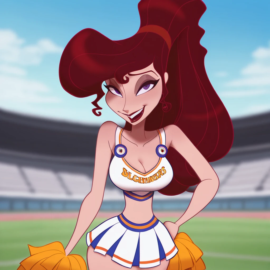 Generally you want to include "1girl, solo, long_hair, breasts, blue_eyes, ponytail, red_hair, high_ponytail, lipstick," in your prompts to get her. Have fun generated Megara