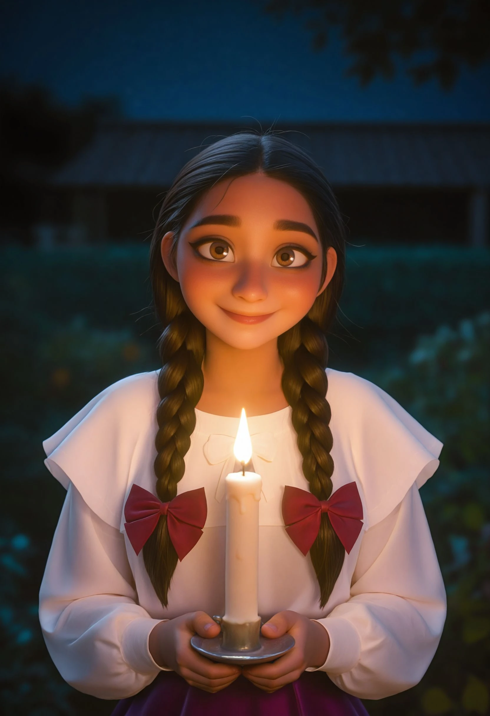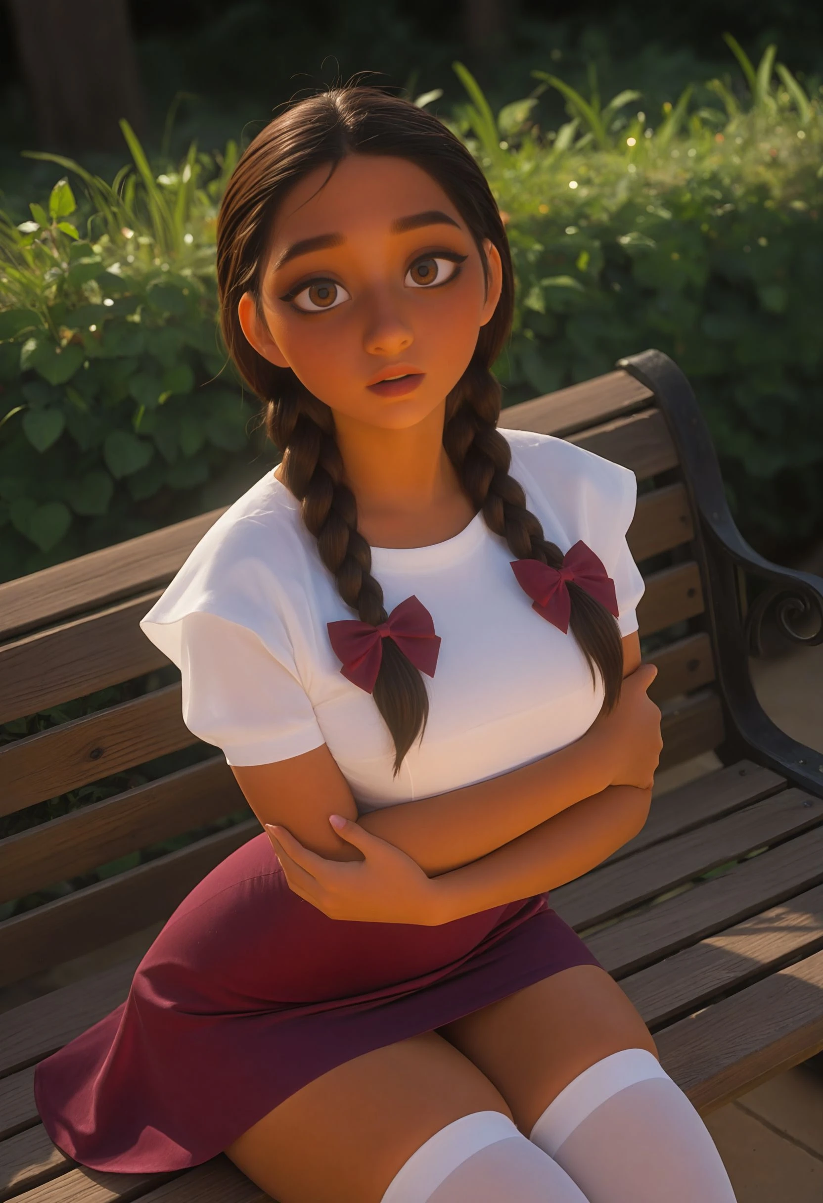 Keywords: youngalmamad, brown eyes, thick eyebrown, brown hair, double braids, hair over shoulder, red bow