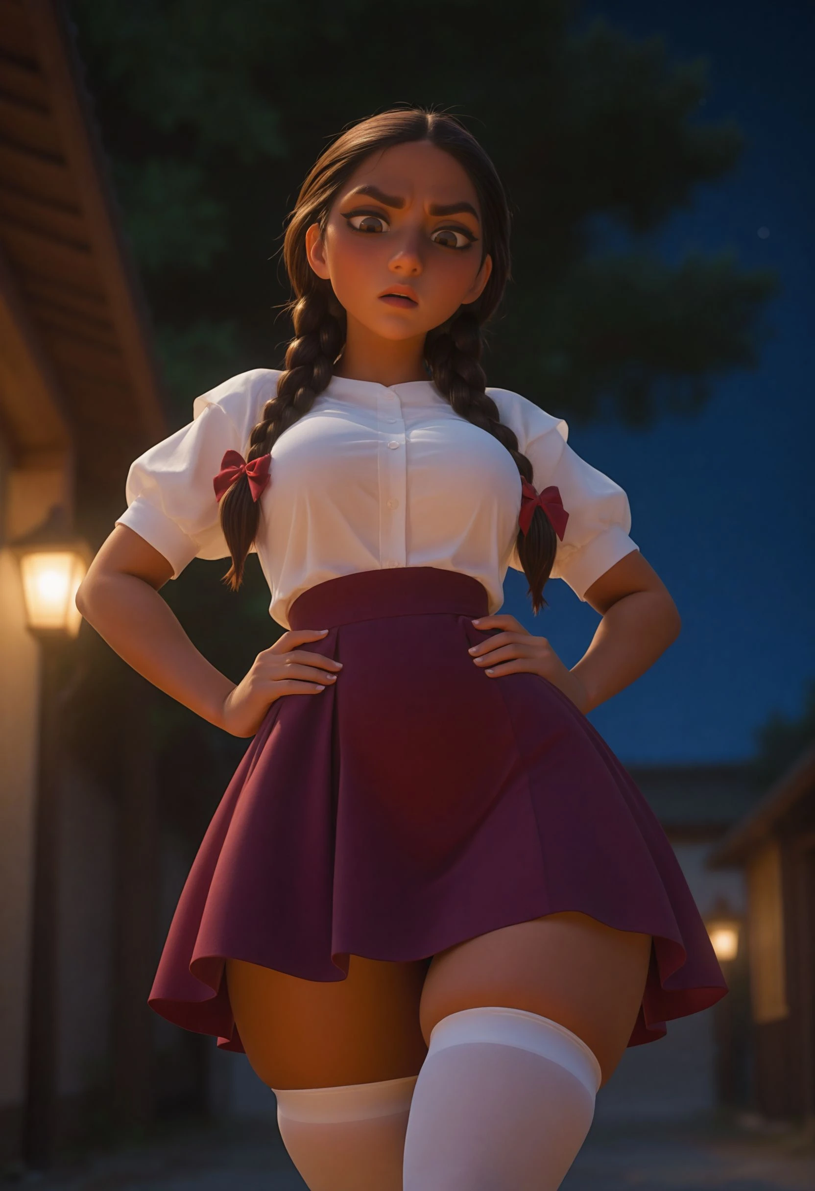 youngalmamad, brown eyes, thick eyebrown, brown hair, double braids, hair over shoulder, red bow