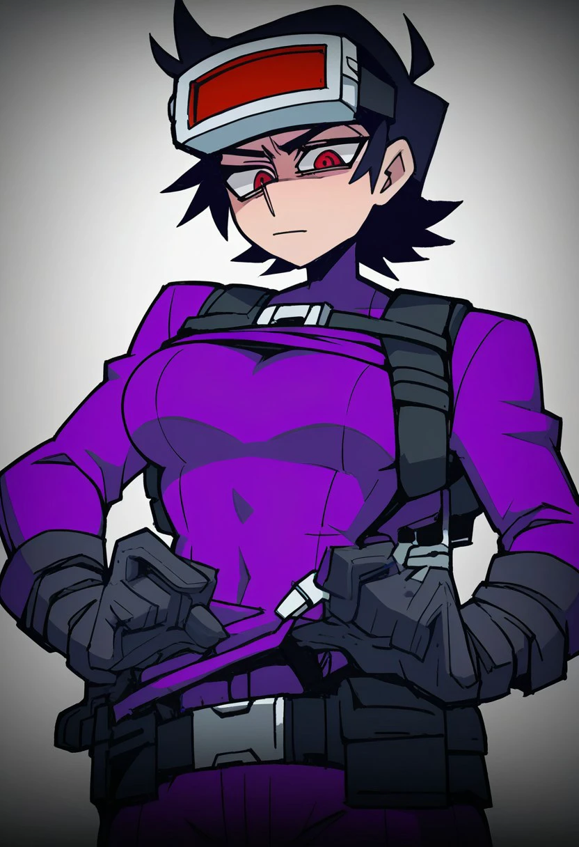 Recommended words: "ghost girl, short hair, green theme, gloves, belt, body suit, welding mask"
