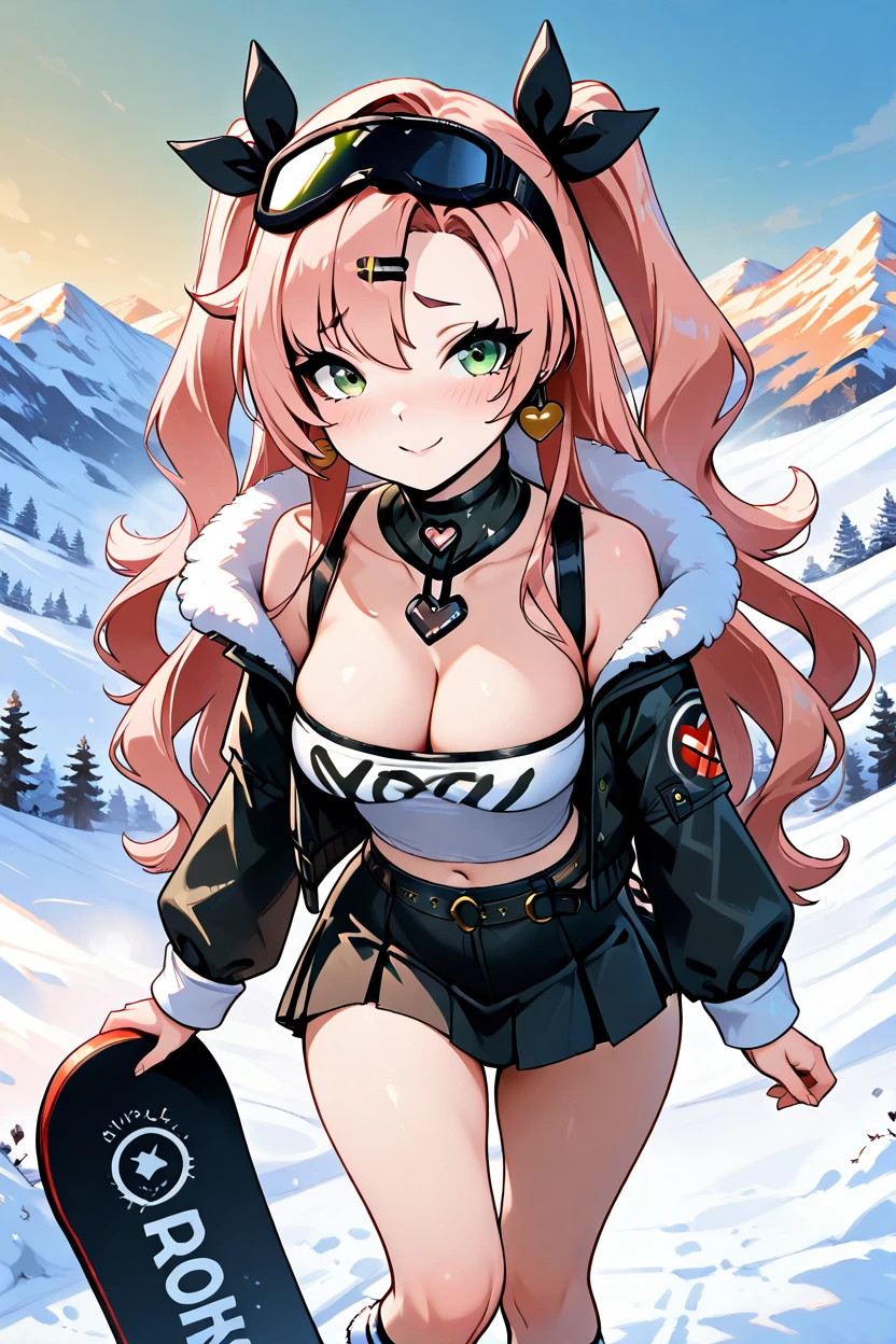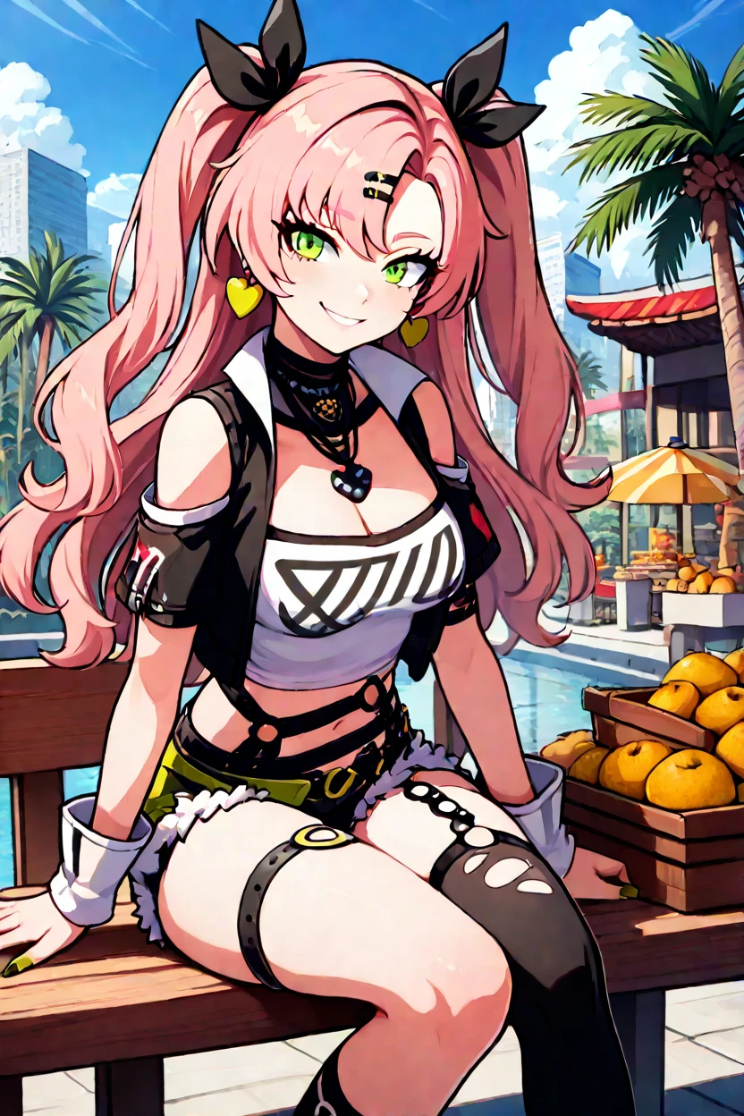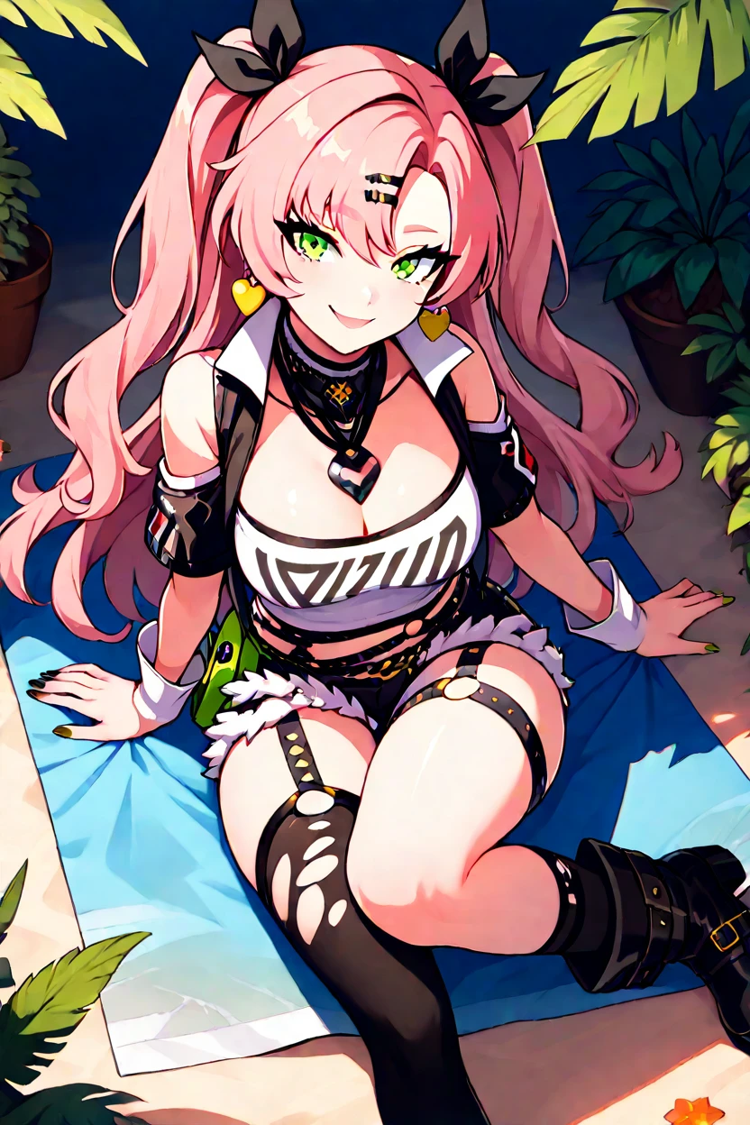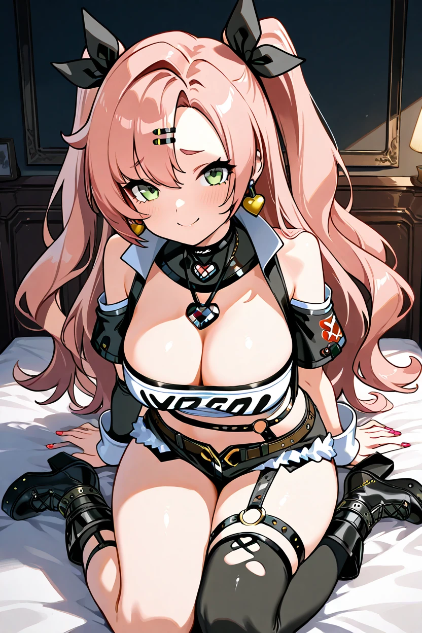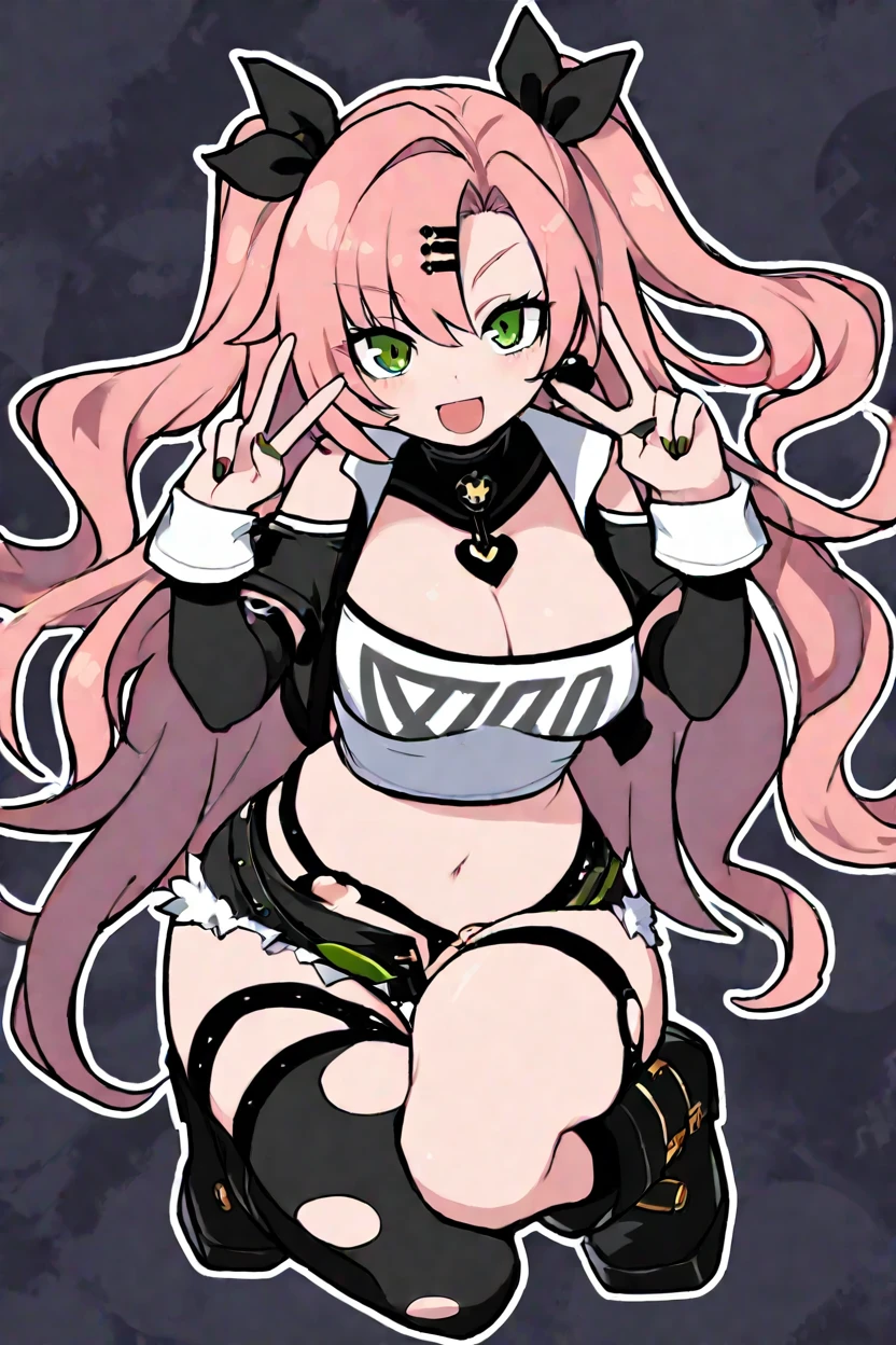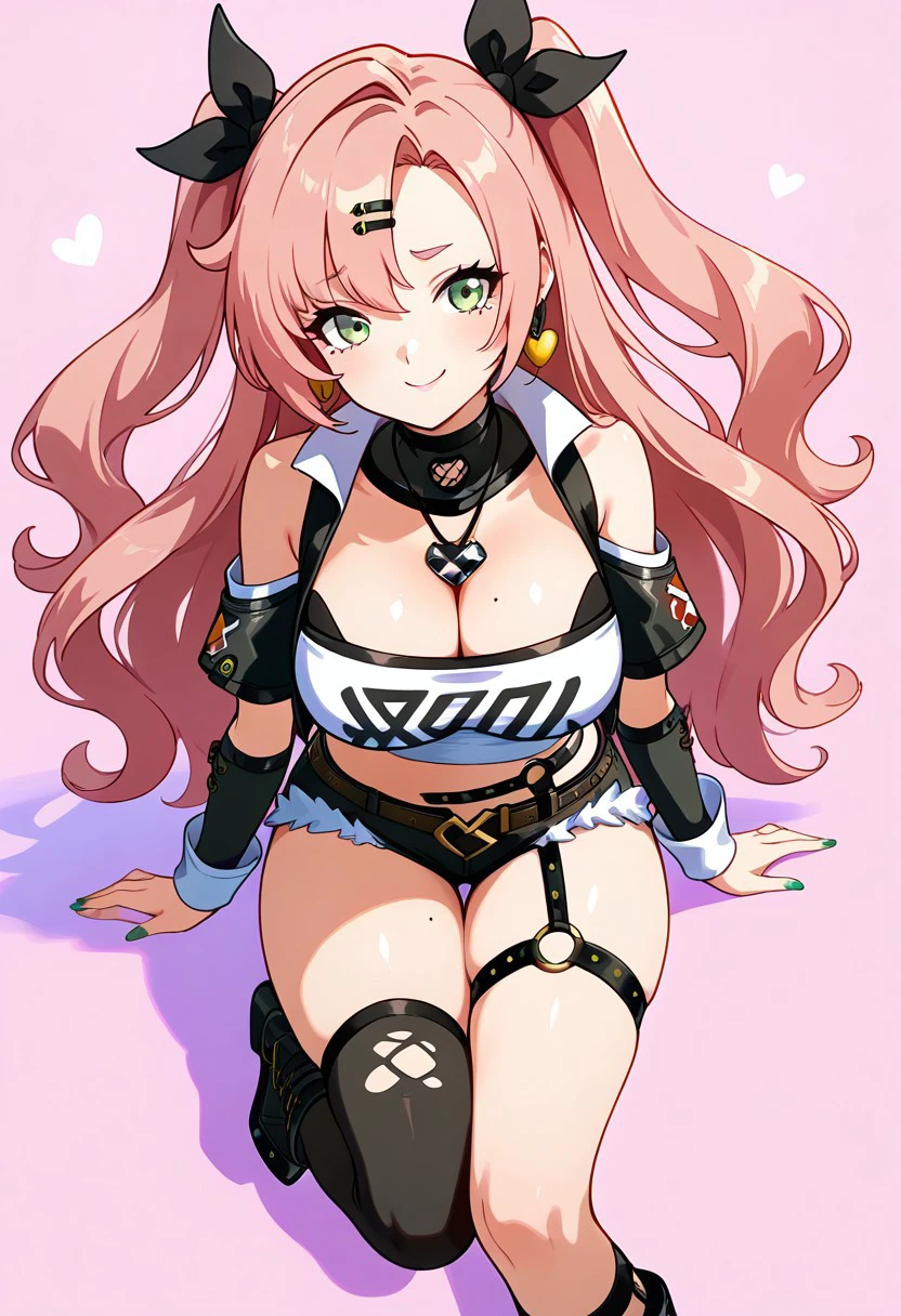 nicole demara, green eyes, pink hair, hair ornament, hair ribbon, hairclip, long hair, mole, mole on breast, mole on thigh, mole under eye, two side up, ribbon, black footwear, black ribbon, black shorts, black socks, black thighhighs, boots, cleavage, crop top, earrings, jewelry, kneehighs, nail polish, necklace, o-ring, short shorts, shorts, single kneehigh, single sock, single thighhigh, socks, thigh strap, thighhighs, torn clothes, two side up,