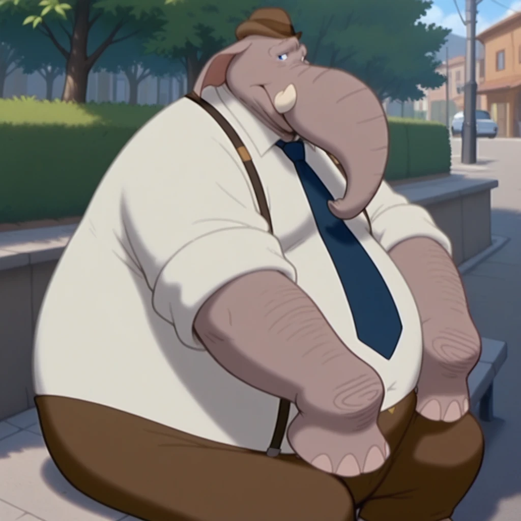 Tags: elephant, bald, animal ears, blue eyes, overweight, fat man, furry male, gray skin, trunk, tusks,