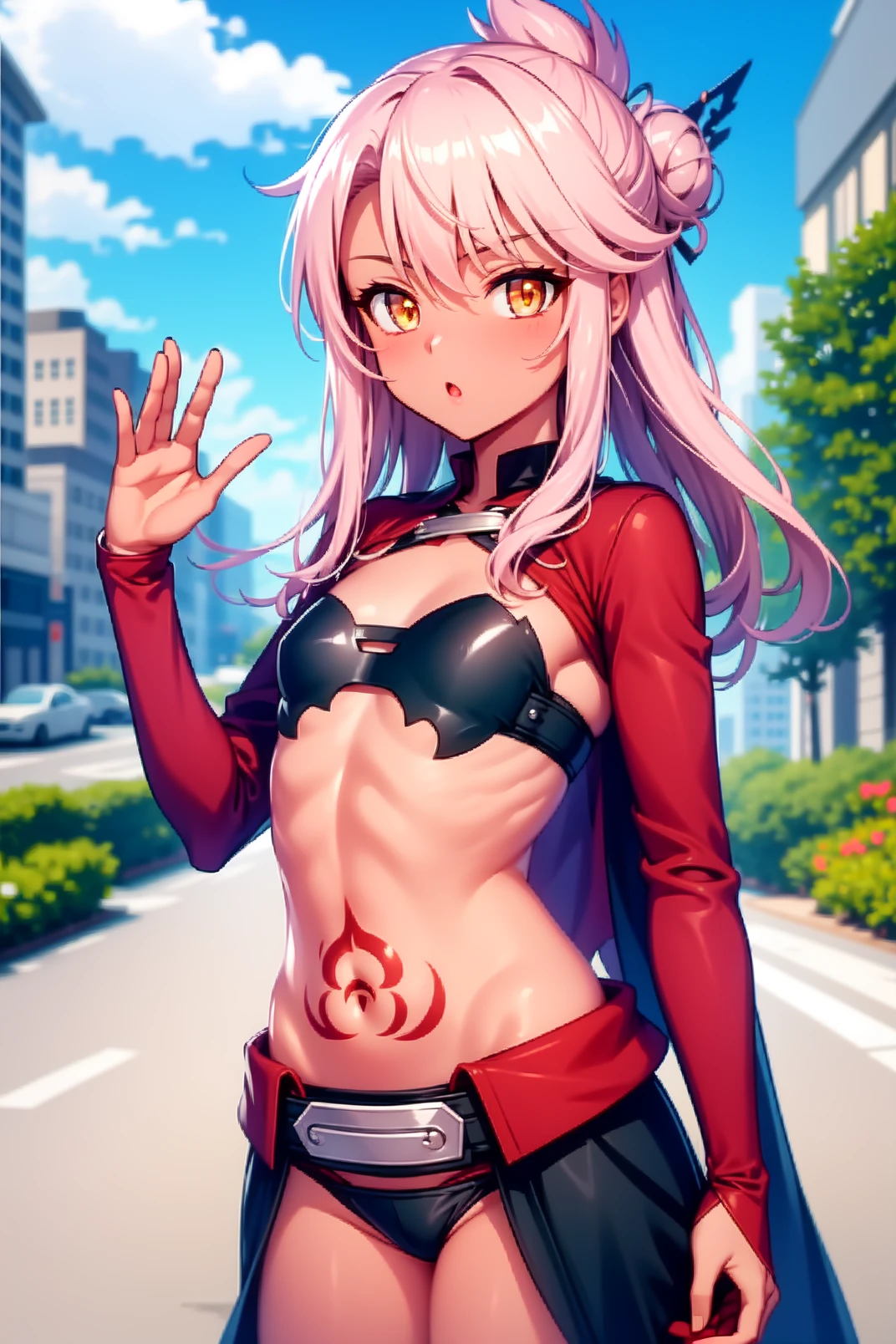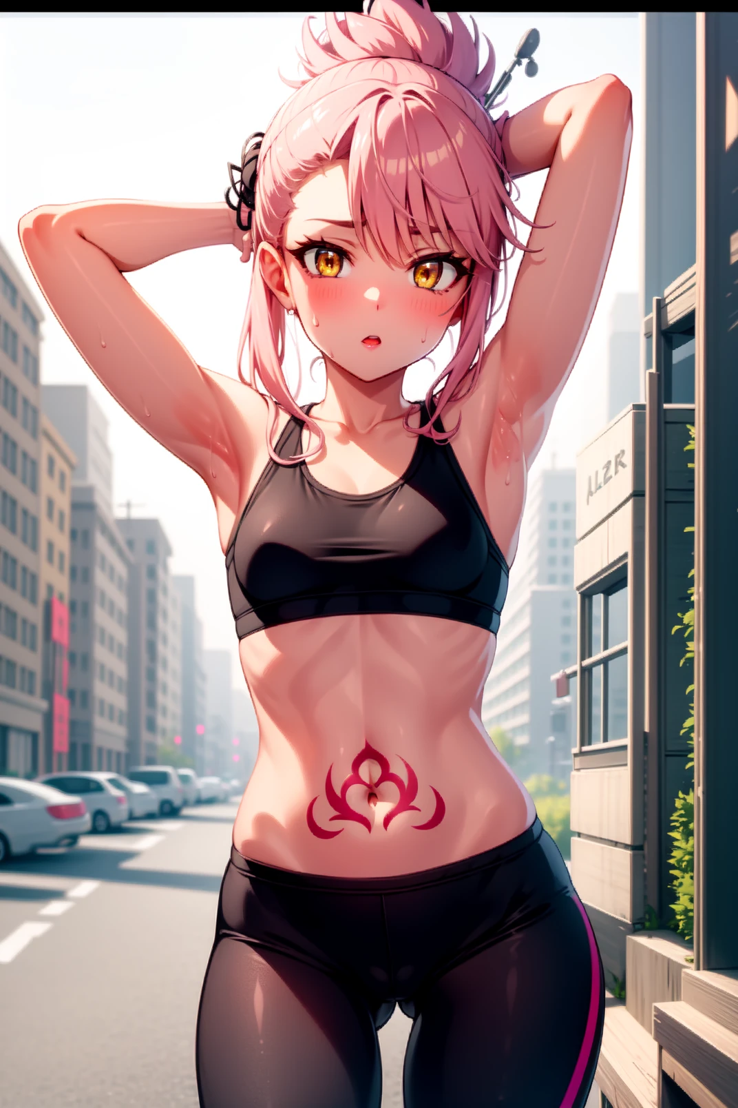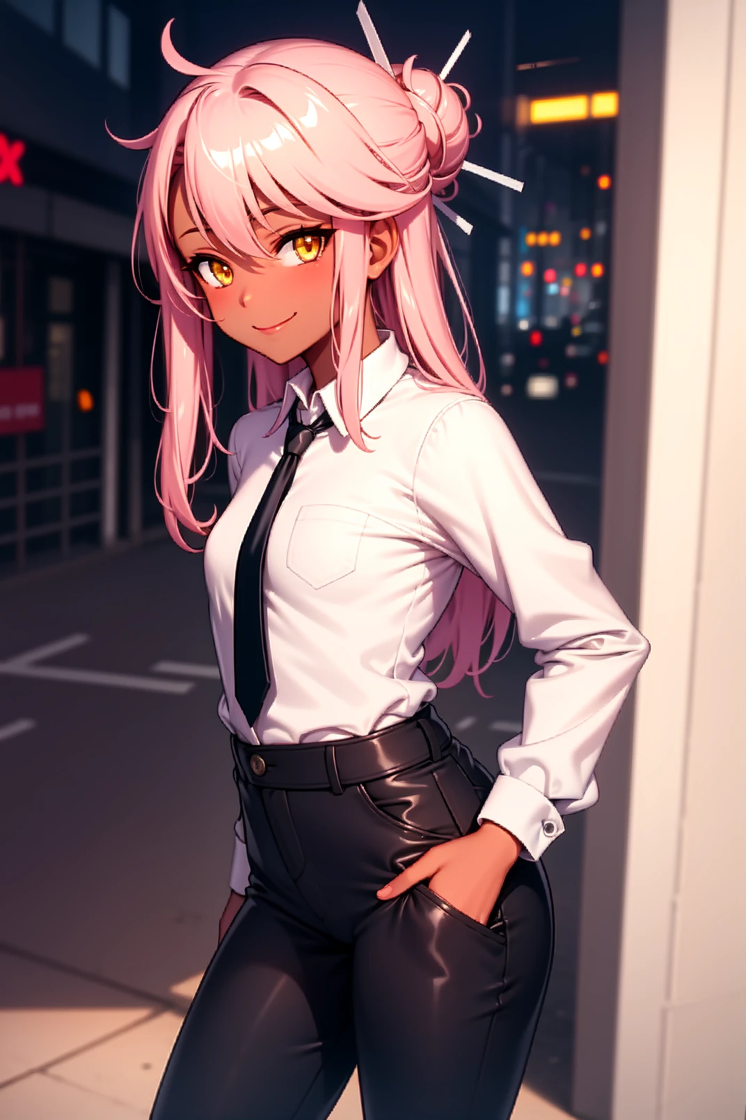 chloe, yellow eyes, dark skin, pink hair, long hair, hair ornament, half updo, stomach tattoo