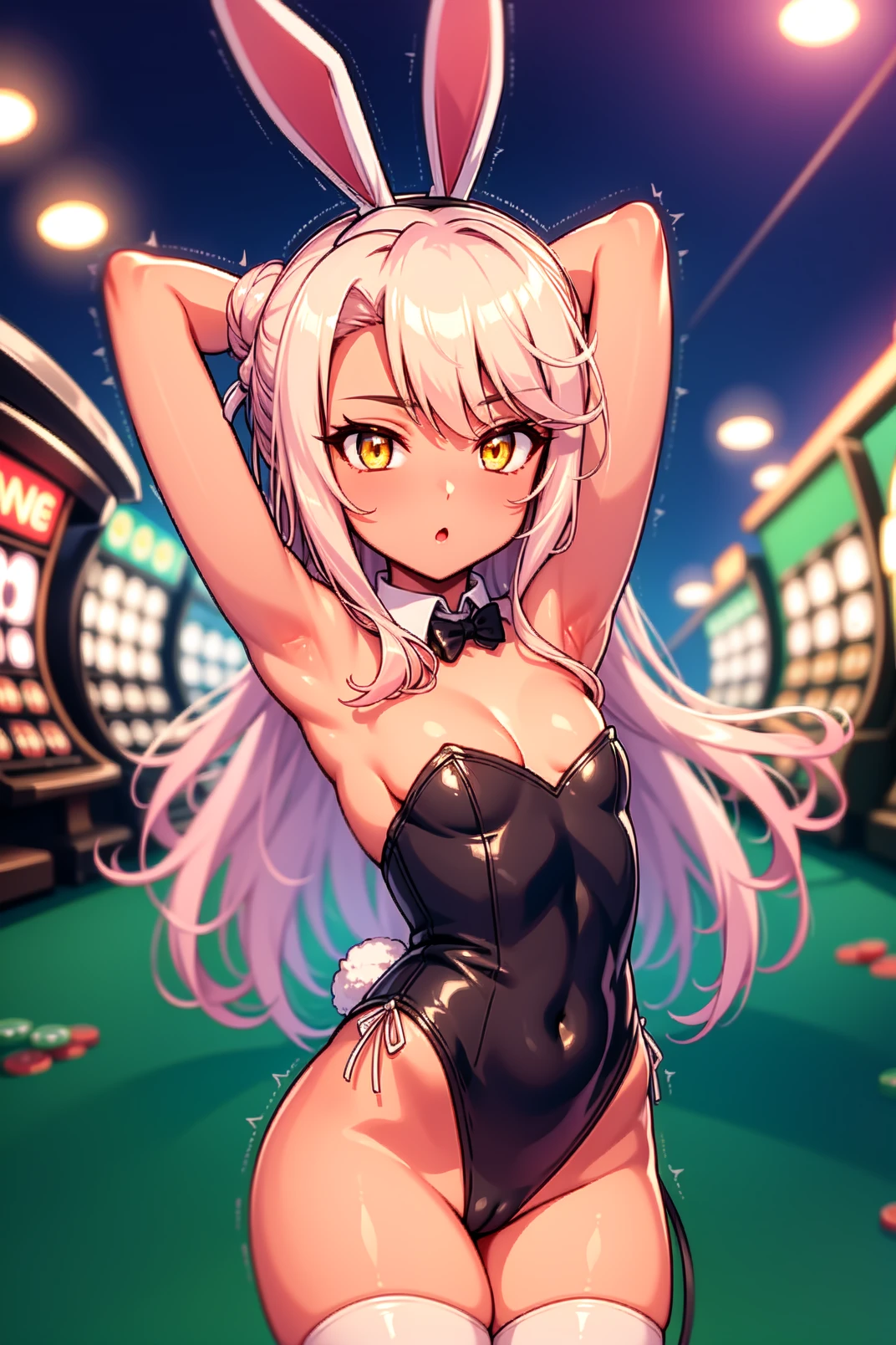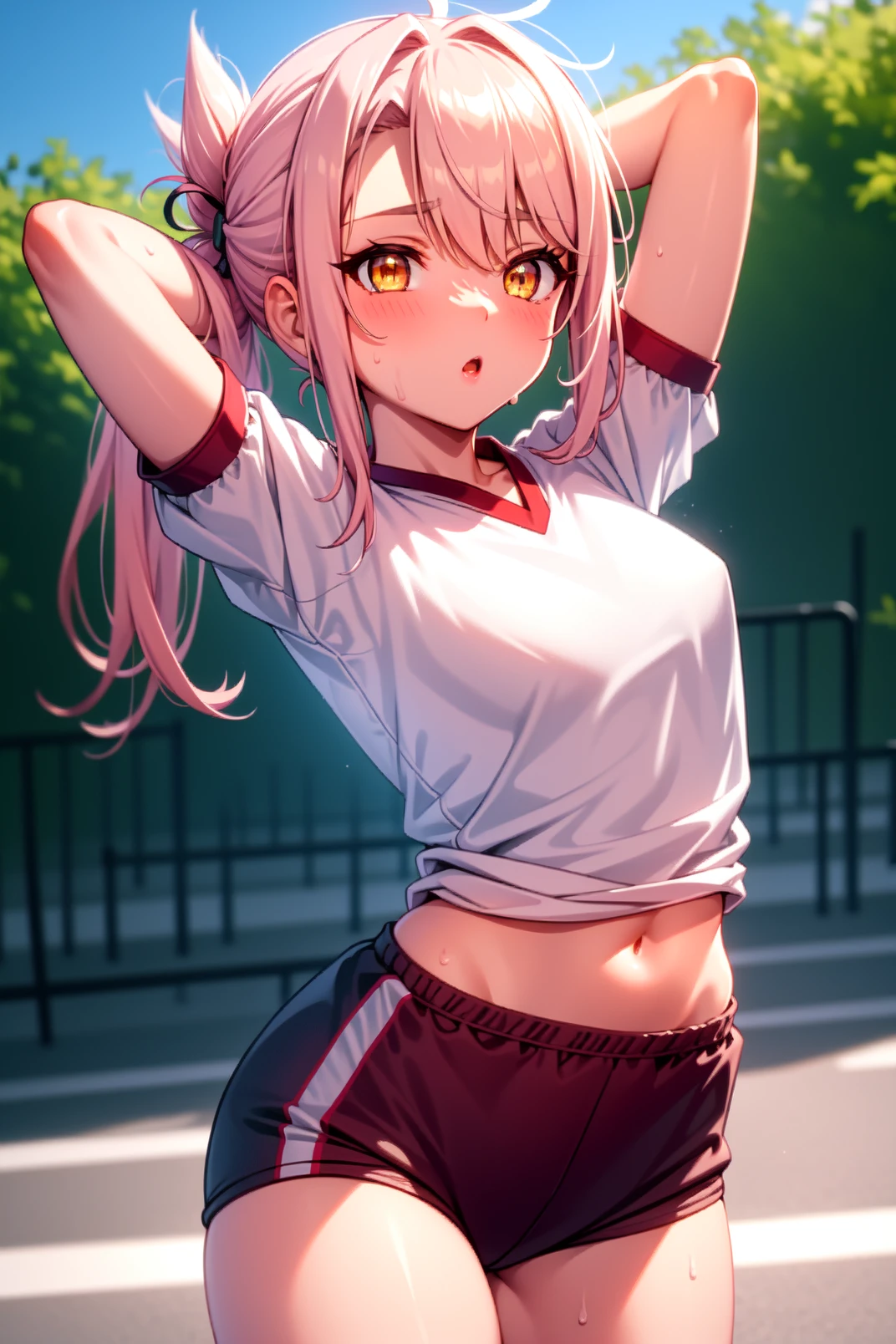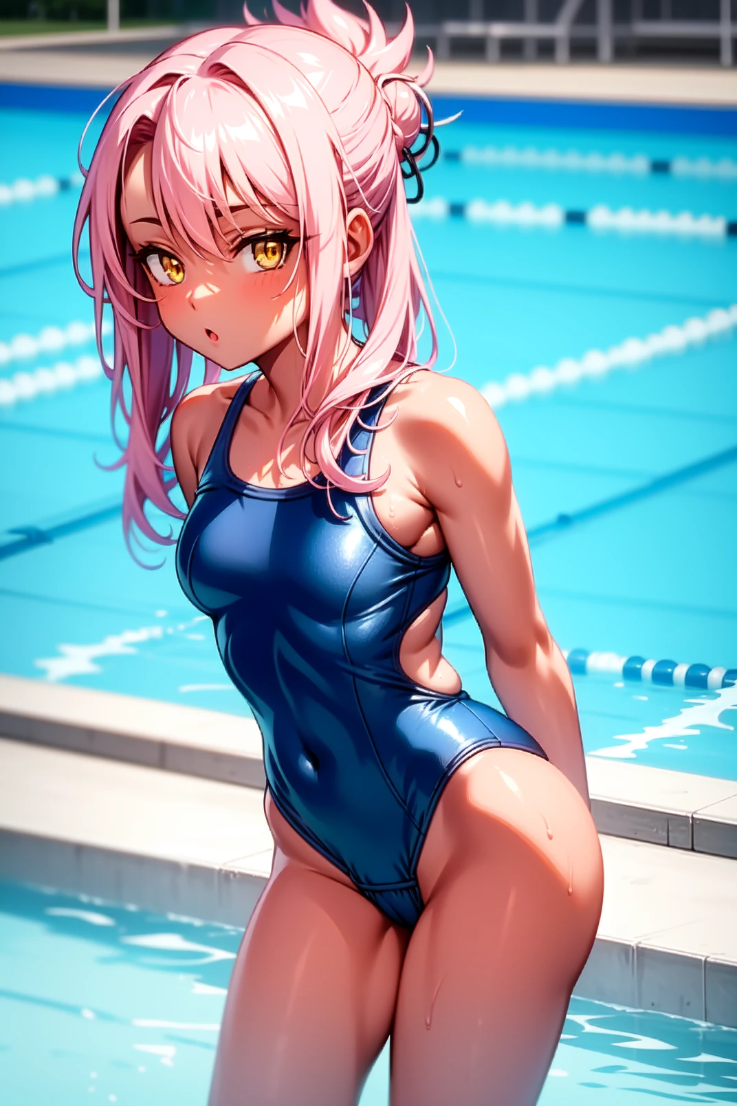 chloe, yellow eyes, dark skin, pink hair, long hair, hair ornament, half updo, stomach tattoo