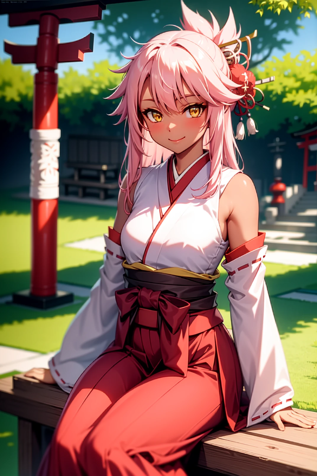 appearance: chloe, yellow eyes, dark skin, pink hair, long hair, hair ornament, half updo, stomach tattoo