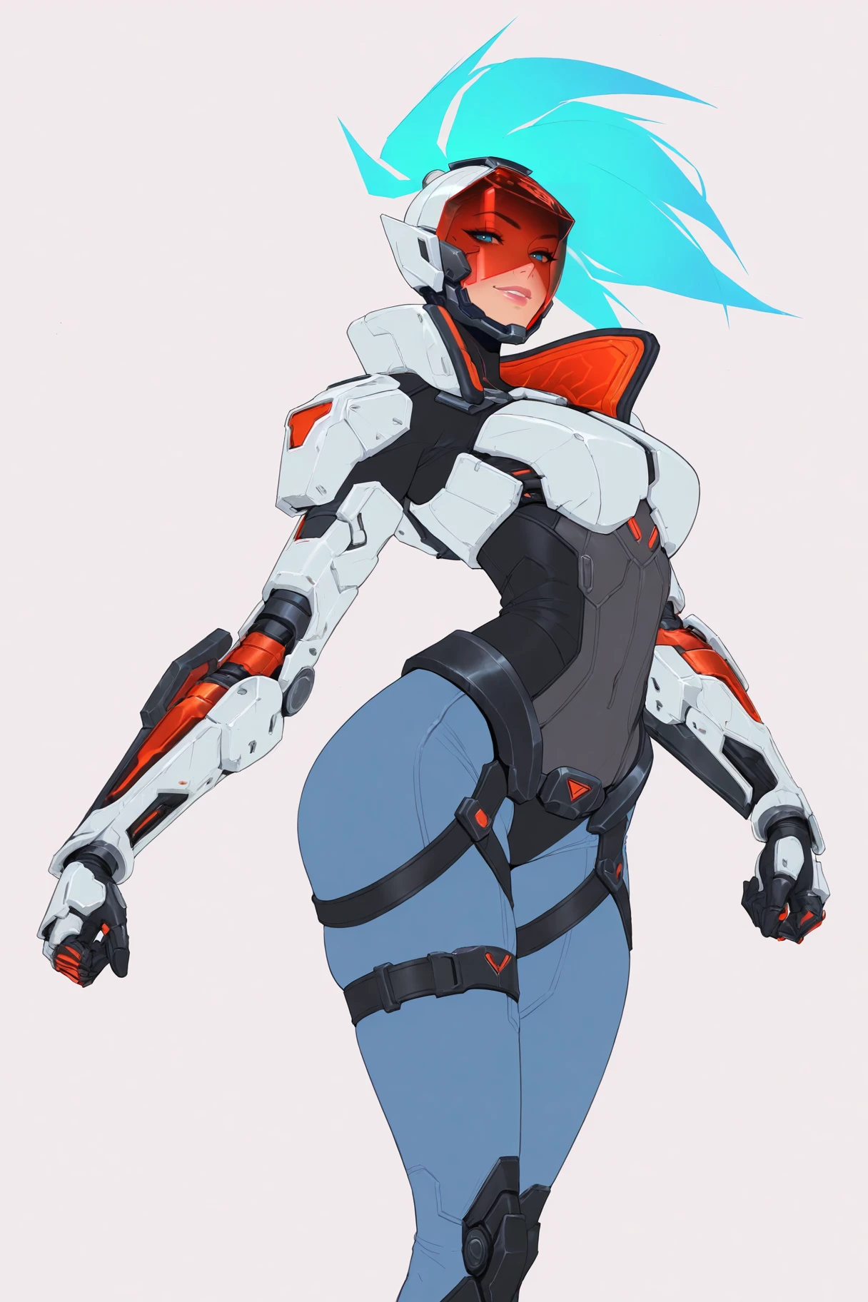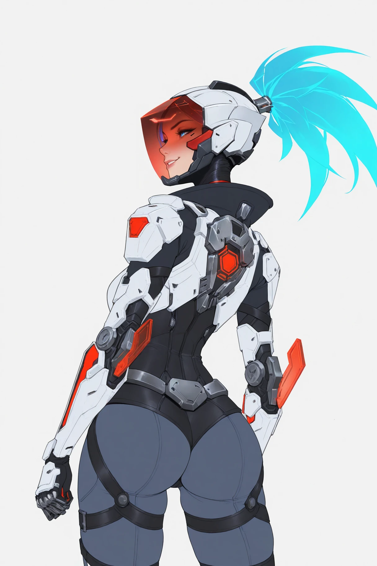 Project_Akali,blue eyes,cyan ponytail,high ponytail,glowing hair,thick thighs,helmet visor,red visor,white armor plates,sleek ,metallic armor,cyberpunk,armored boots,blue leggins,thigh straps,red collar,high collar,white helmet,