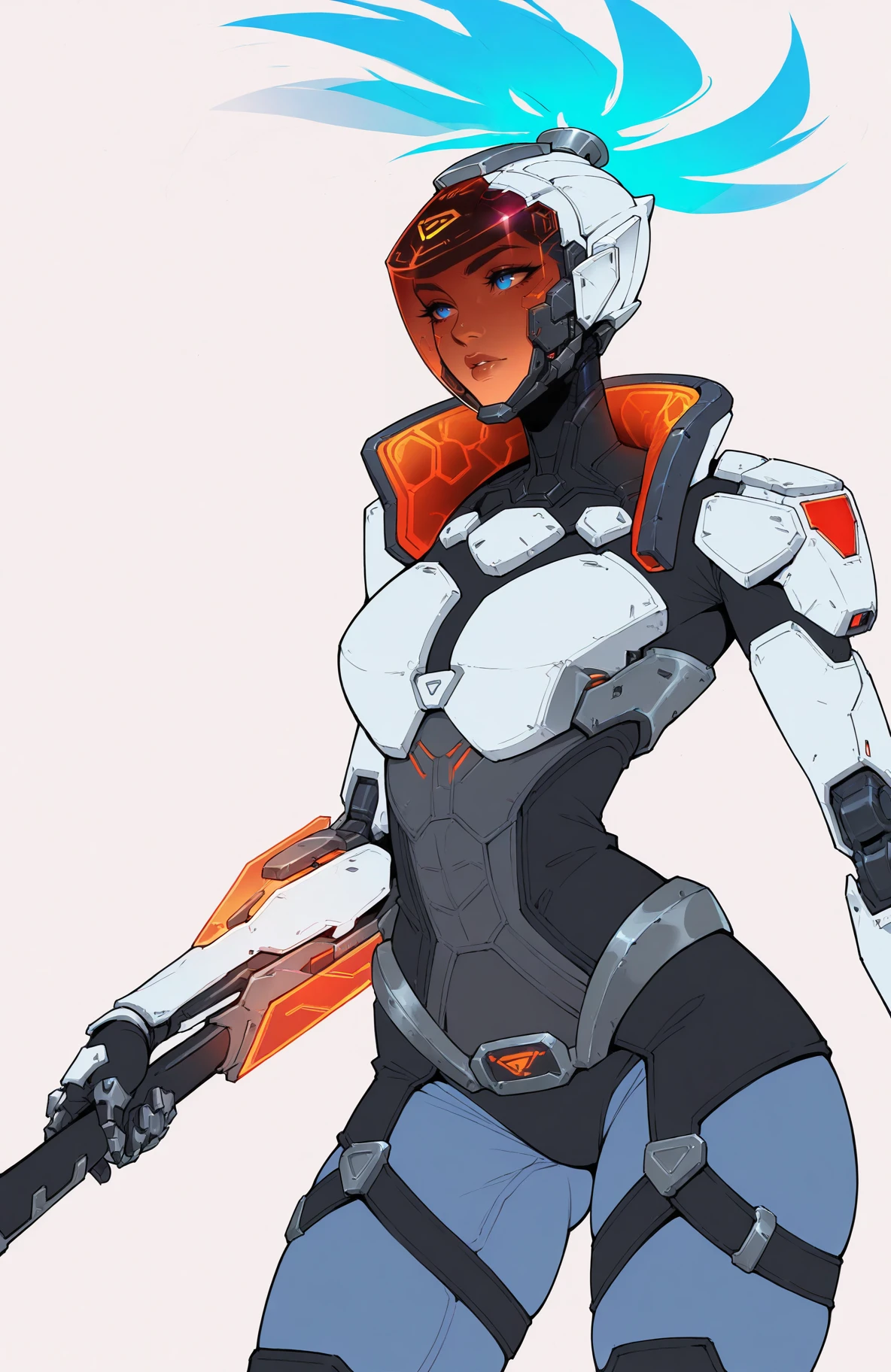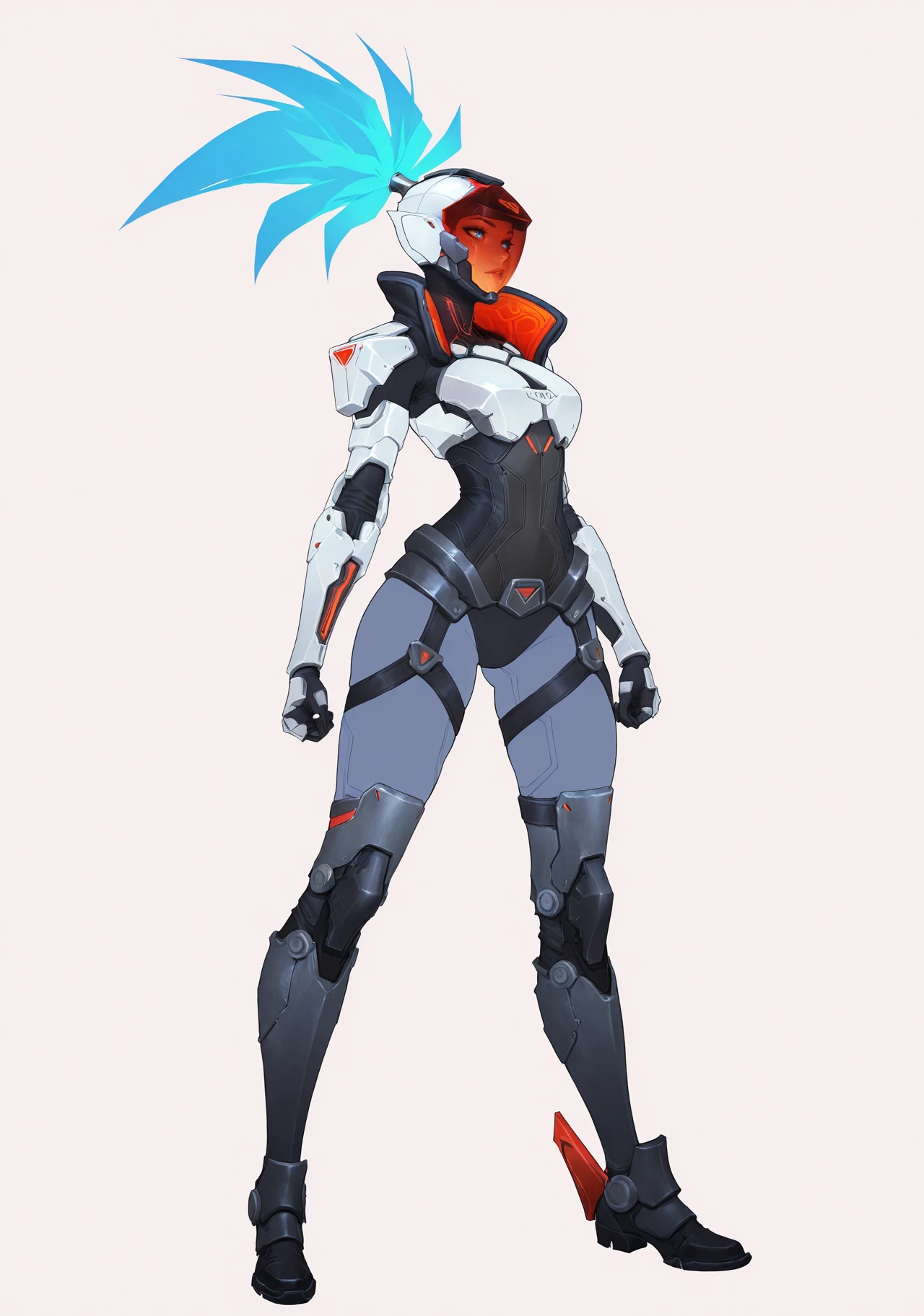 Project_Akali,blue eyes,cyan ponytail,high ponytail,glowing hair,thick thighs,helmet visor,red visor,white armor plates,sleek bodysuit,metallic armor,cyberpunk,armored boots,blue leggins,thigh straps,red collar,high collar,white helmet,