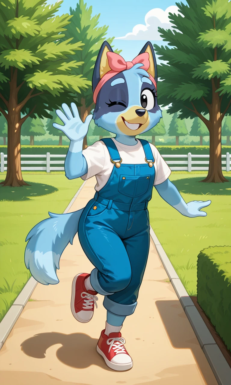 Bluey_Heeler_(Bluey series), yellow-blue fur, Two-tone fur, anthro dog, black eyes, fluffy tail