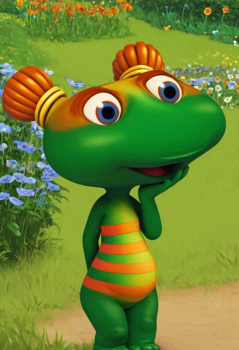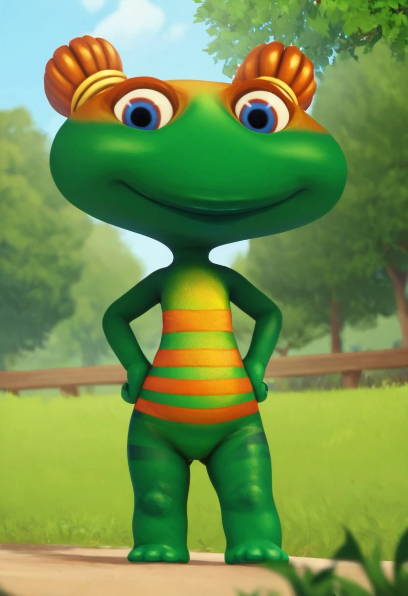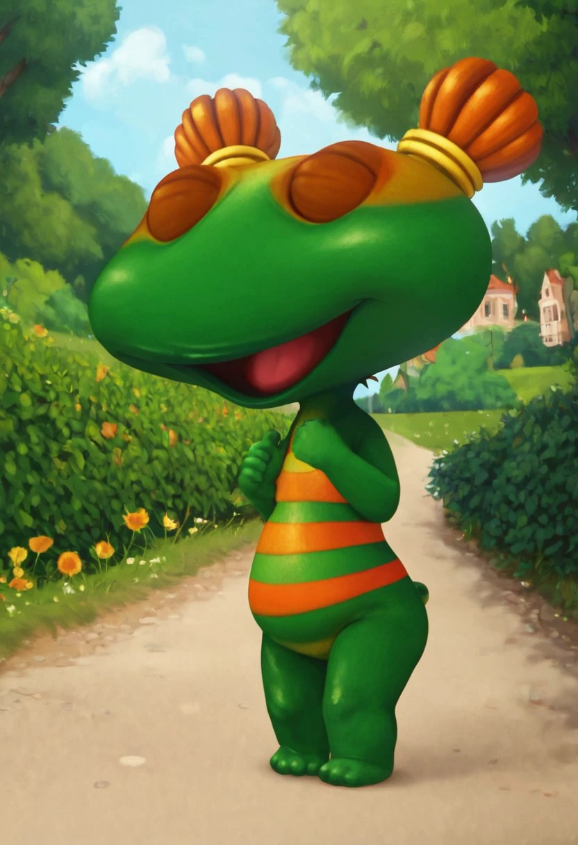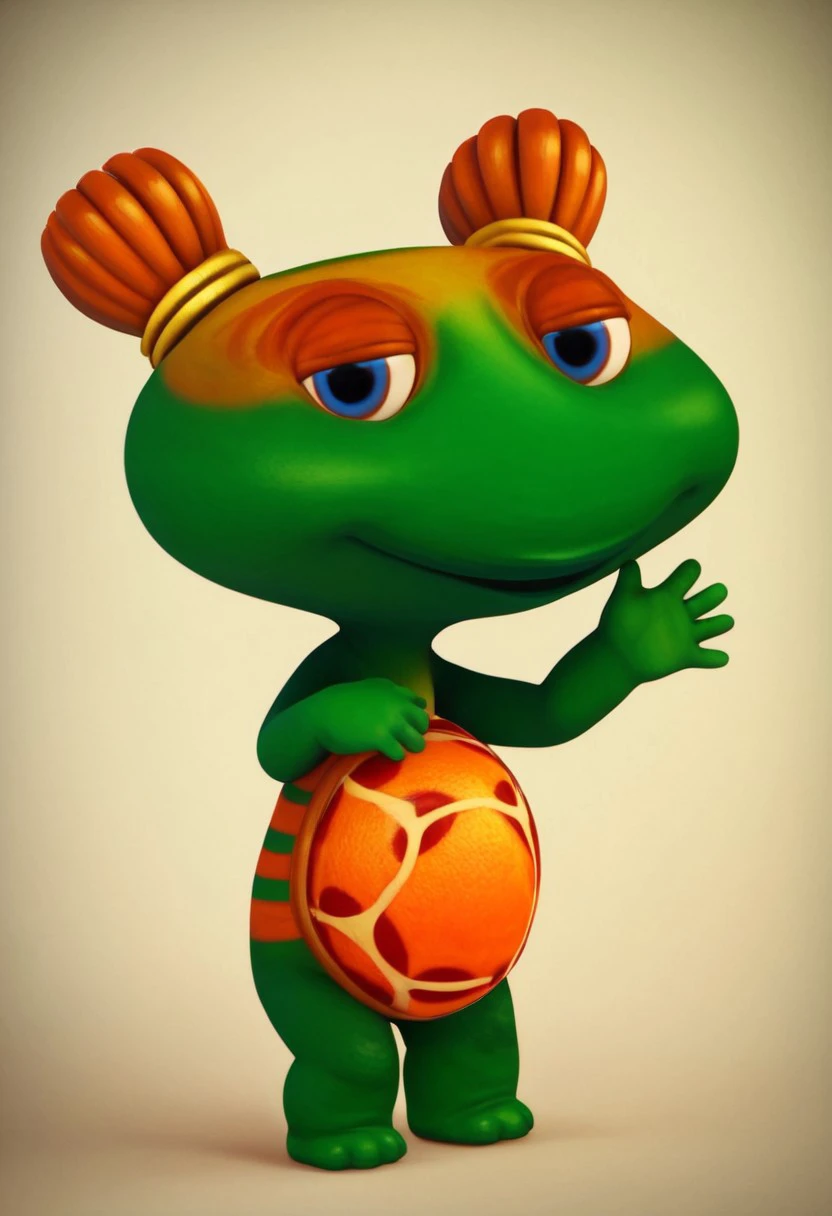 lulu zipadoo, 1girl, furry, anthro, female turtle (frog shaped head), green skin, blue eyes, orange eyelid, orange hair, yellow hair ties, pigtails, wide head, chibi, 3 oranges stripes around belly, plump, little tail, wide hips, short body, short legs,