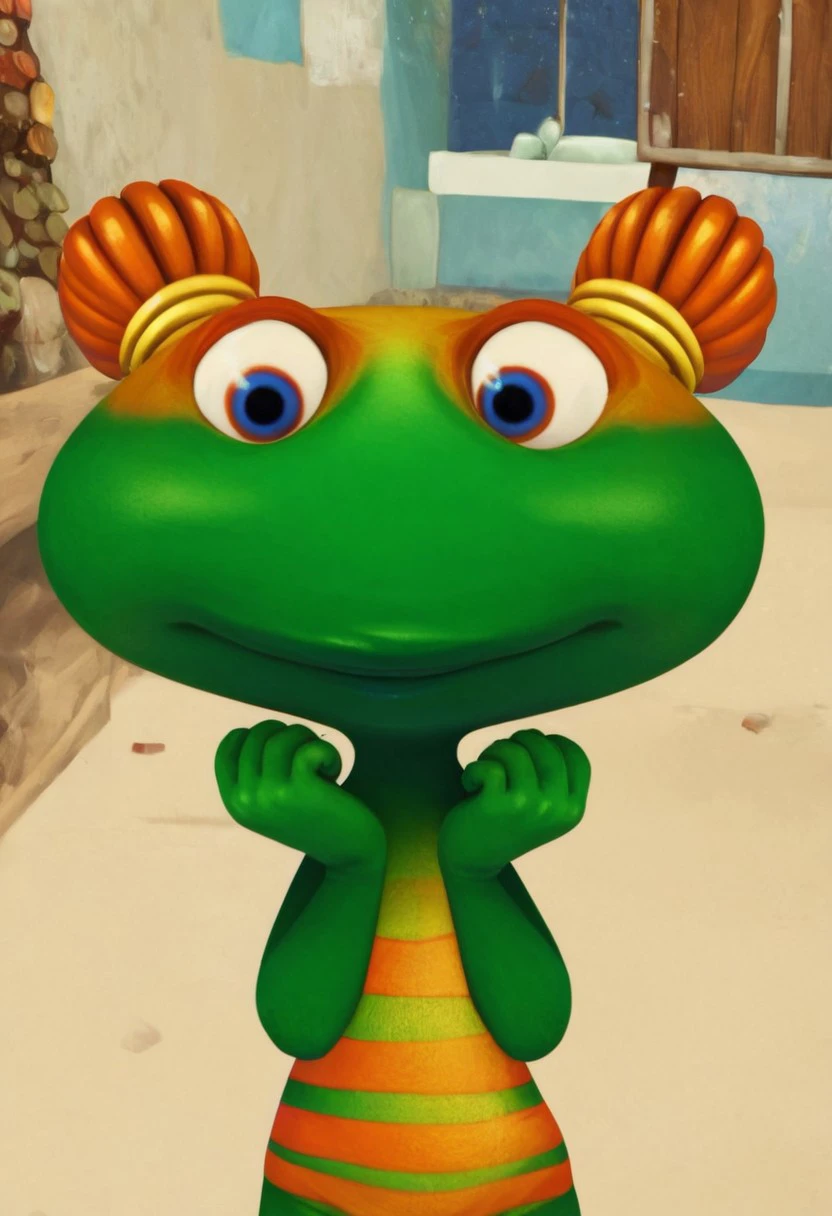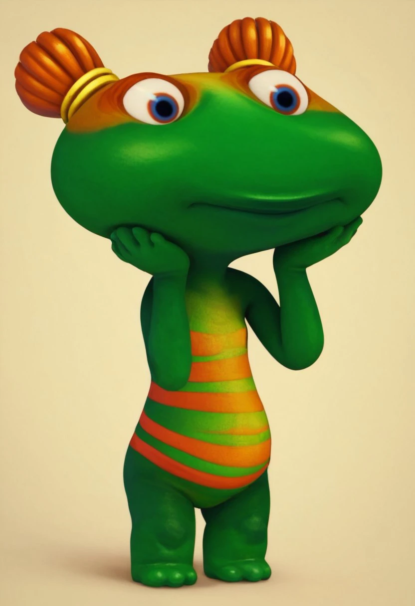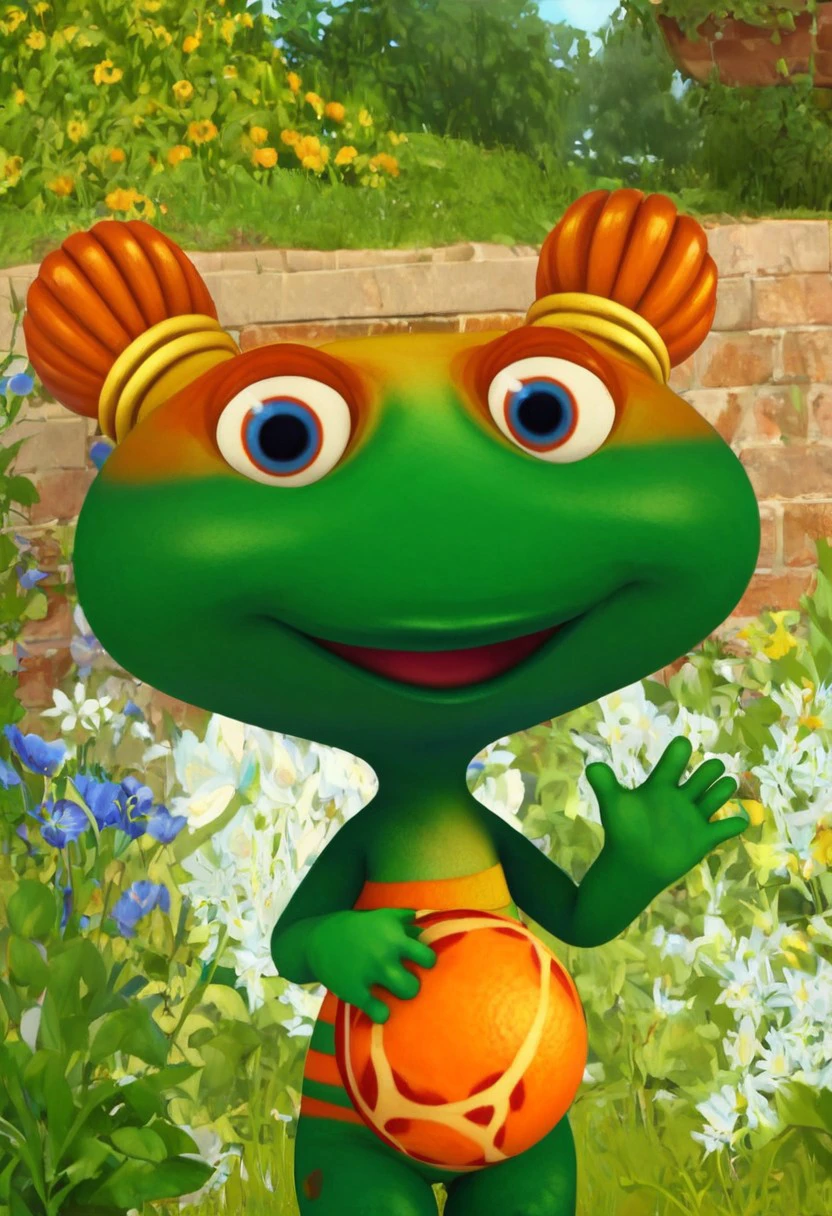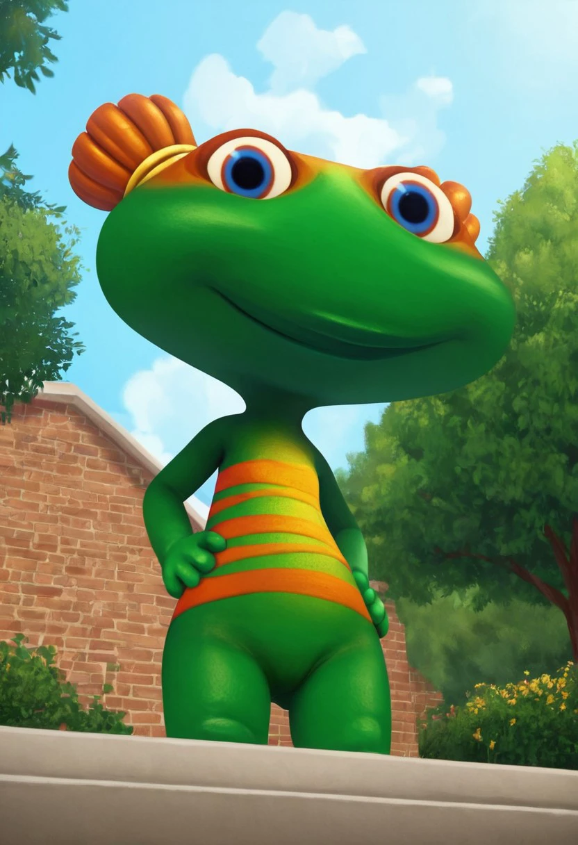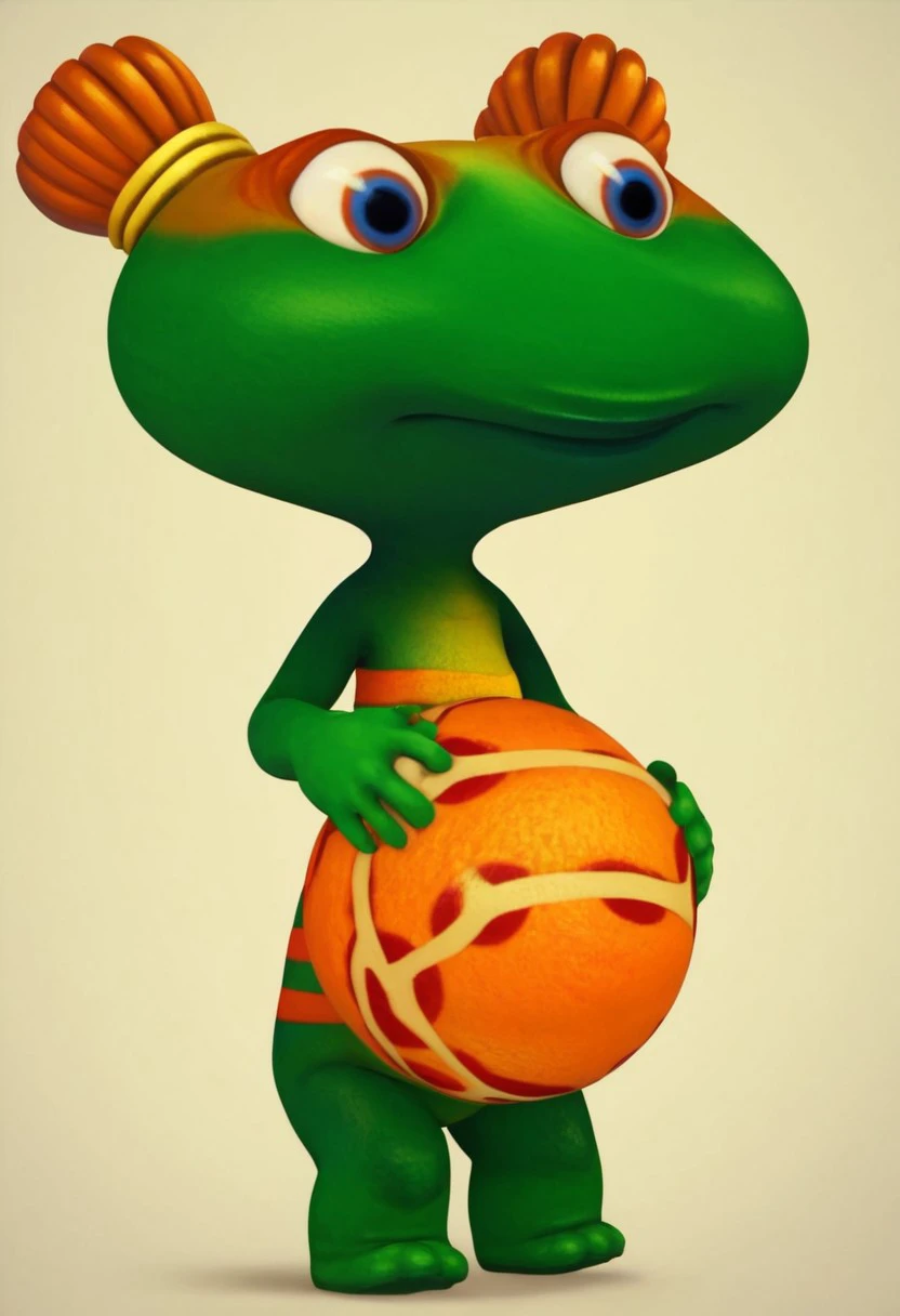 lulu zipadoo, 1girl, furry, anthro, female turtle (frog shaped head), green skin, blue eyes, orange eyelid, orange hair, yellow hair ties, pigtails, wide head, chibi, 3 oranges stripes around belly, plump, little tail, wide hips, short body, short legs,