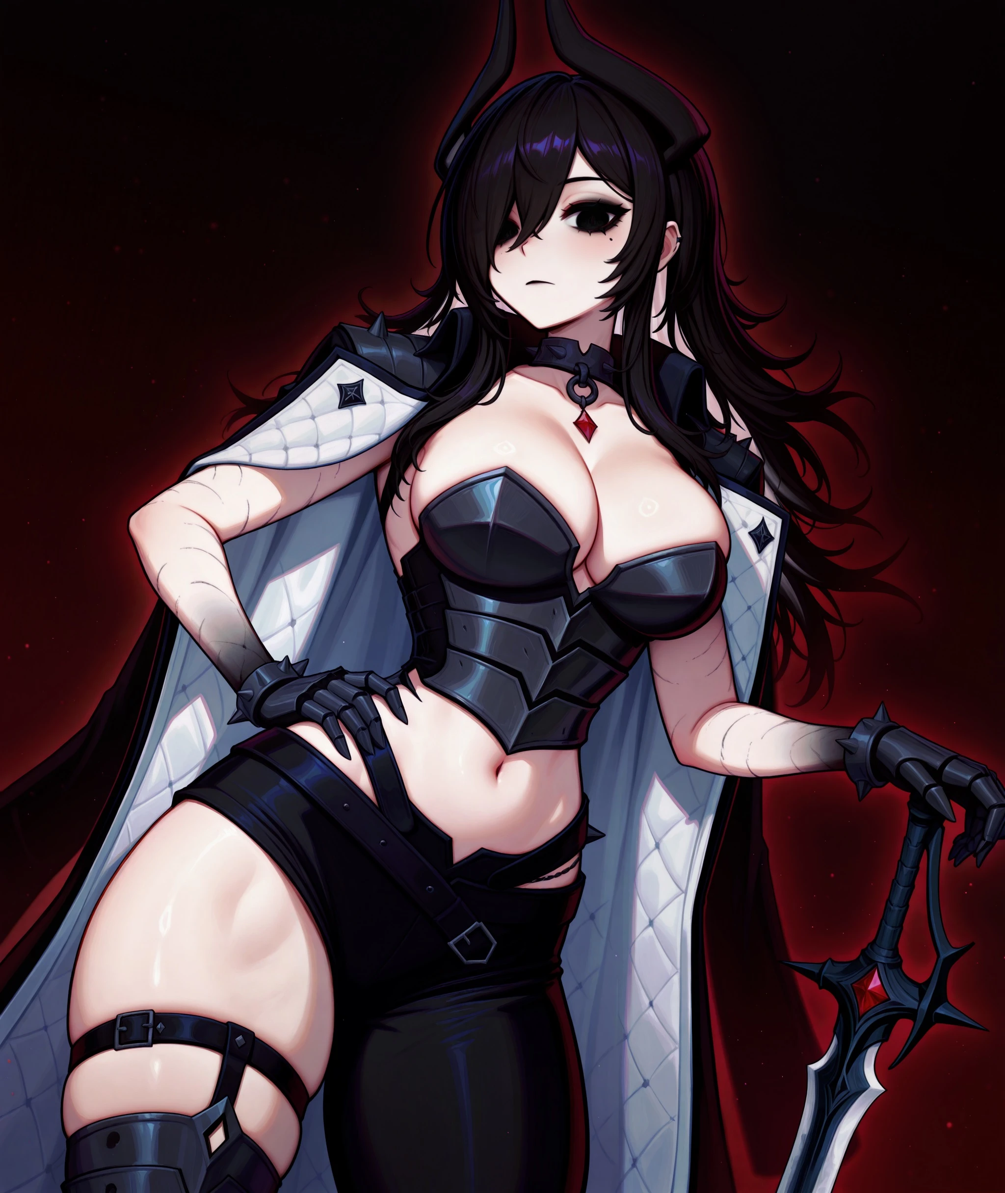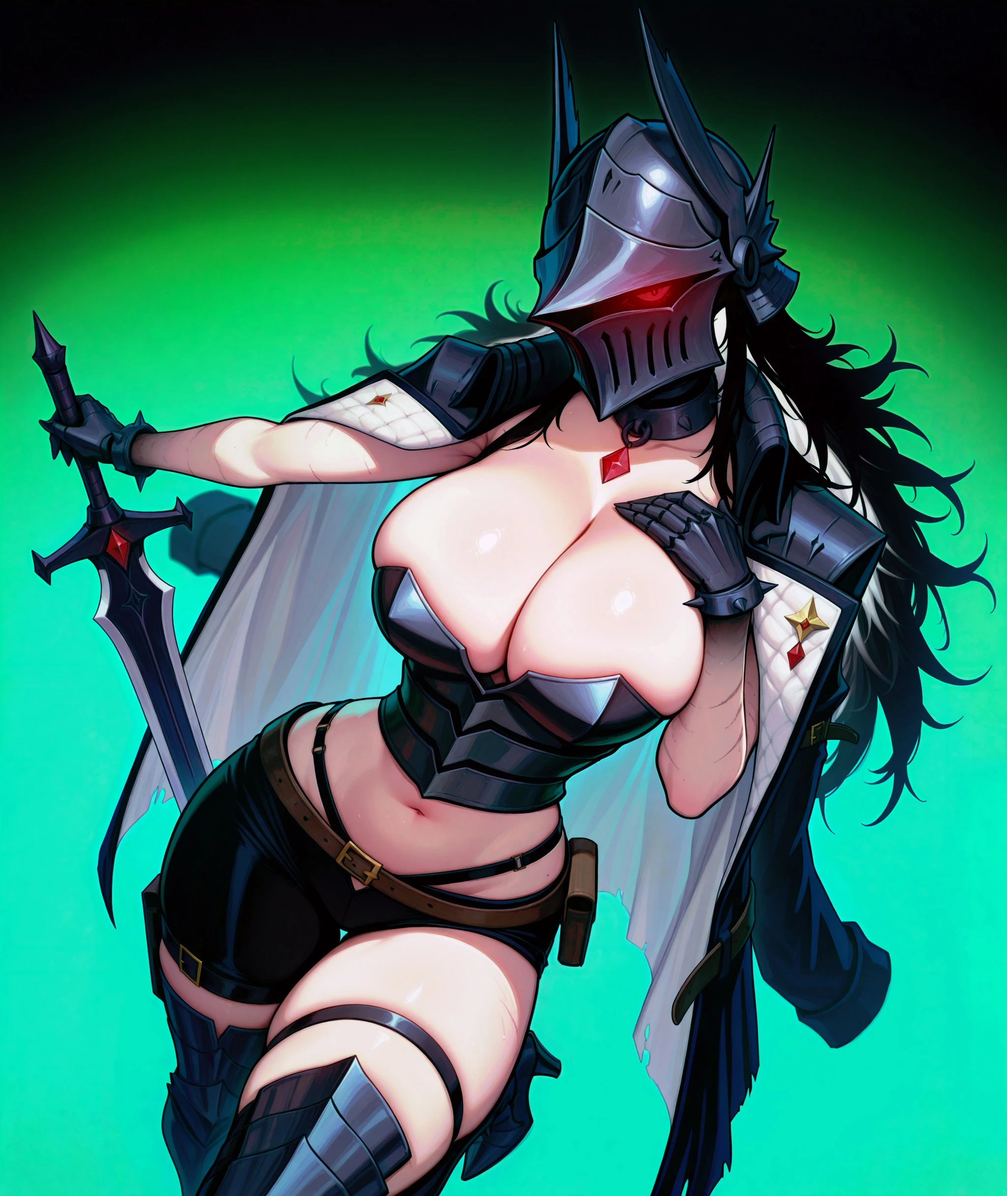 Remove all face/head-related tags (e.g. horns, black eyes, etc) and add red eye, black helmet, armor helmet to the positive prompt