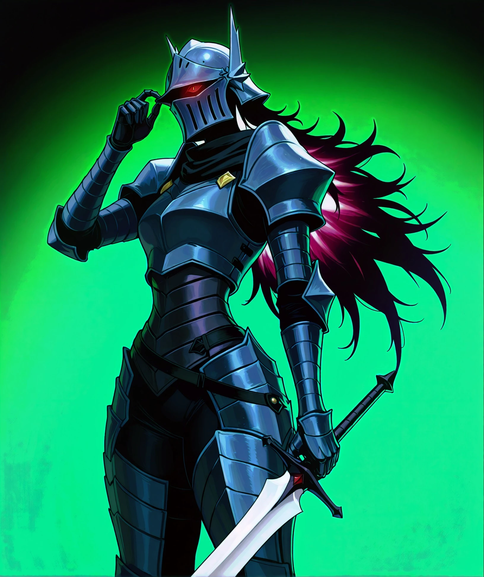 knight, full armor, black armor, narrow waist, pauldron, breastplate, opaque armor, metal gloves,