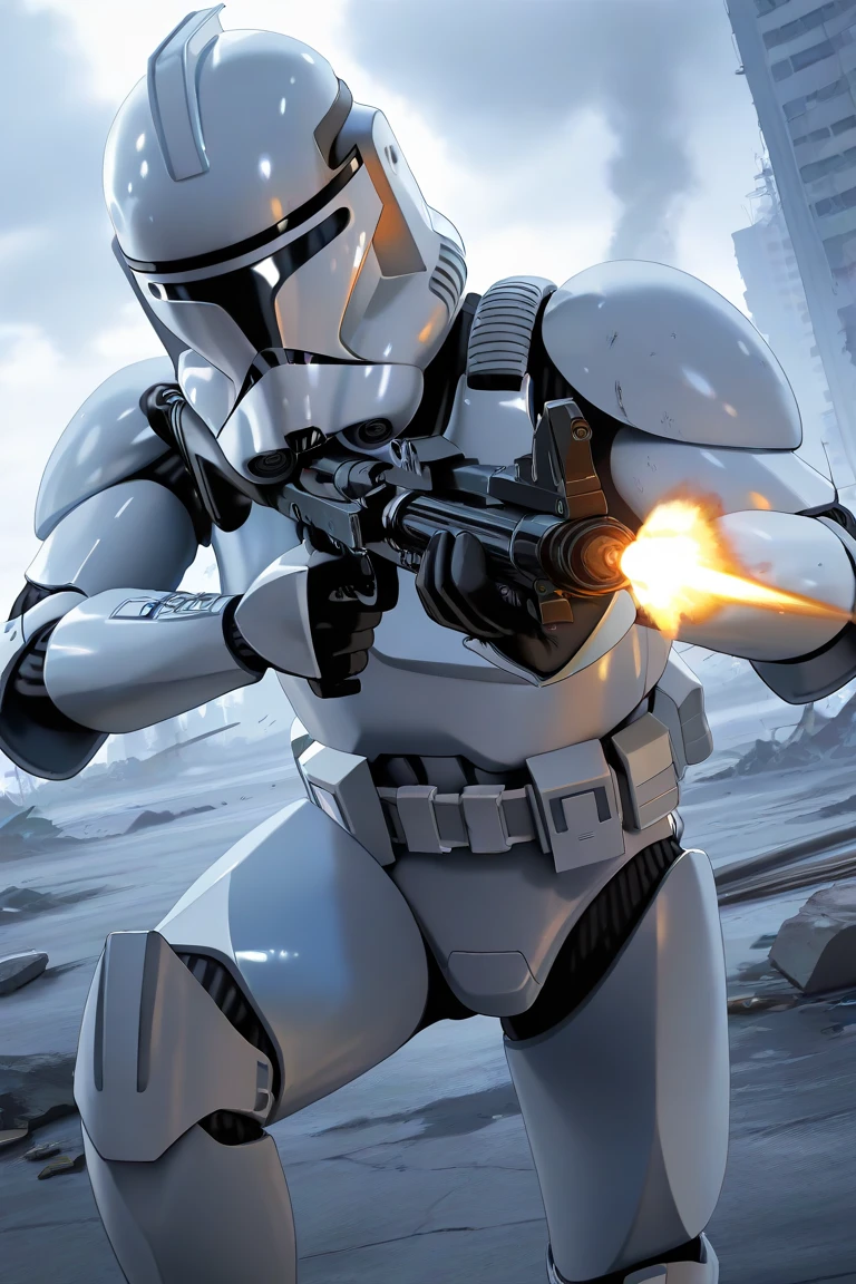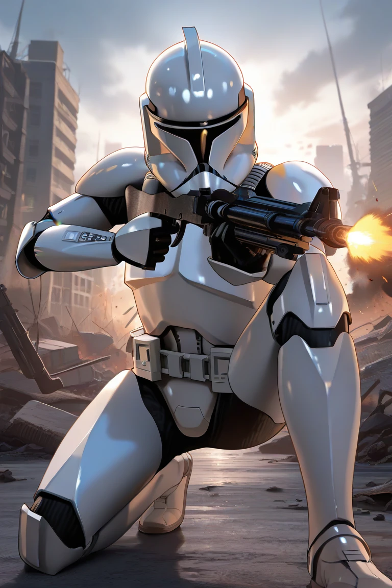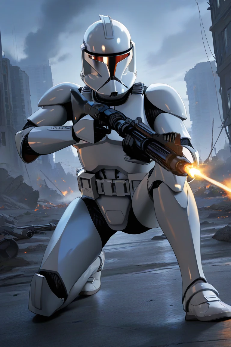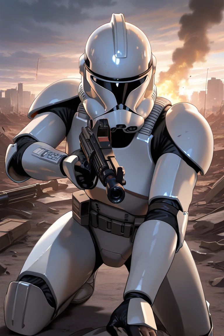 <clone trooper>, chest armor, shoulder plates, bicep armor, forearm armor, tactical gloves, tactical belt, thigh armor, knee pads, shin armor, armored boots, no standard helmet.