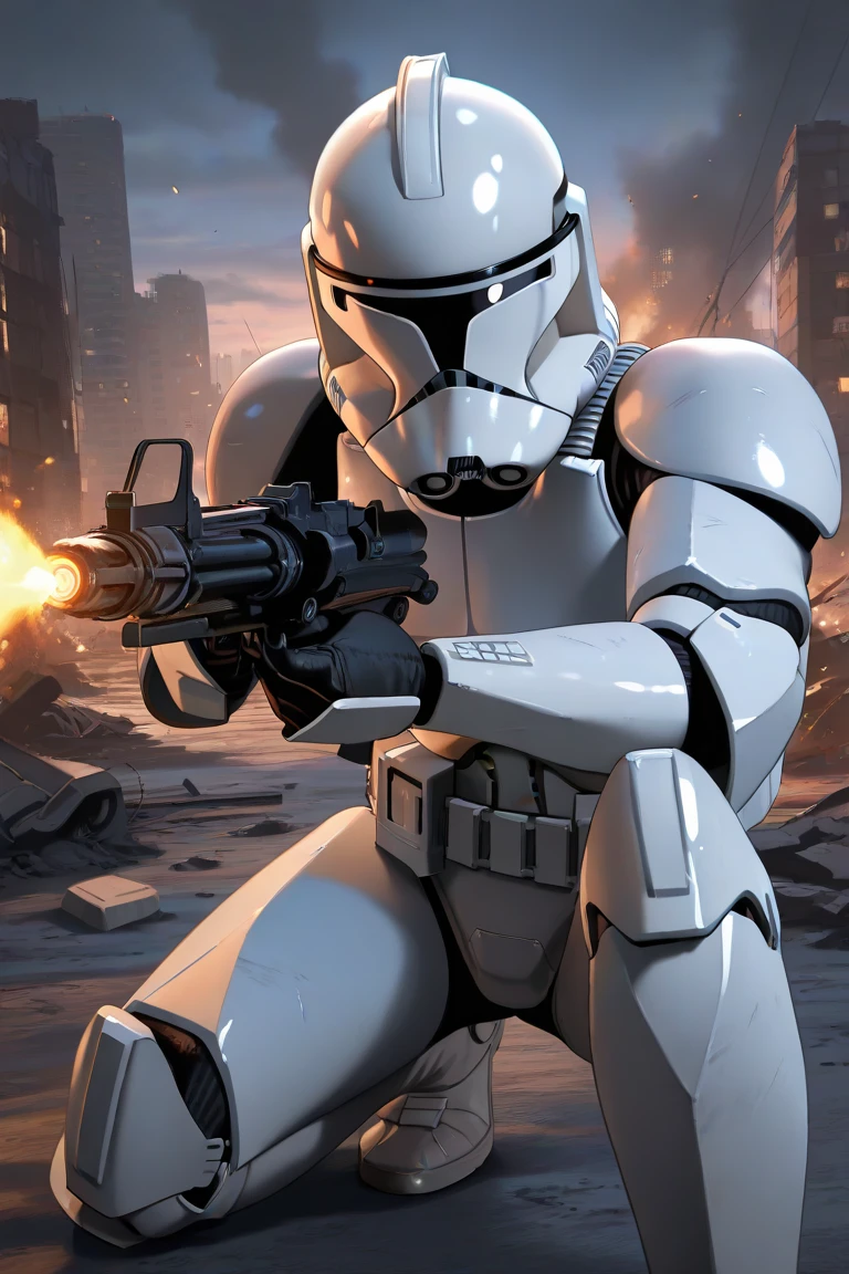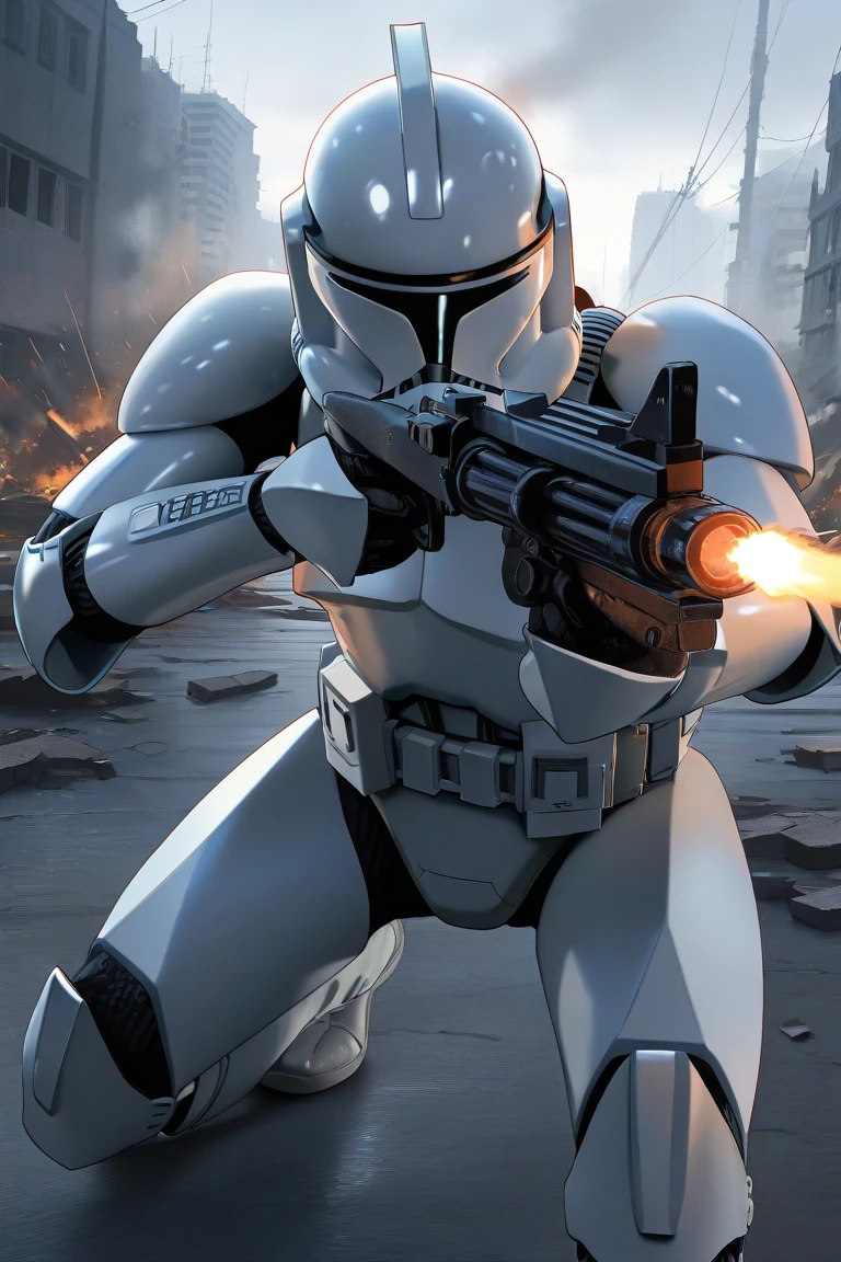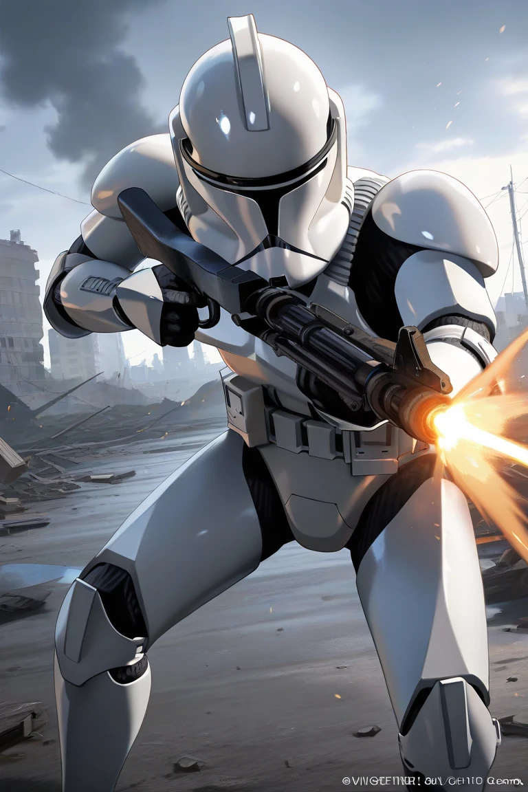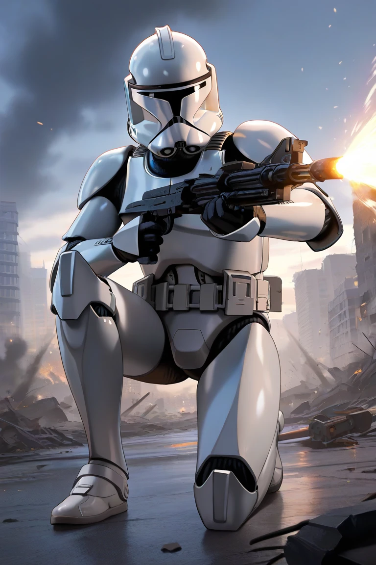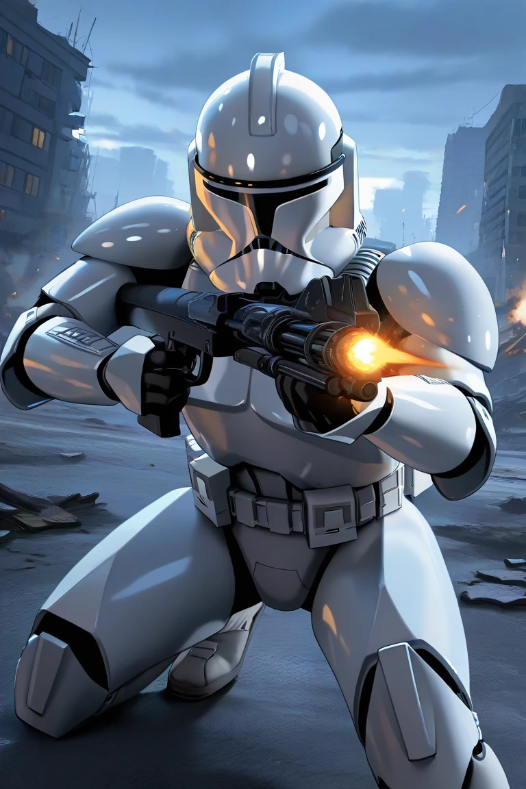 <clone trooper>, chest armor, shoulder plates, bicep armor, forearm armor, tactical gloves, tactical belt, thigh armor, knee pads, shin armor, armored boots, no standard helmet.