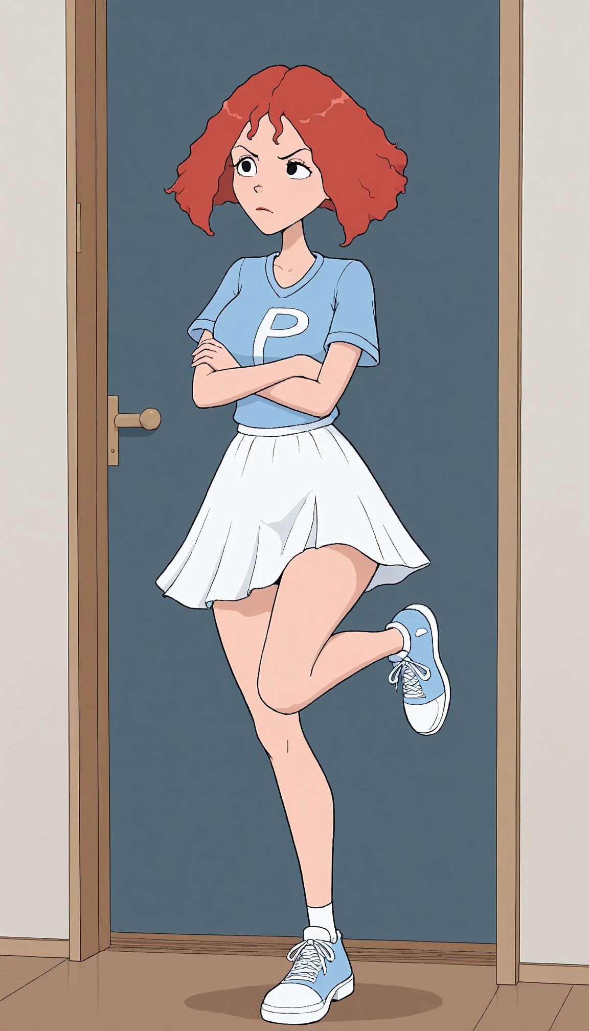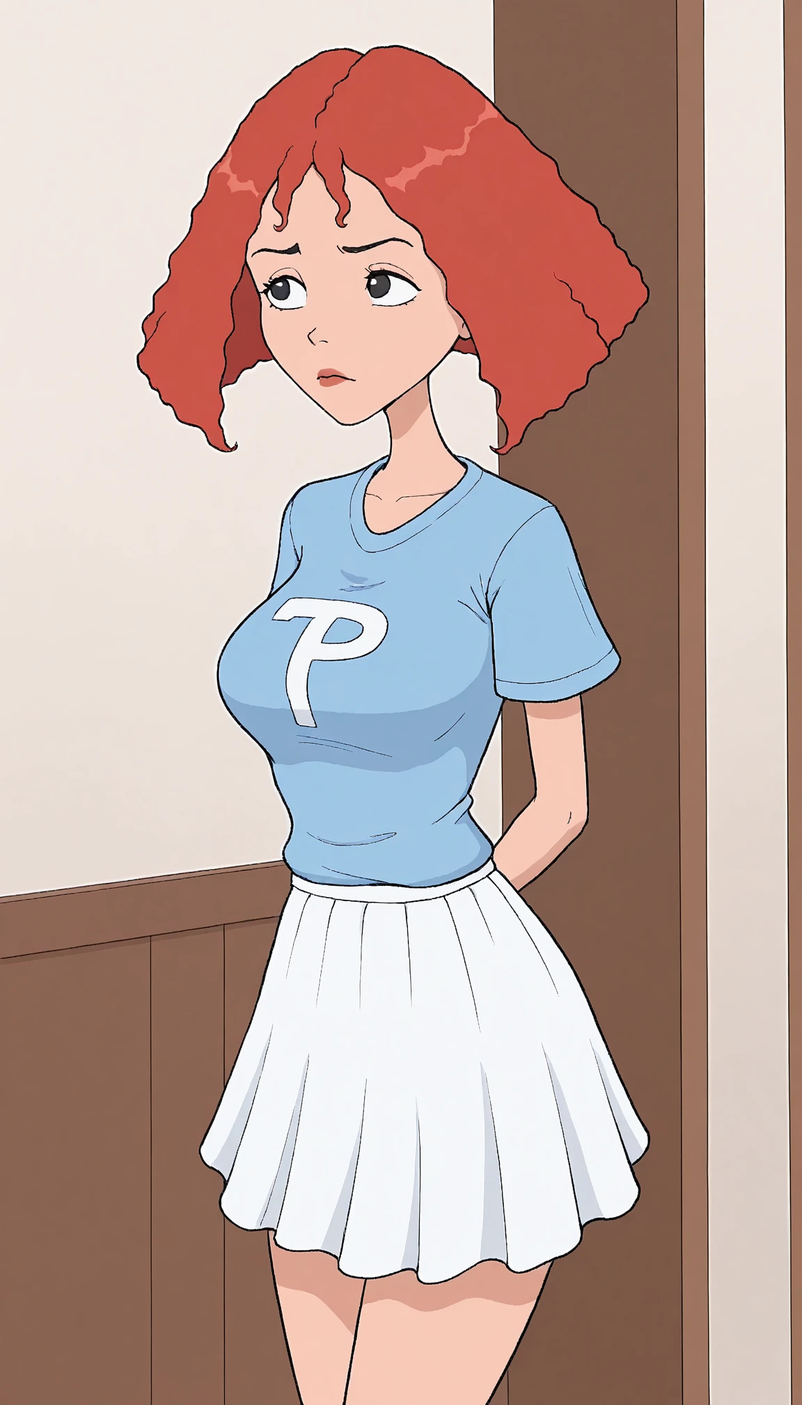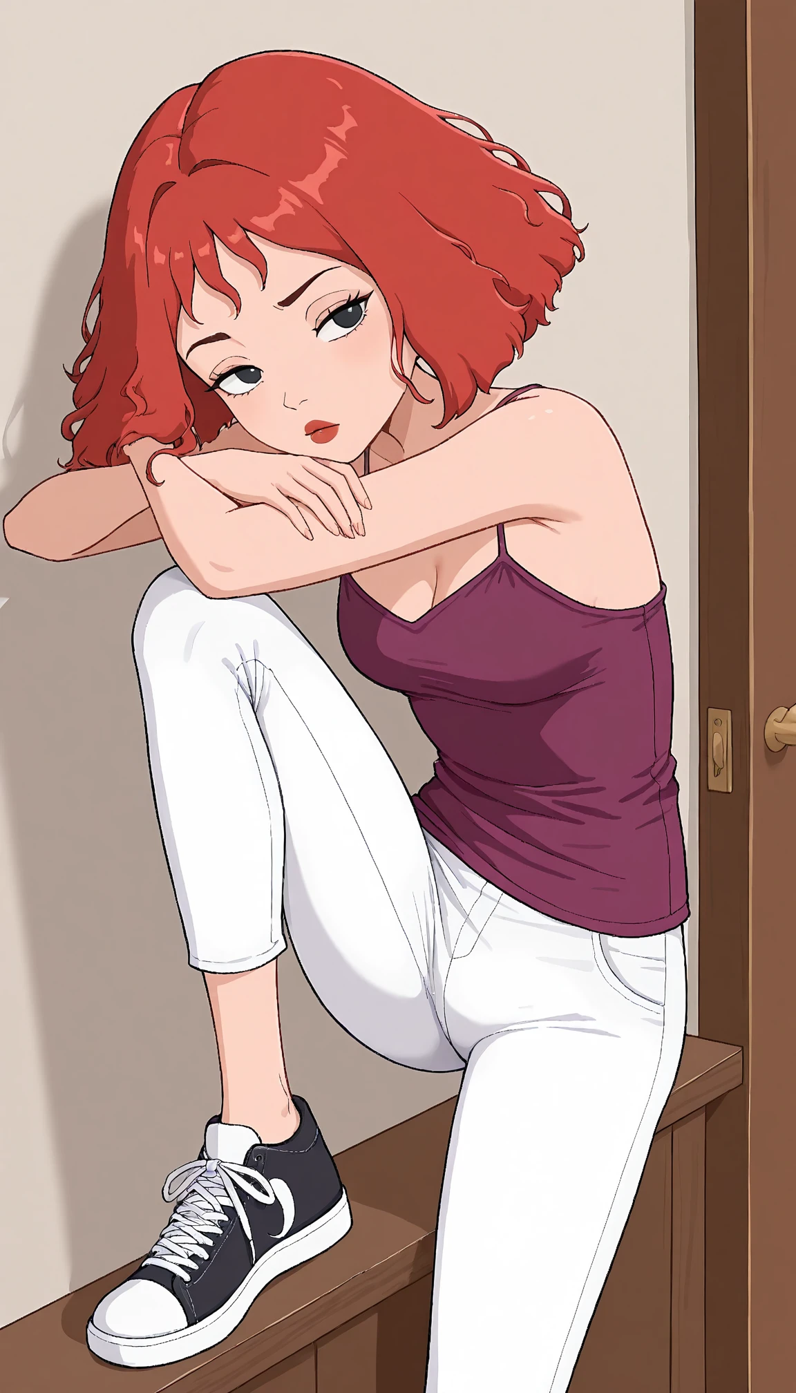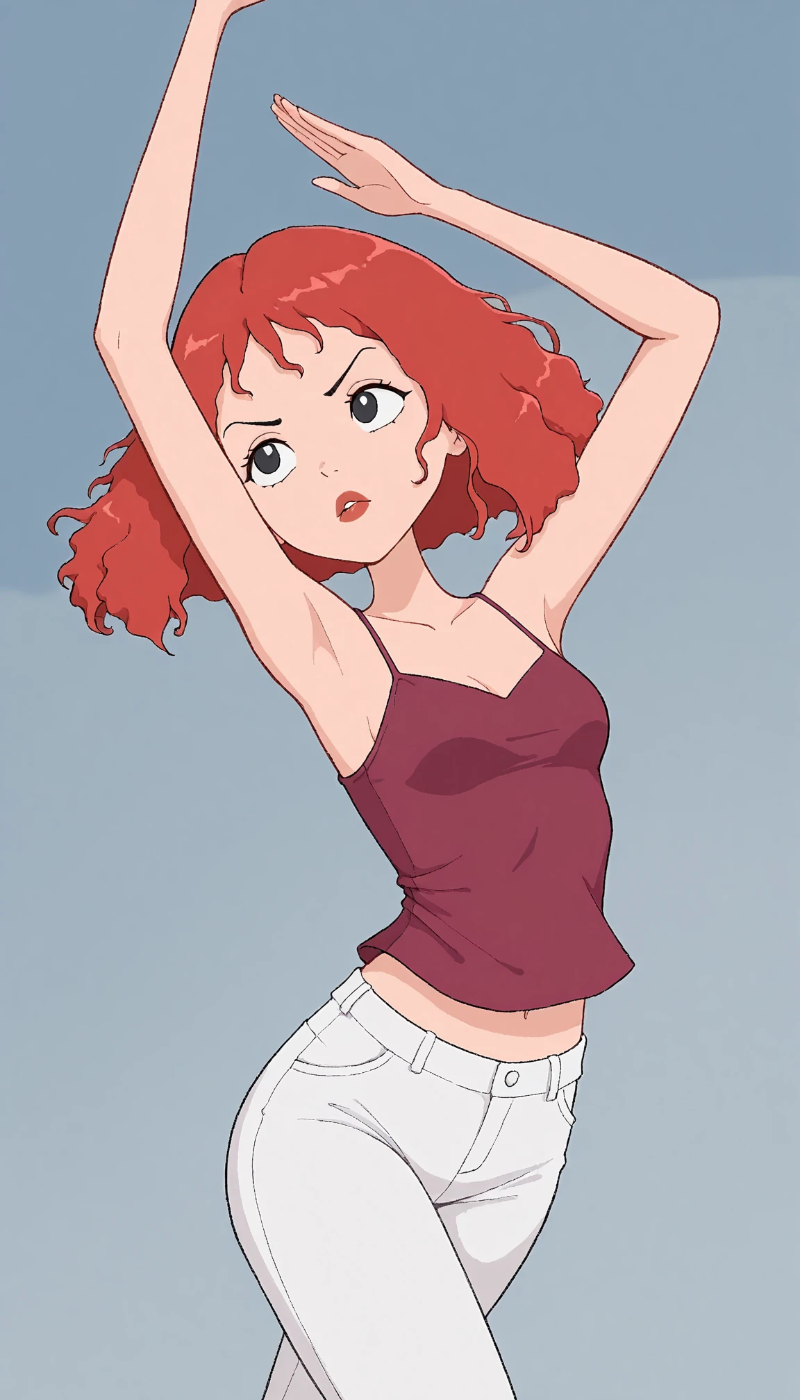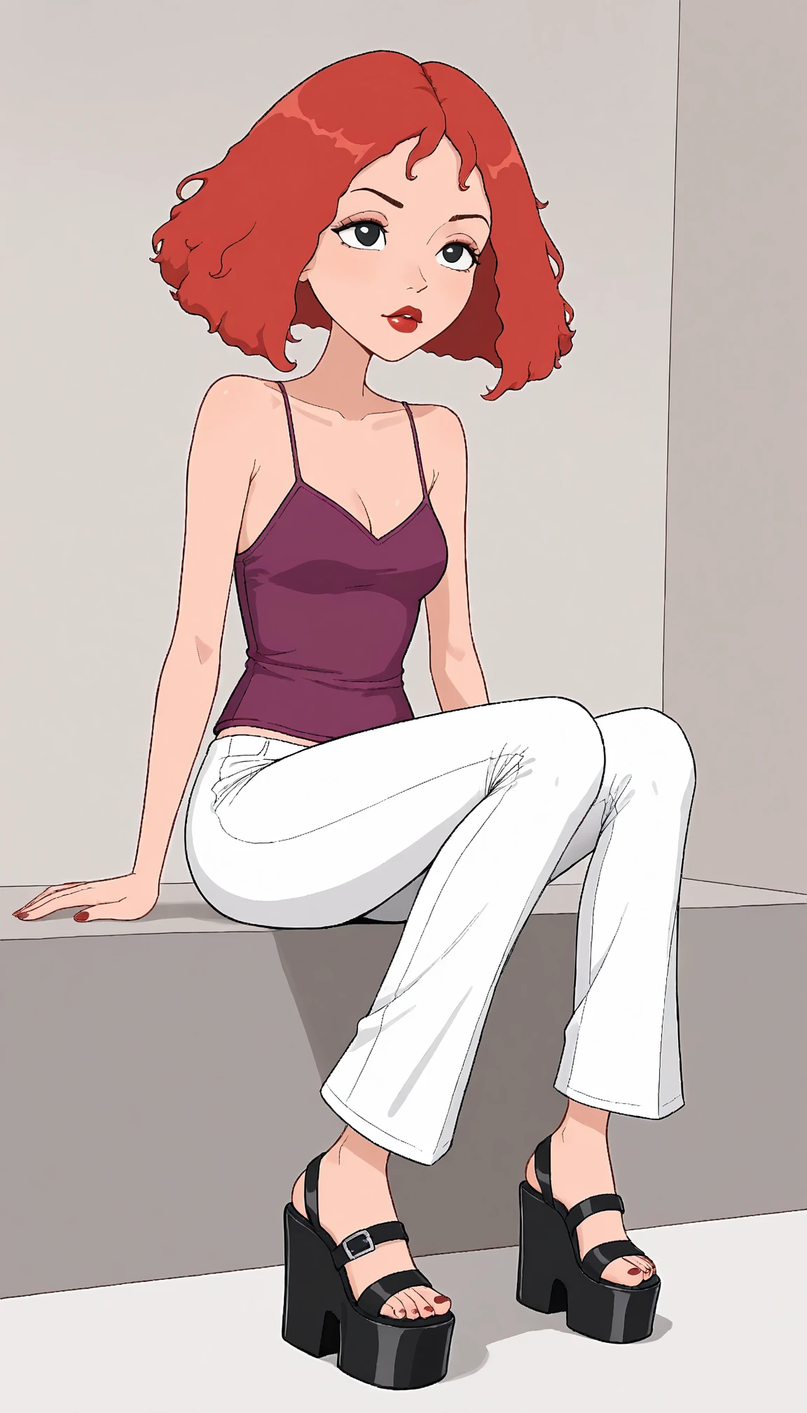 Useful tags are: parody, purple shirt and spaghetti strip for the camisole she's wearing, black eyes, red hair, and white pants.