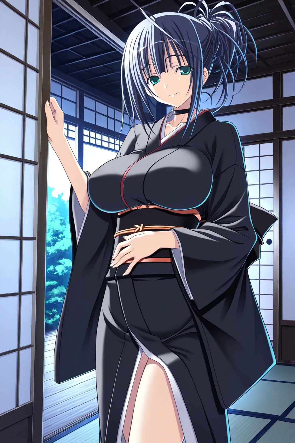 Suiren_Nukenin,Game Style,Early 2000s style,navy blue hair,long hair,Straight hair,Teal eyes,Big Breasts,slim,Woman,maternal,
