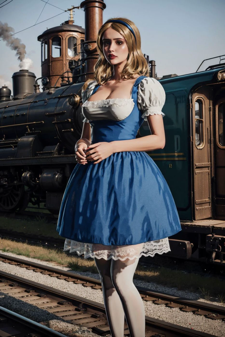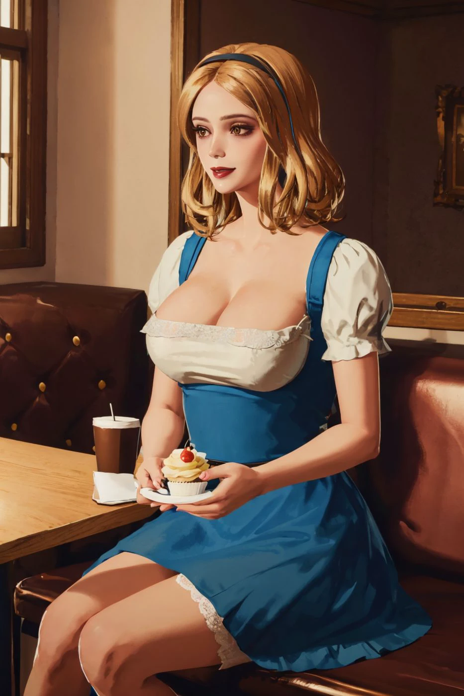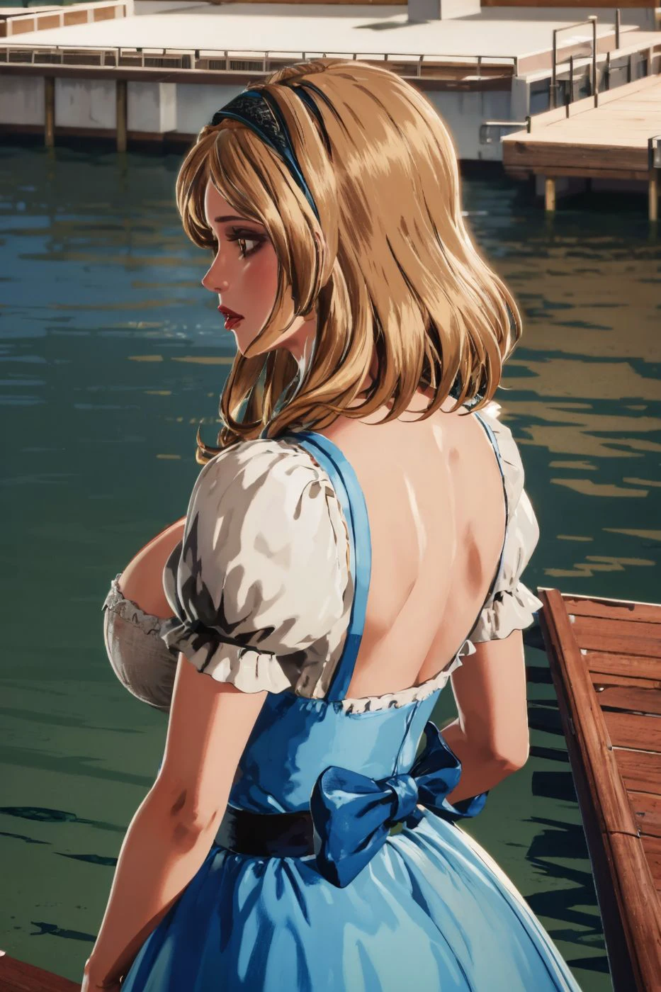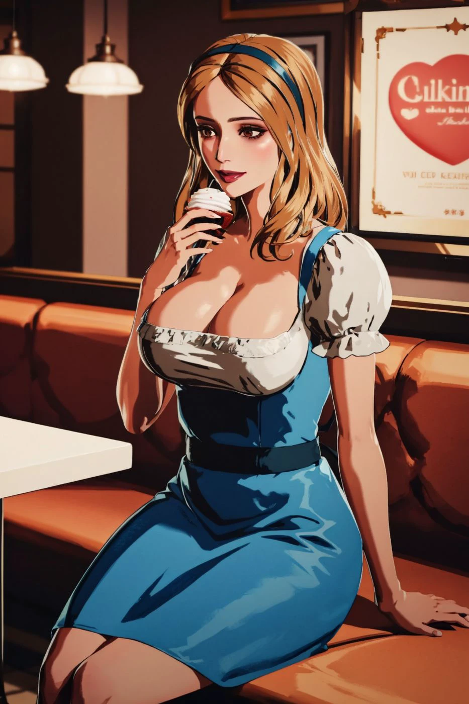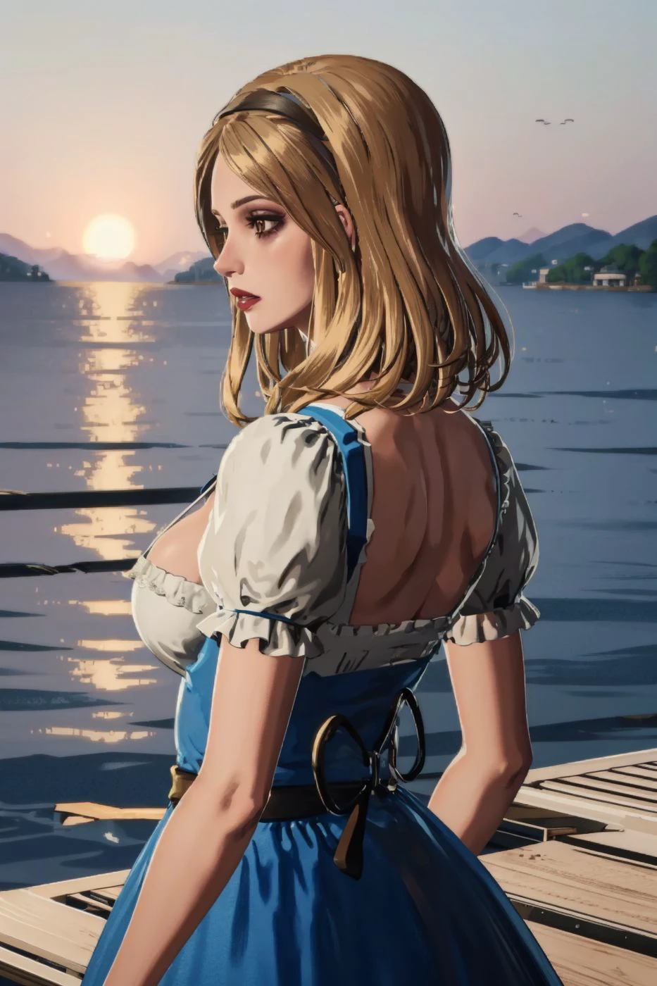 alicekiller, blonde, black thin hairband, big breasts, blue strapped dress, white blouse, short puffy sleeves, white stockings, red lips