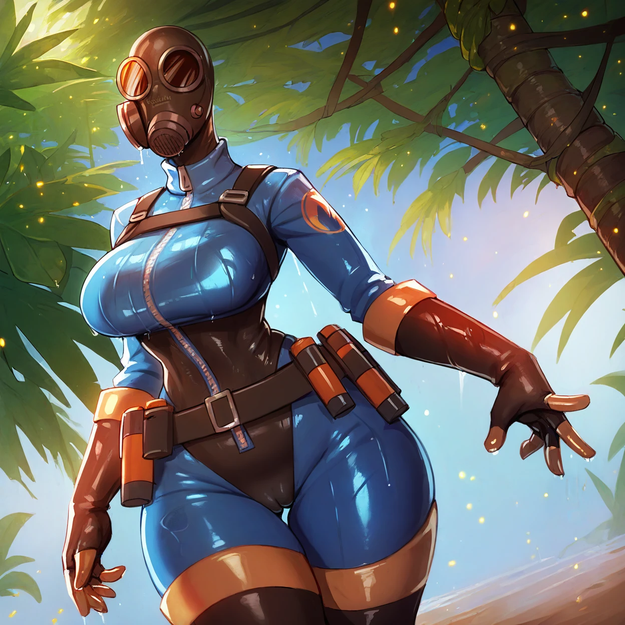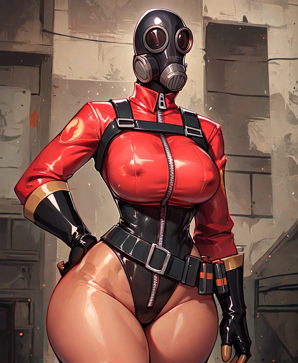 gas mask, helmet, black leotard, red breasts, shoulder straps, gloves, thigh boots, belt pouch, zipper, red sleeves, red bodysuit, cylinder tank on back