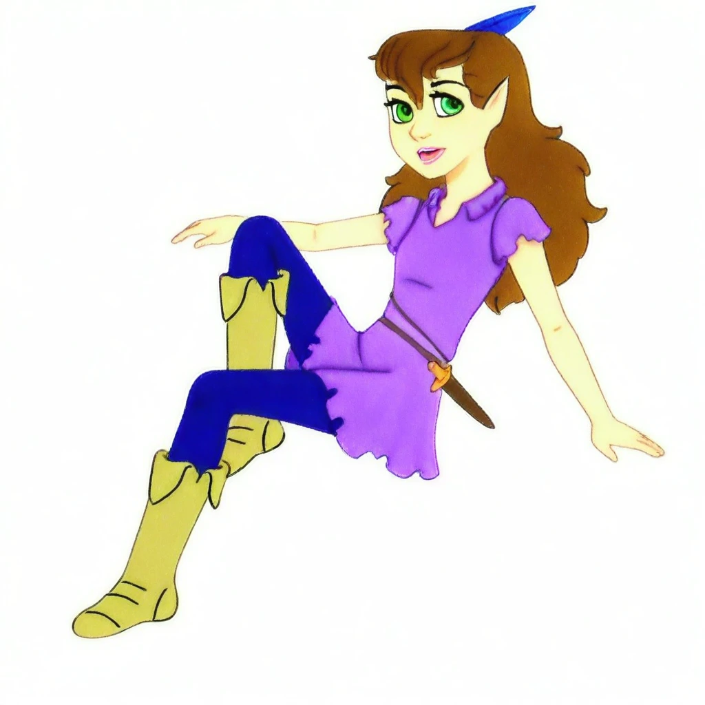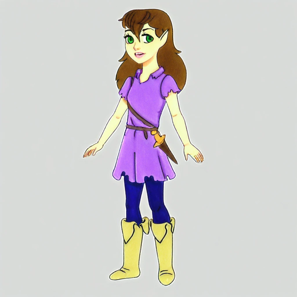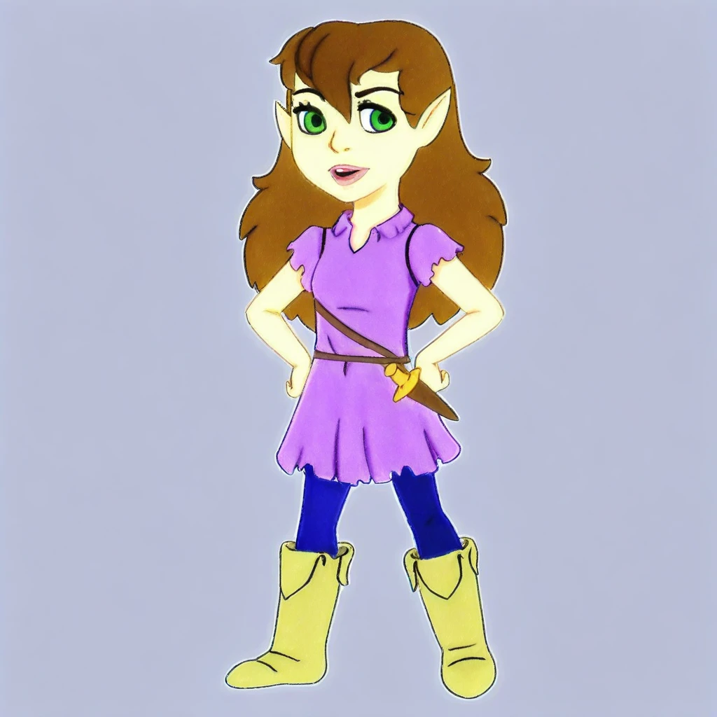 Sara Swift. 1girl,solo, fair skin, brown hair, long hair, green eyes,pointed ears, slender, purple tunic, short sleeves, blue leggings ,brown belt ,yellow boots, standing, full body,