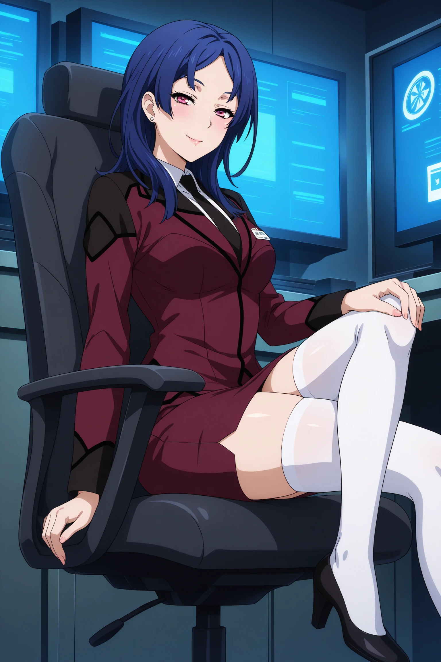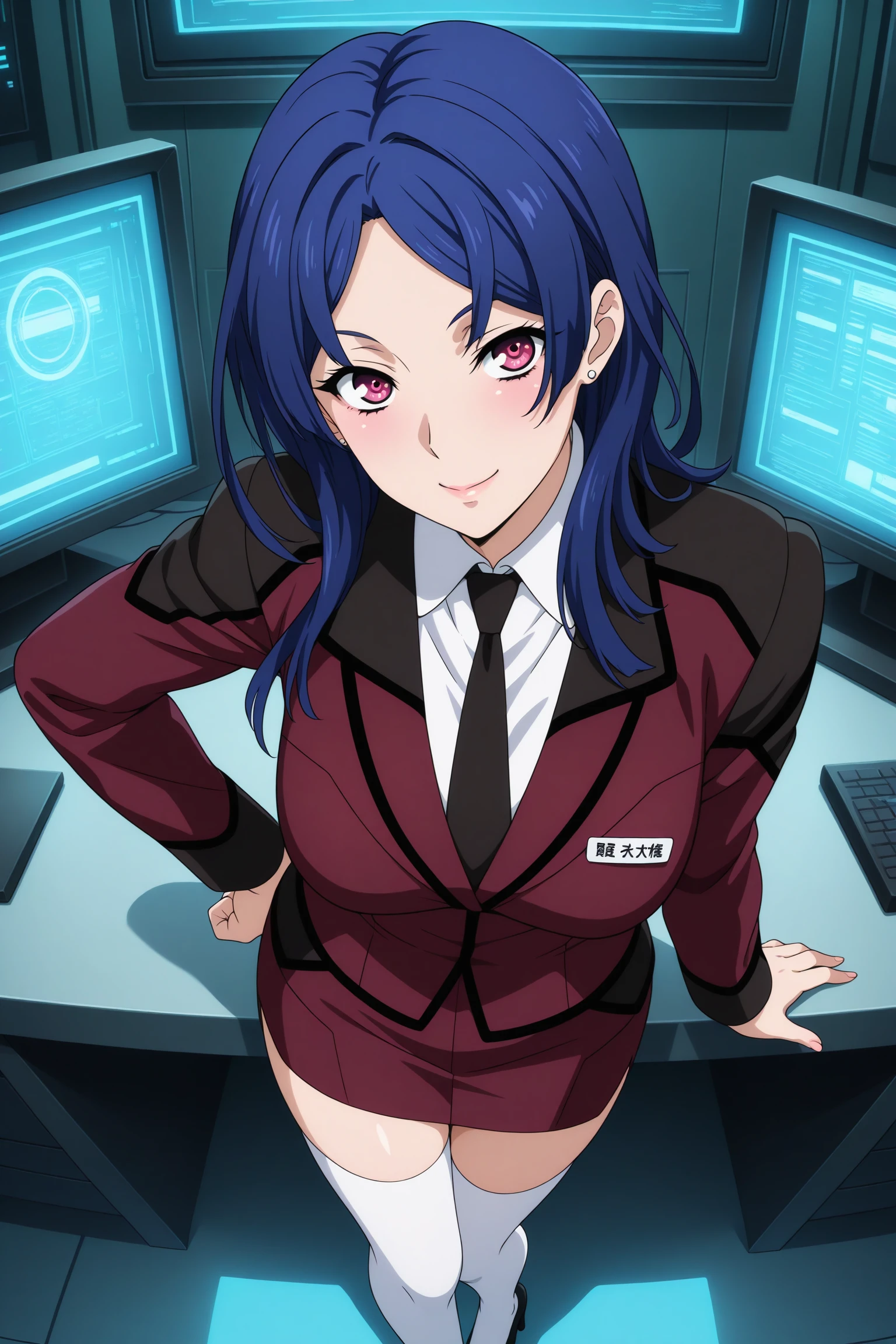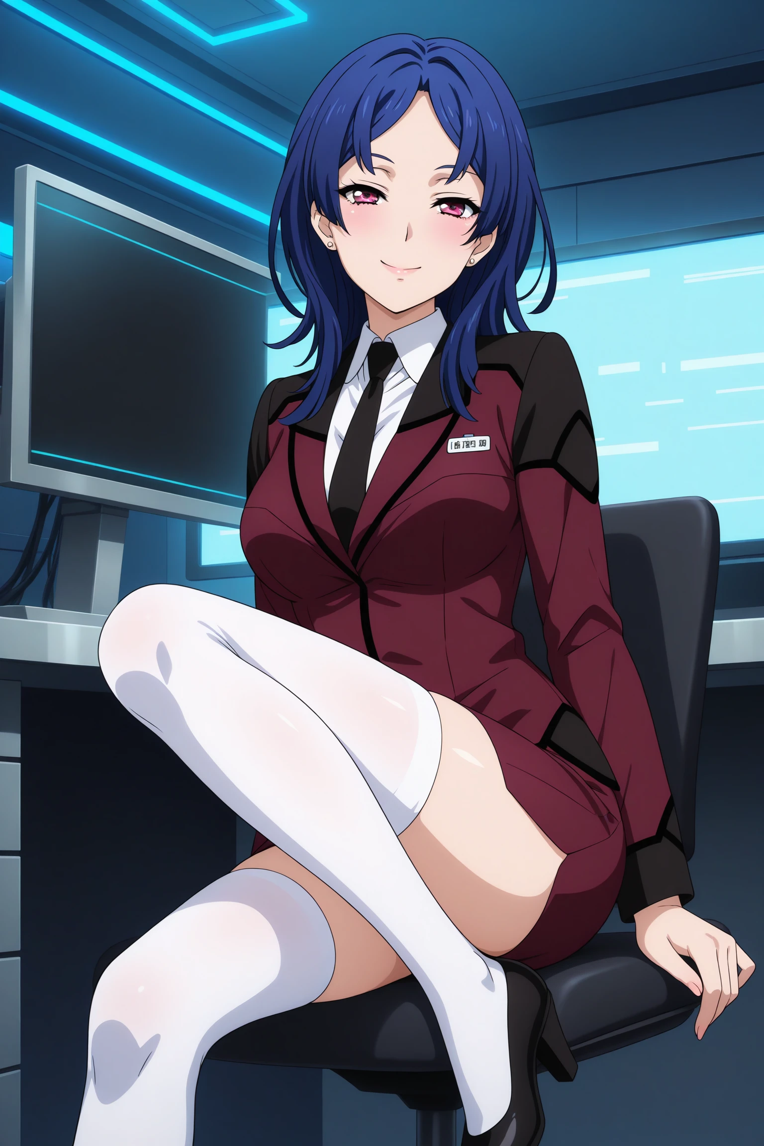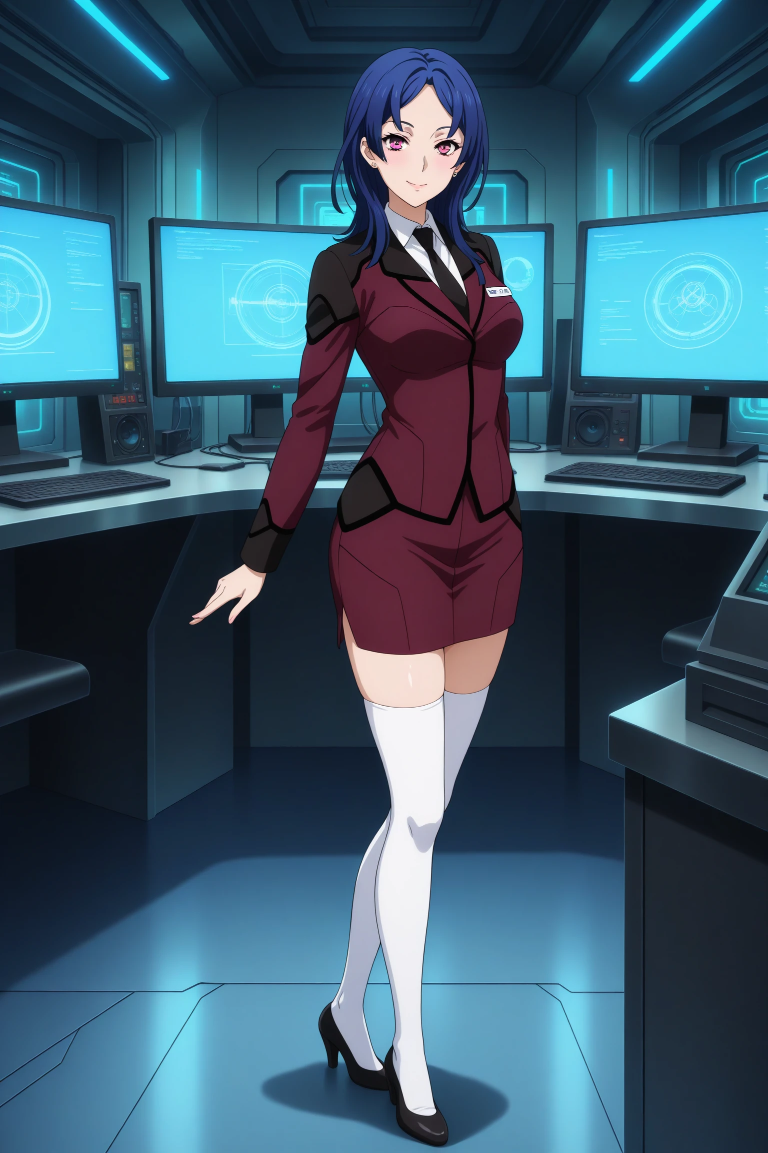 hoshimiya haruka, blue hair, long hair, parted bangs, purple eyes, earrings, uniform, suit, military uniform, white shirt, collared shirt, purple jacket, name tag, black necktie, purple skirt, pencil skirt, white thighhighs, black footwear, high heelsNOTE
