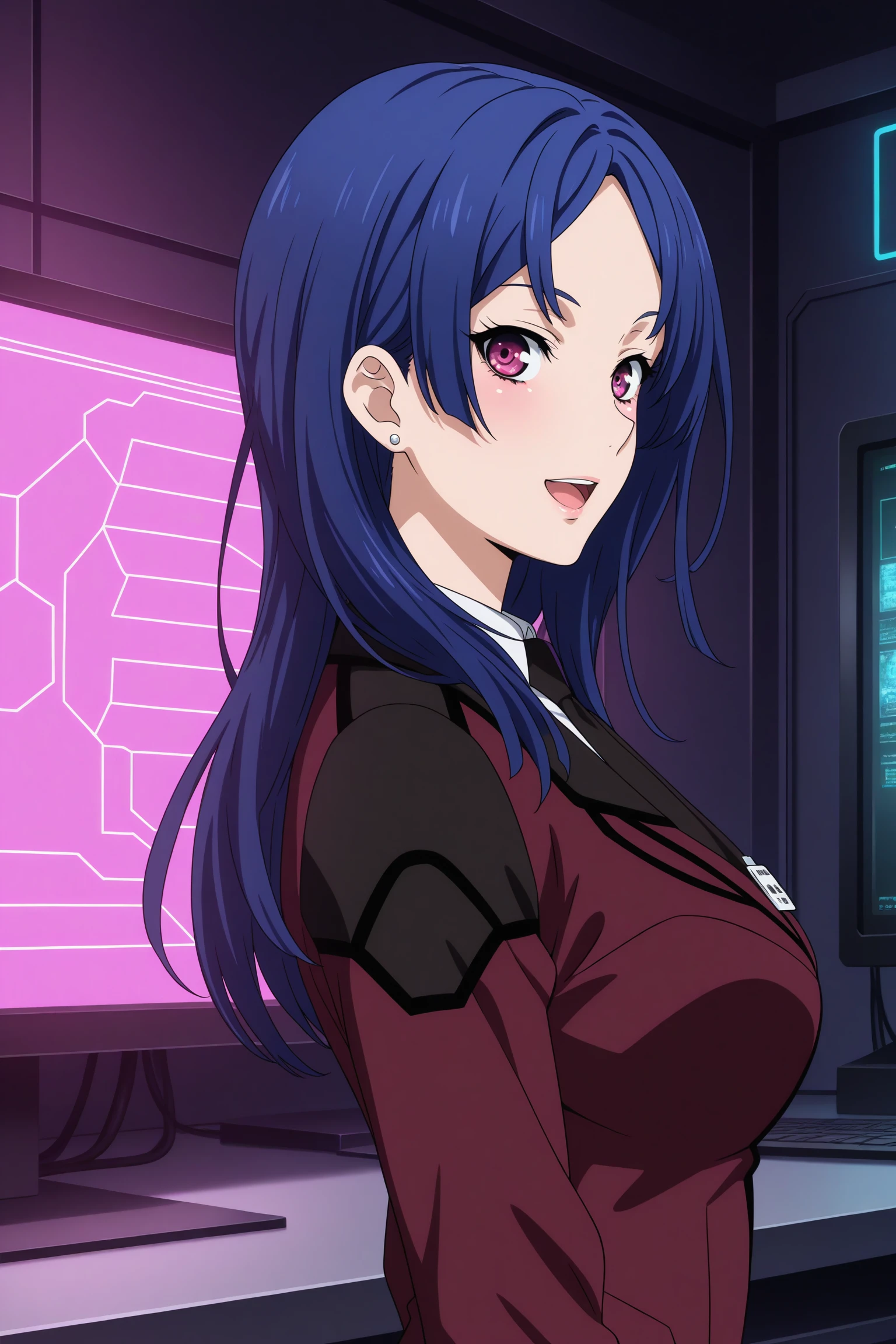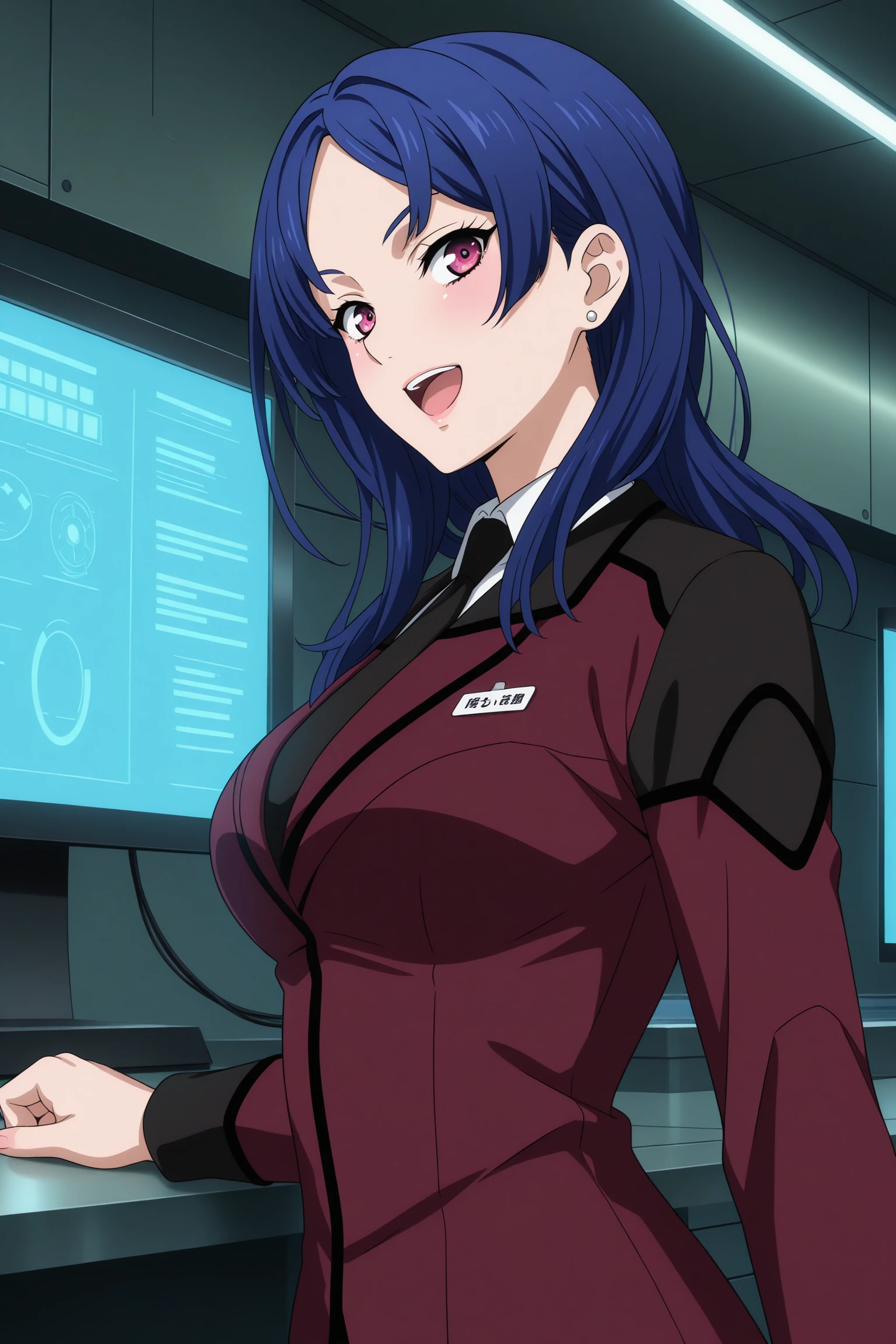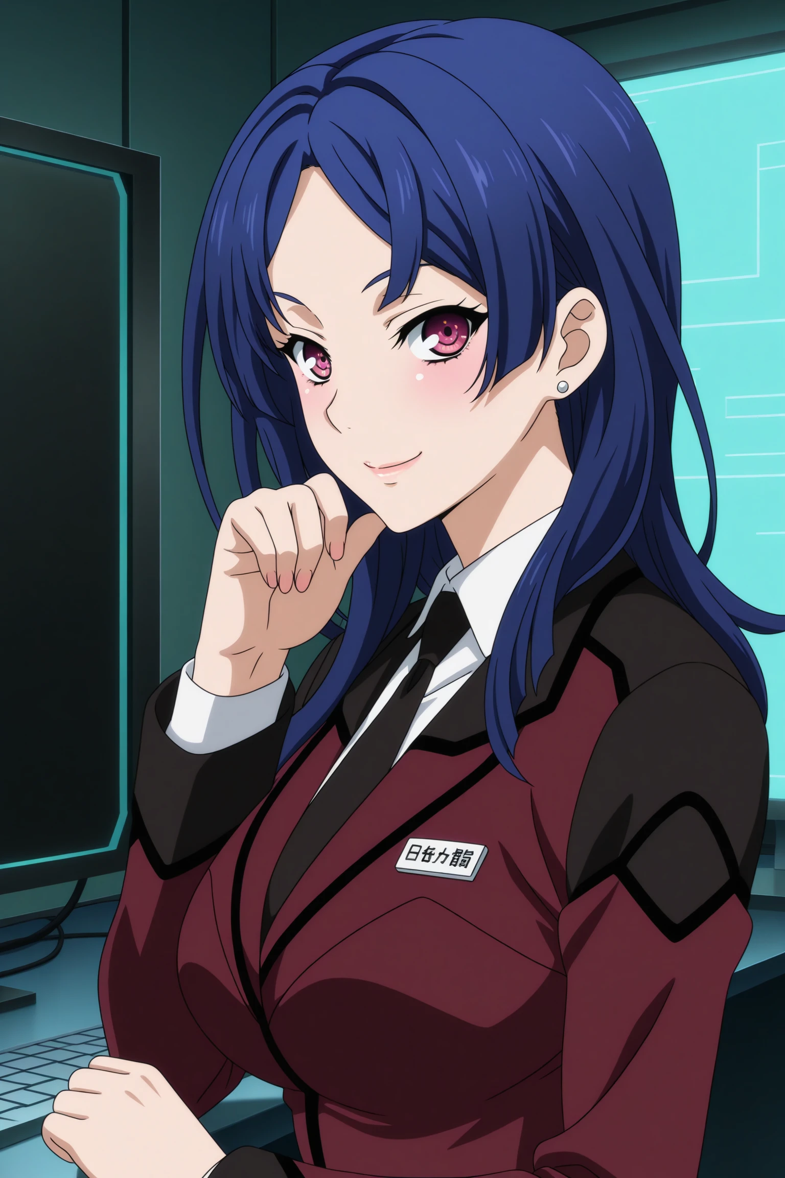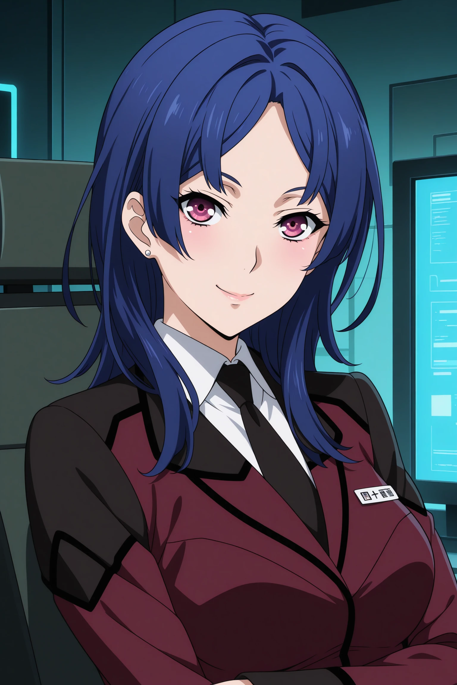 hoshimiya haruka, blue hair, long hair, parted bangs, purple eyes, earrings, uniform, suit, military uniform, white shirt, collared shirt, purple jacket, name tag, black necktie, purple skirt, pencil skirt, white thighhighs, black footwear, high heelsNOTE