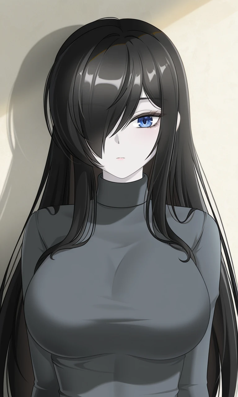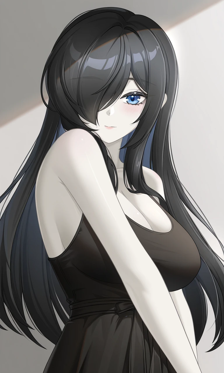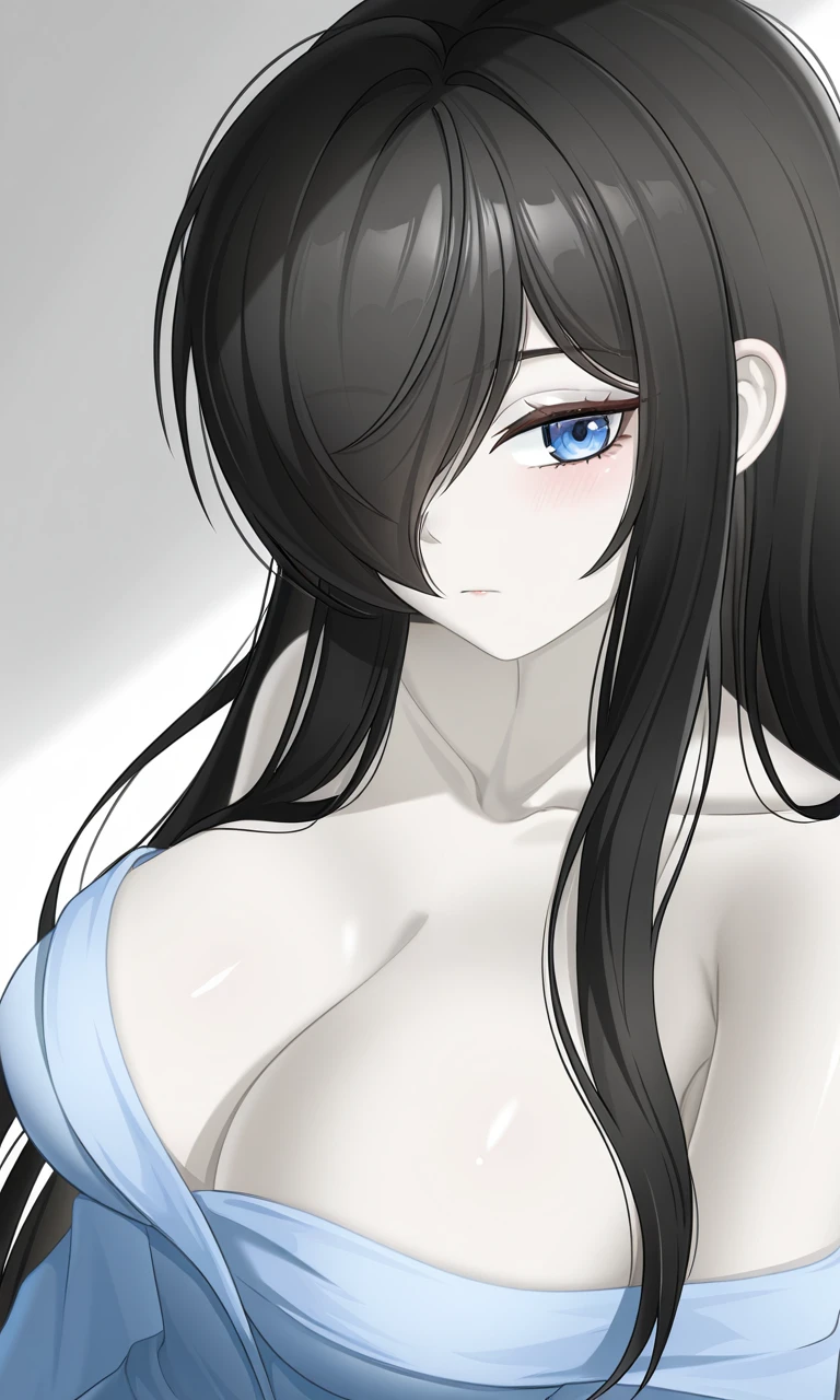 black hair, long hair, sidelocks, long bangs, swept bangs, hair over one eye, blue eyes, pale skin, large breasts