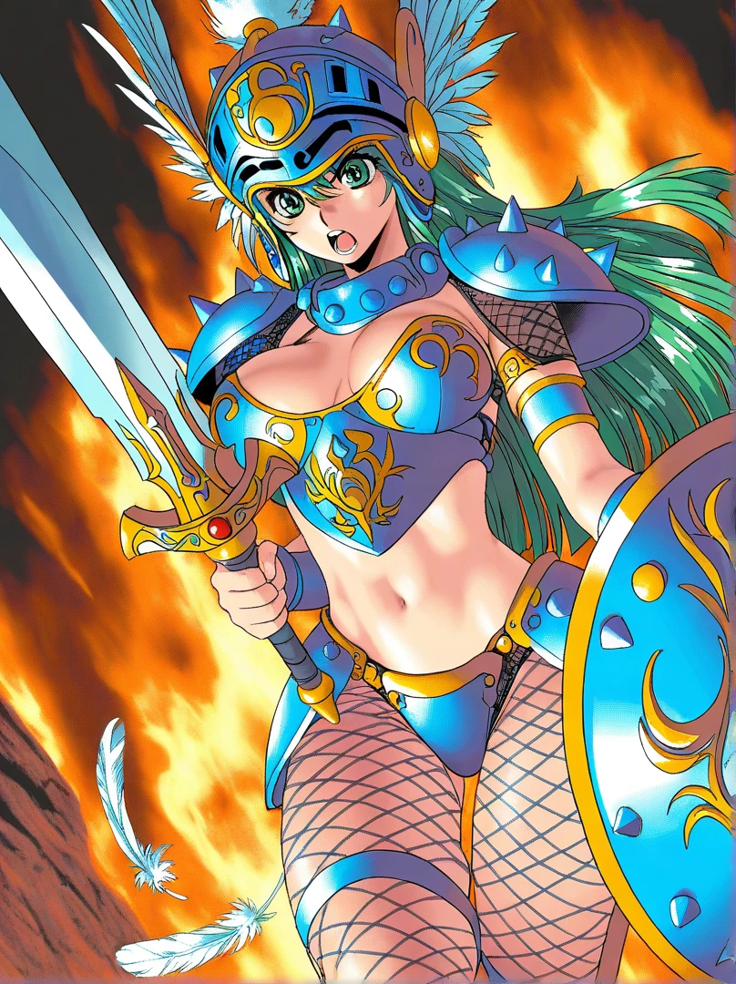winged helmet, blue armor, pauldrons, shoulder armor, feathers, fishnets, bikini armor, armlet, shoulder pads,
