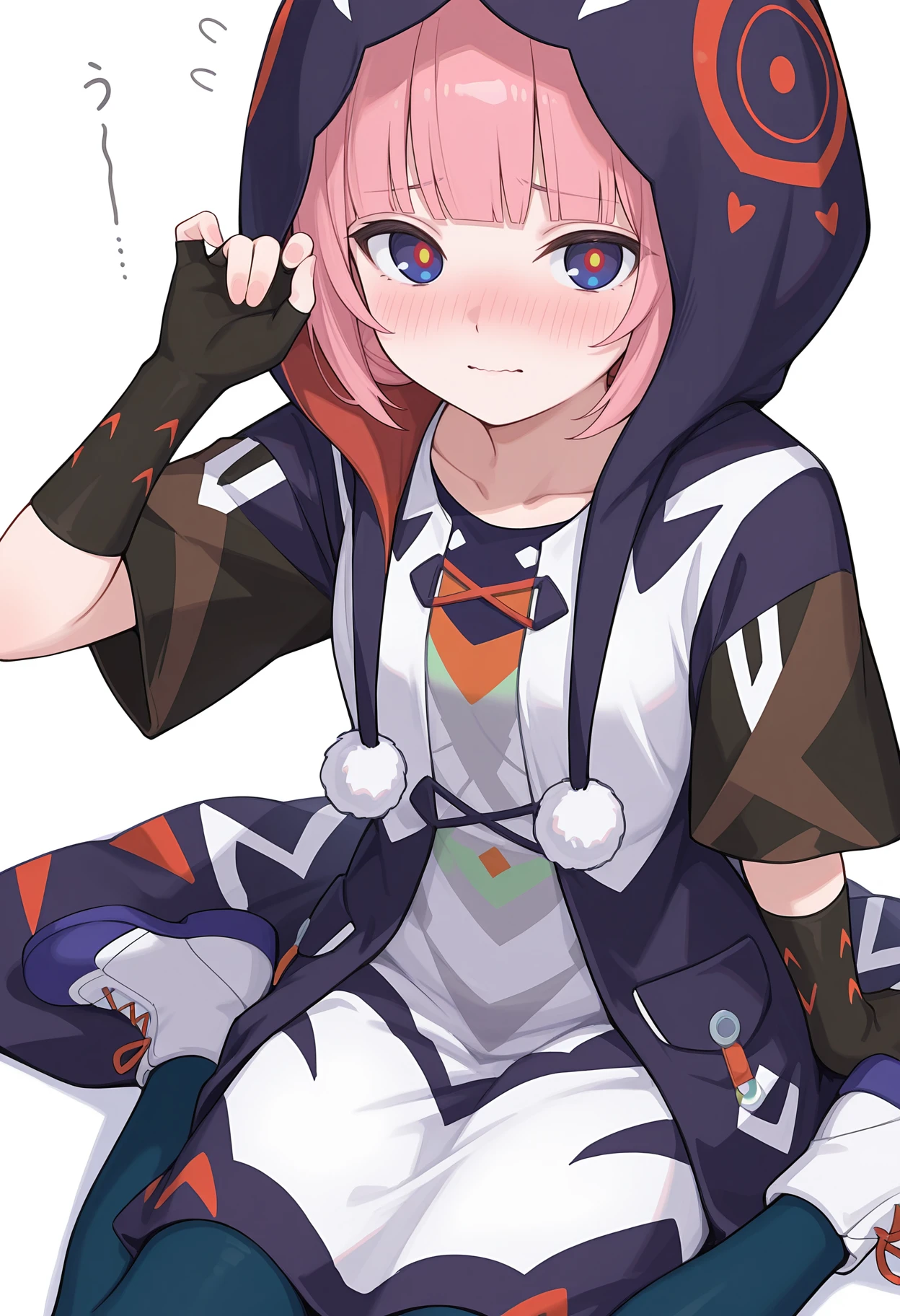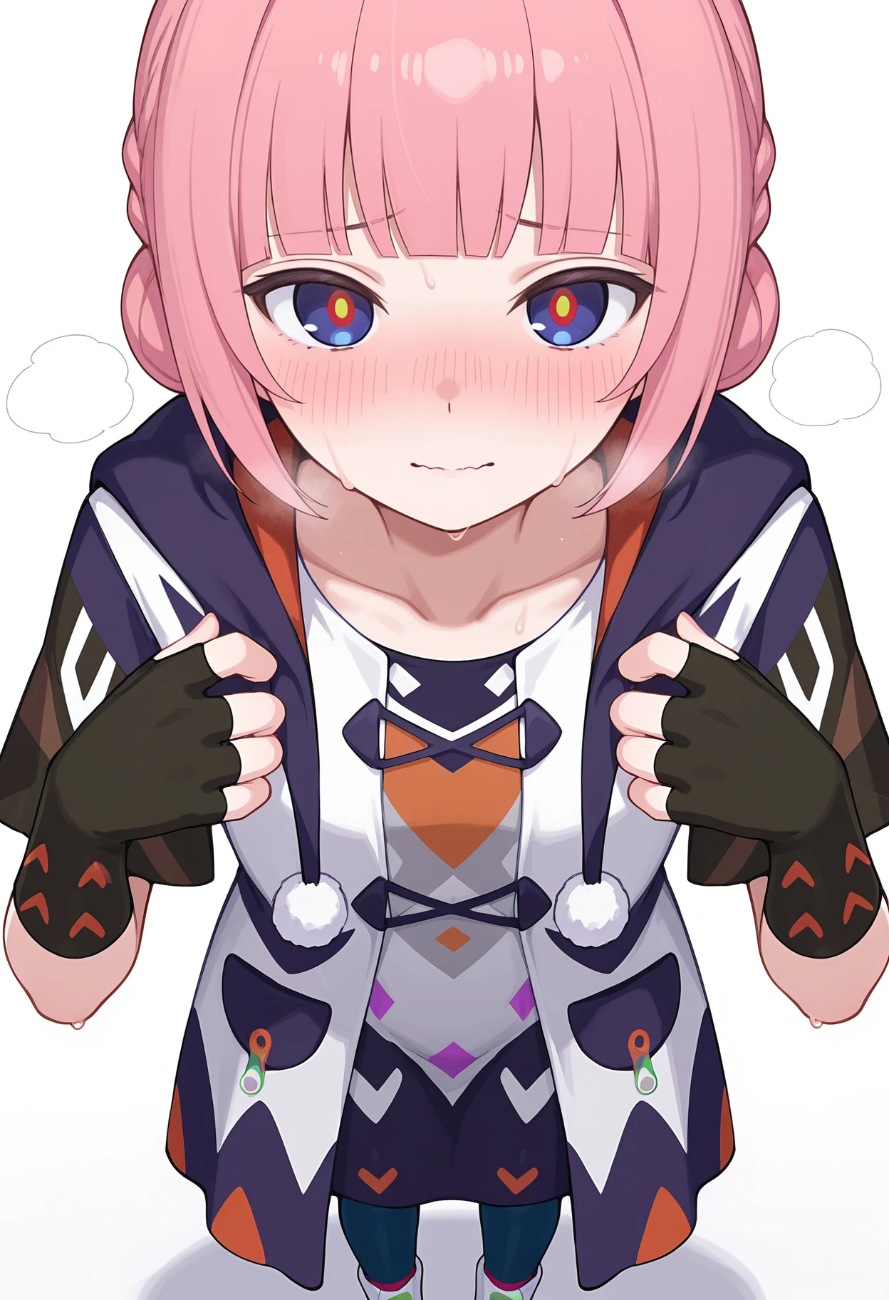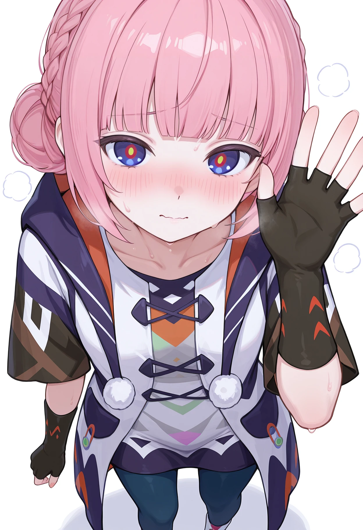 kaf (kamitsubaki_studio), multicolored eyes, pink hair, double bun, braided bun, red pupils, yellow pupils, collarbone, black gloves, fingerless gloves, detached sleeves, black leggings, multicolored coat, multicolored shirt, hooded jacket, pom pom (clothes),ankle boots,