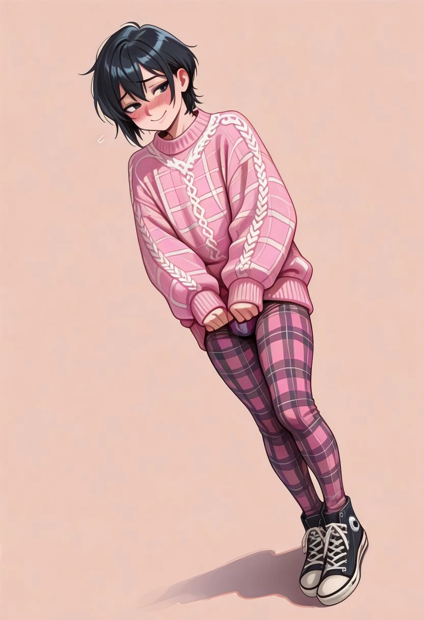 Pink outfit (plaid sweater, tartan leggings, converse)