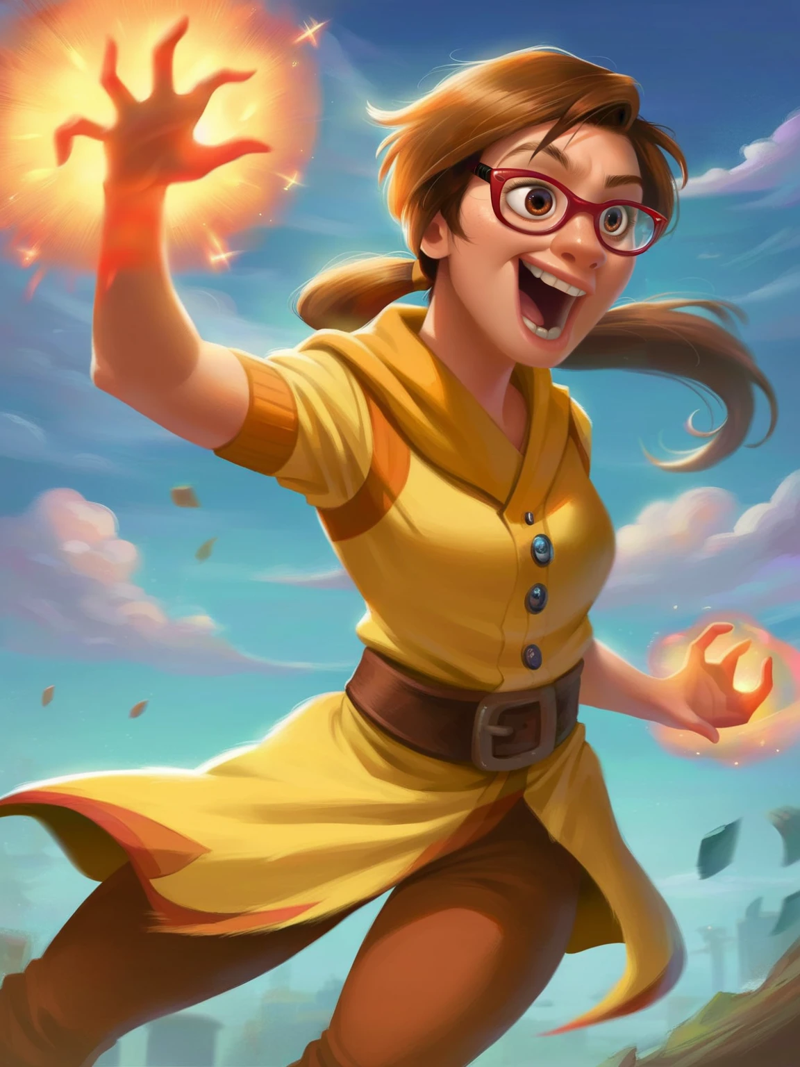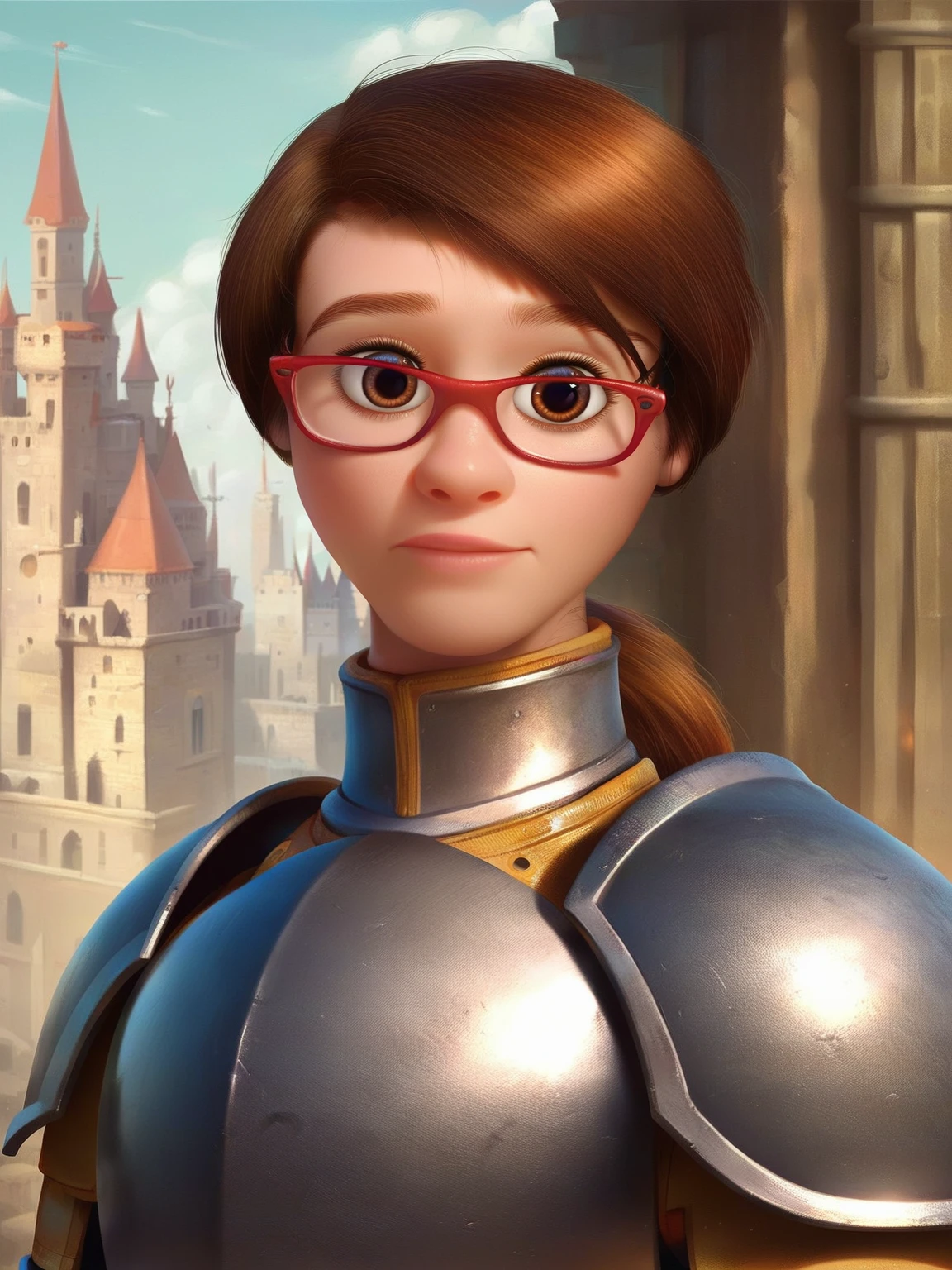 Recommend prompt: "brown eyes, brown hair, m_a, 1girl, red glasses, ponytail hair (or long hair)"