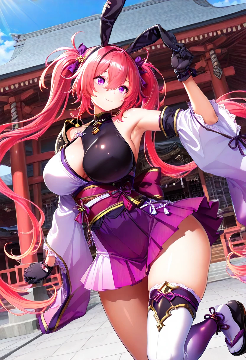 maiden_lulun, 1girl, solo, breasts, long hair, very long hair, red hair, hair between eyes, twintails, multicolored hair, animal ears, rabbit ears, fake animal ears, detached sleeves, bare shoulders, japanese clothes, colorful obi, black glove on one hand, wide sleeve on one arm, lace on sleeve, gold shoulder guard on one shoulder, purple ribbon on armpit, purple underwear, white breastplate on one breast, white belt on neck, white belt on thighhighs, white thighhighs, single thighhigh, purple and gold patterned thighhigh, purplpe skirt, tabi, geta, purple ankle accessories on one leg