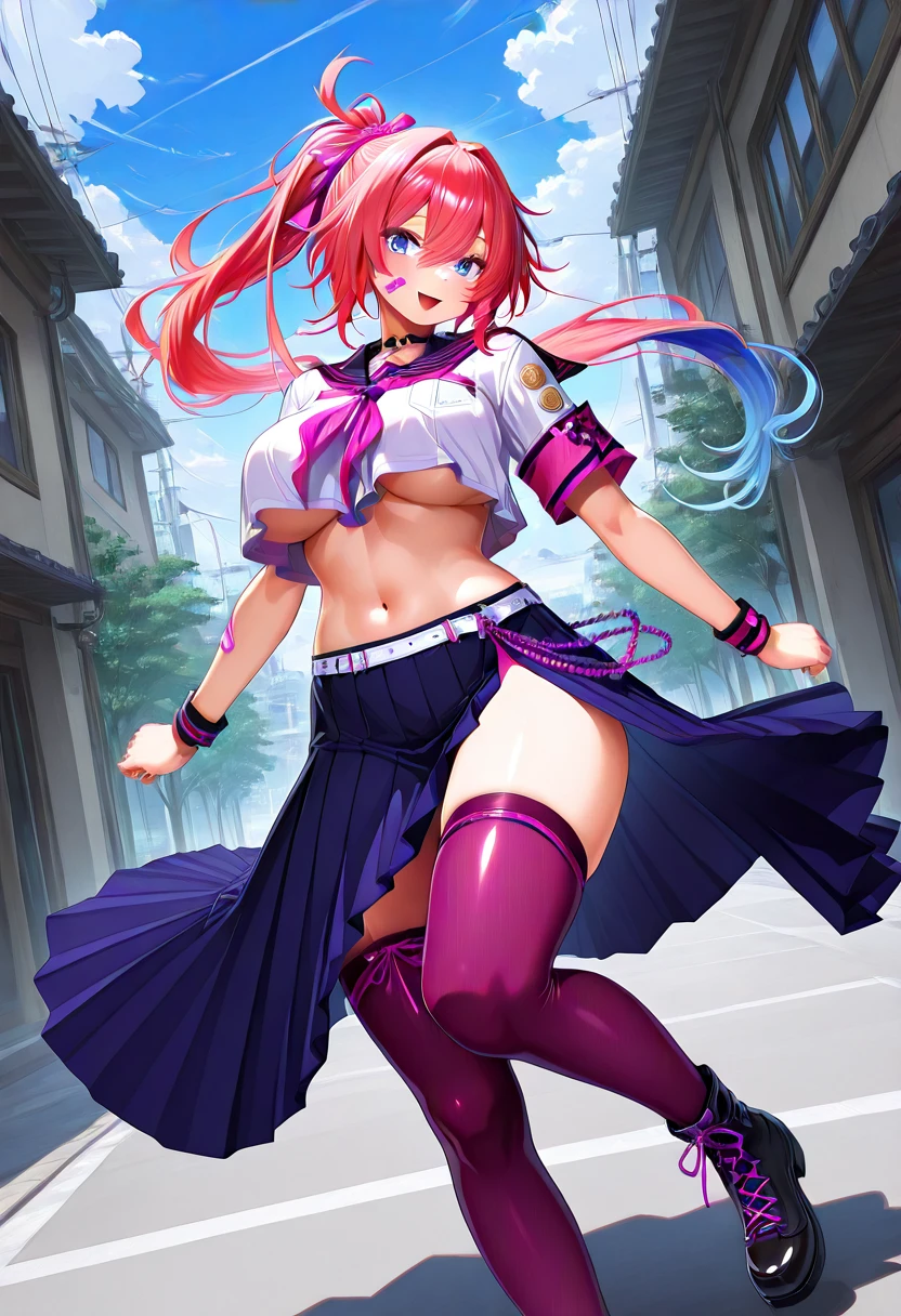 maddog_lulun, 1girl, solo, red bandaid on face, long hair, red hair, ponytail, multicolored hair, blue hair ribbon, navel, school uniform, serafuku, long skirt, pleated skirt, slit skirt, pink slit, crop top, white belt on belly, purple chain connected with belt, pink ribbon on serafuku, pink armband, patches on arm, patches on skirt, breasts, midriff, crop top overhang, underboob, thighhigh on one leg, purple thighhigh, black belts on thighhigh, boot on one leg, shoe on one leg, purple shoelaces, cross-laced footwear, bandaid on leg