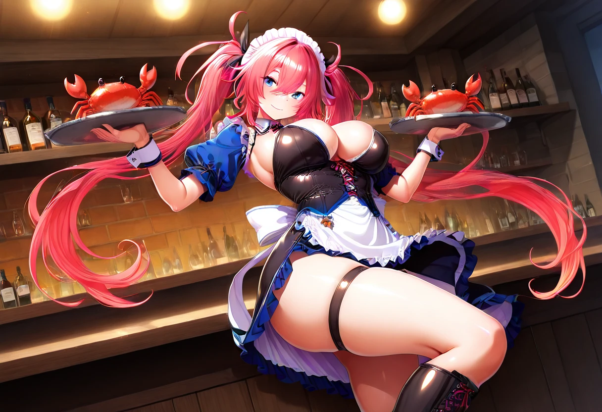 postergirl_lulun, 1girl, solo, breasts, long hair, very long hair, red hair, twintails, multicolored hair, hair between eyes, light blue eyes, white maid headdress, black ribbon on maid headdress, maid, short sleeves, puffy short sleeves, blue sleeves, blue edged apron, sideboob, black dress, shiny dress, criss cross lace dress, red lace dress, breasts, cleavage, clenched hands, wrist cuffs, white cuffs, black cuffs button, belt on shoulder, blue edged white collar, white shoulder frills, lace-up boots, black footwear, black boots, cross-laced footwear, red lace boots, knee boots, white thigh strap