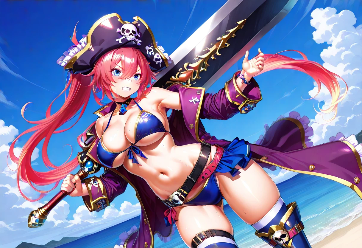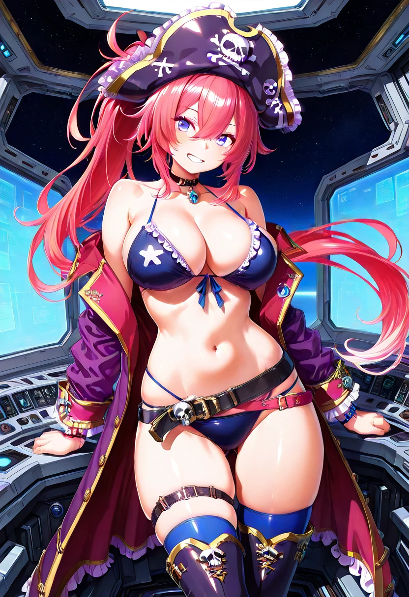 spacepirates_lulun, 1girl, breasts, solo, long hair, very long hair, red hair, twintails, multicolored hair, ponytail, bangs, hair between eyes, light blue eyes, hat, pirate hat, swimsuit, bikini, open coat, pirate coat, purple coat, cleavage, bare shoulder, belt on belly, navel, glod edge coat sleeve, coat of frills on edge, red grove on one hand, start shaped patches, blue rosary on wrist, bare shoulders, one blue boot, one gold edged boot, one blue thighhigh, thigh strap, skull and white stripes pattern on thighhigh, red belt on thighhigh, two black belts on one thigh