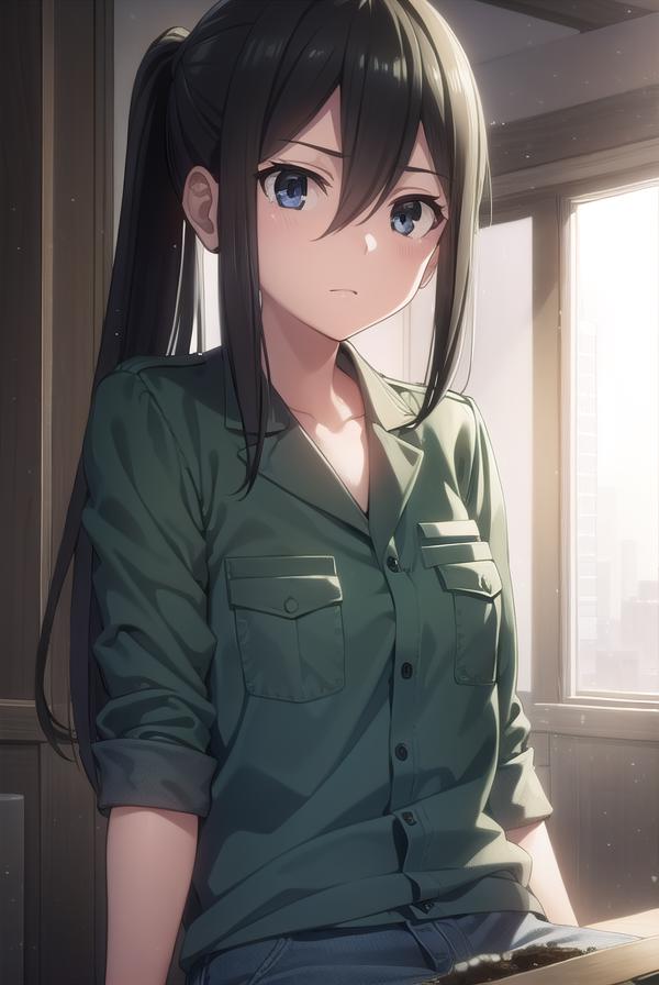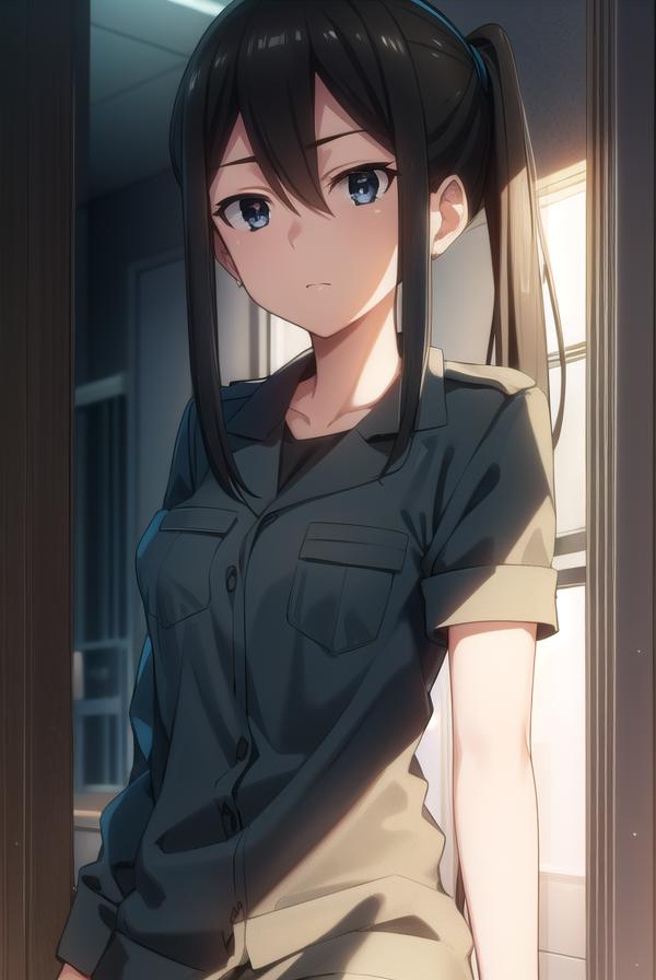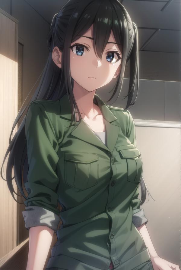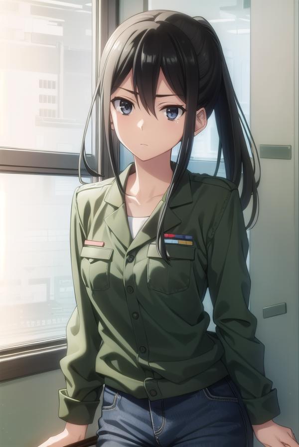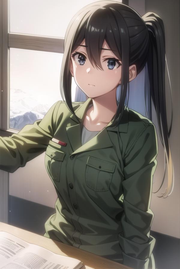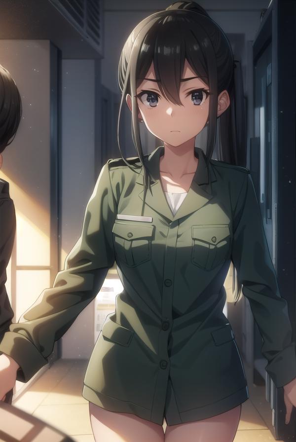 ryouko kusakabe military uniform, long hair, black hair, ponytail, uniform, military, military uniform, (black eyes:1.3),