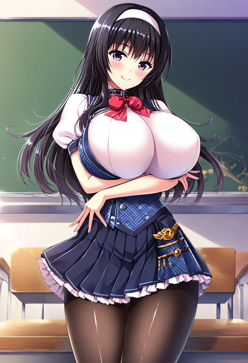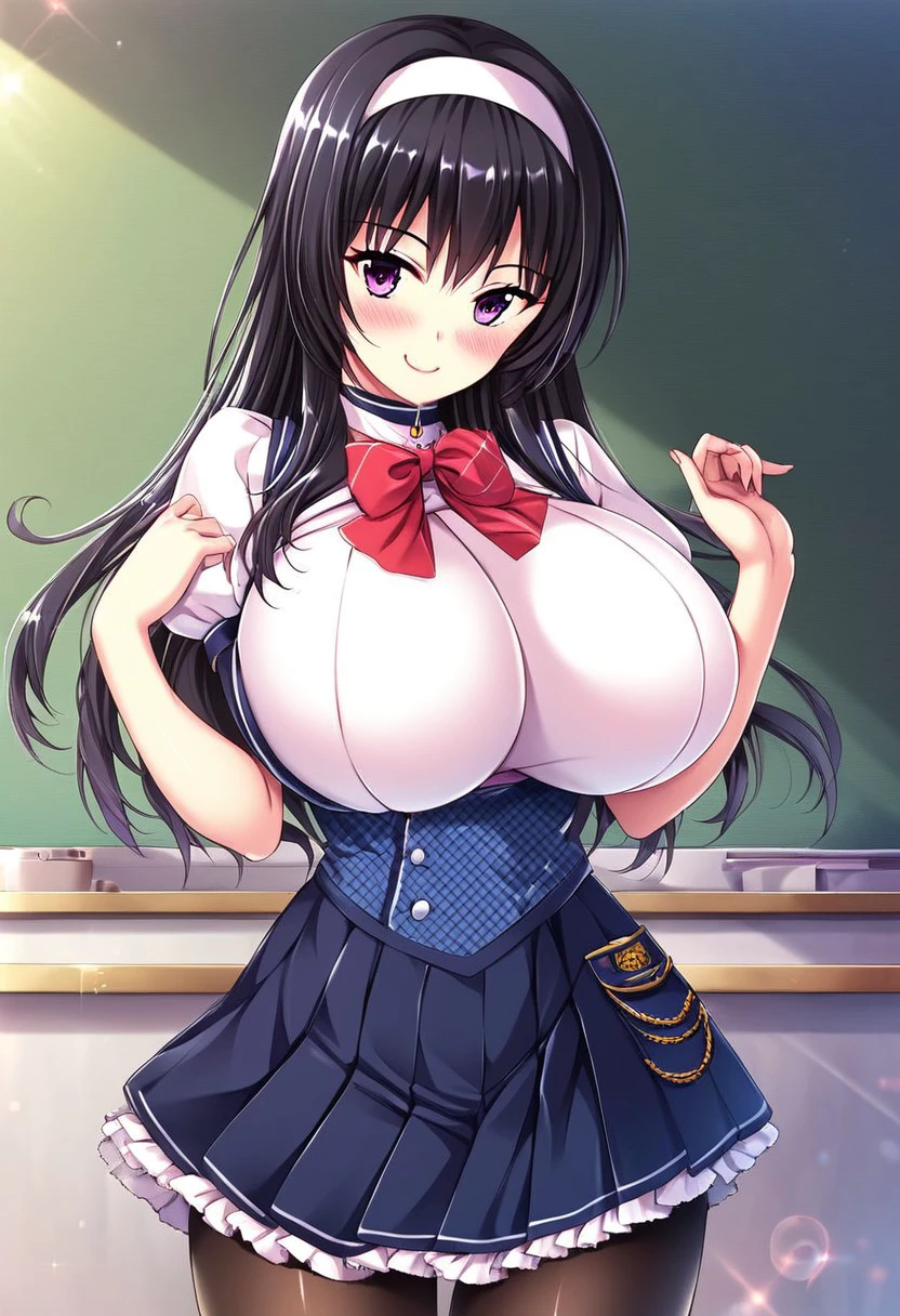 red bow, school uniform, shirt, puffy sleeves, short sleeves, pleated skirt, skirt, black pantyhose, white shirt, white sleeves,