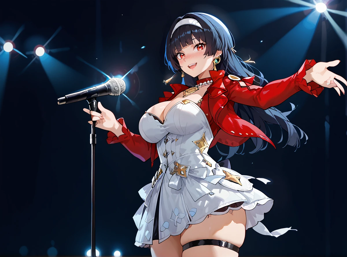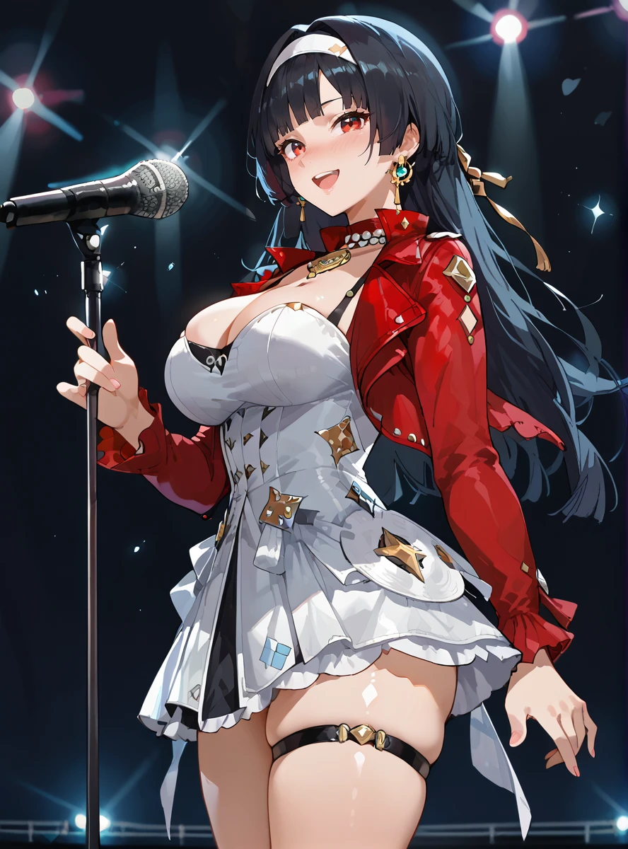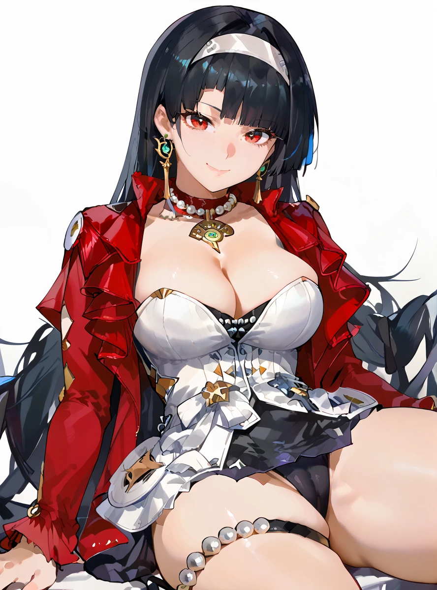 1girl, solo,black_hair, breasts, jewelry, earrings, dress, bangs, necklace, hairband, large breasts, red jacket, red eyes, thigh strap, cleavage, , jacket