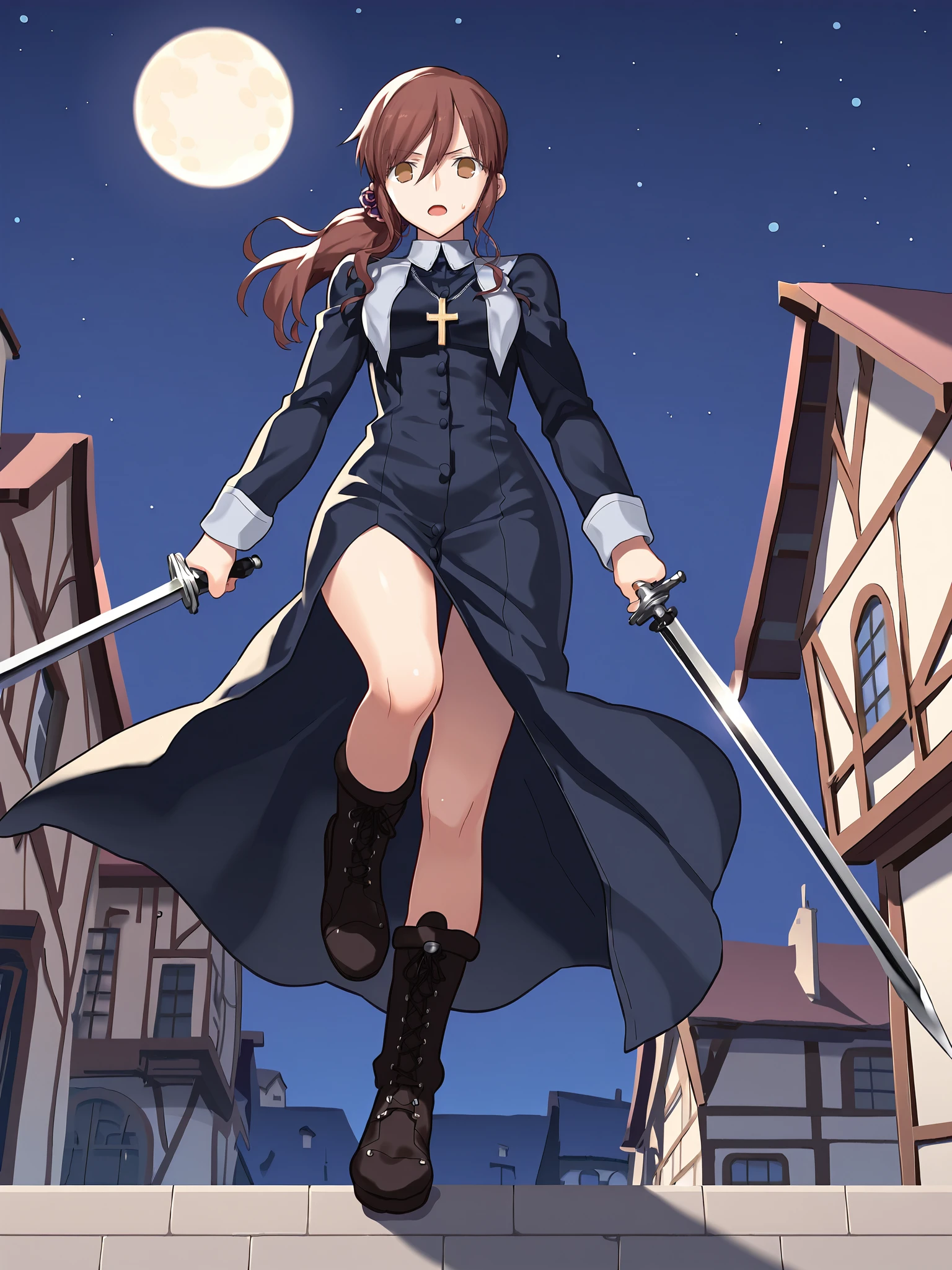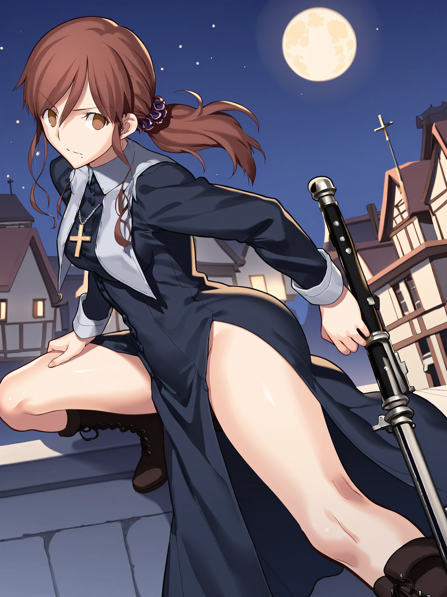 noel_nun, nun, habit, black dress, long sleeves, cross necklace, cross-laced boots, high heel boots, knee boots, black footwear