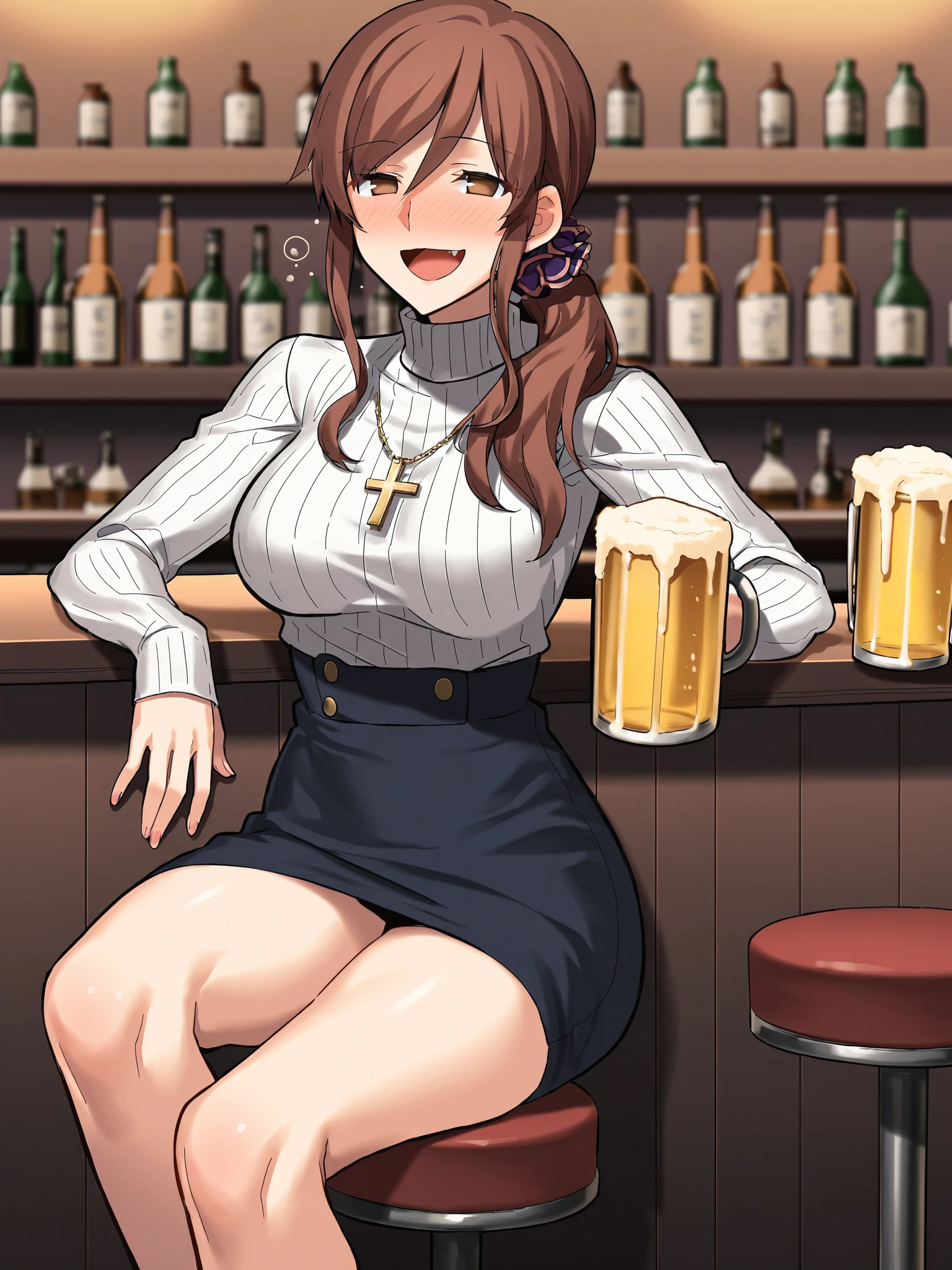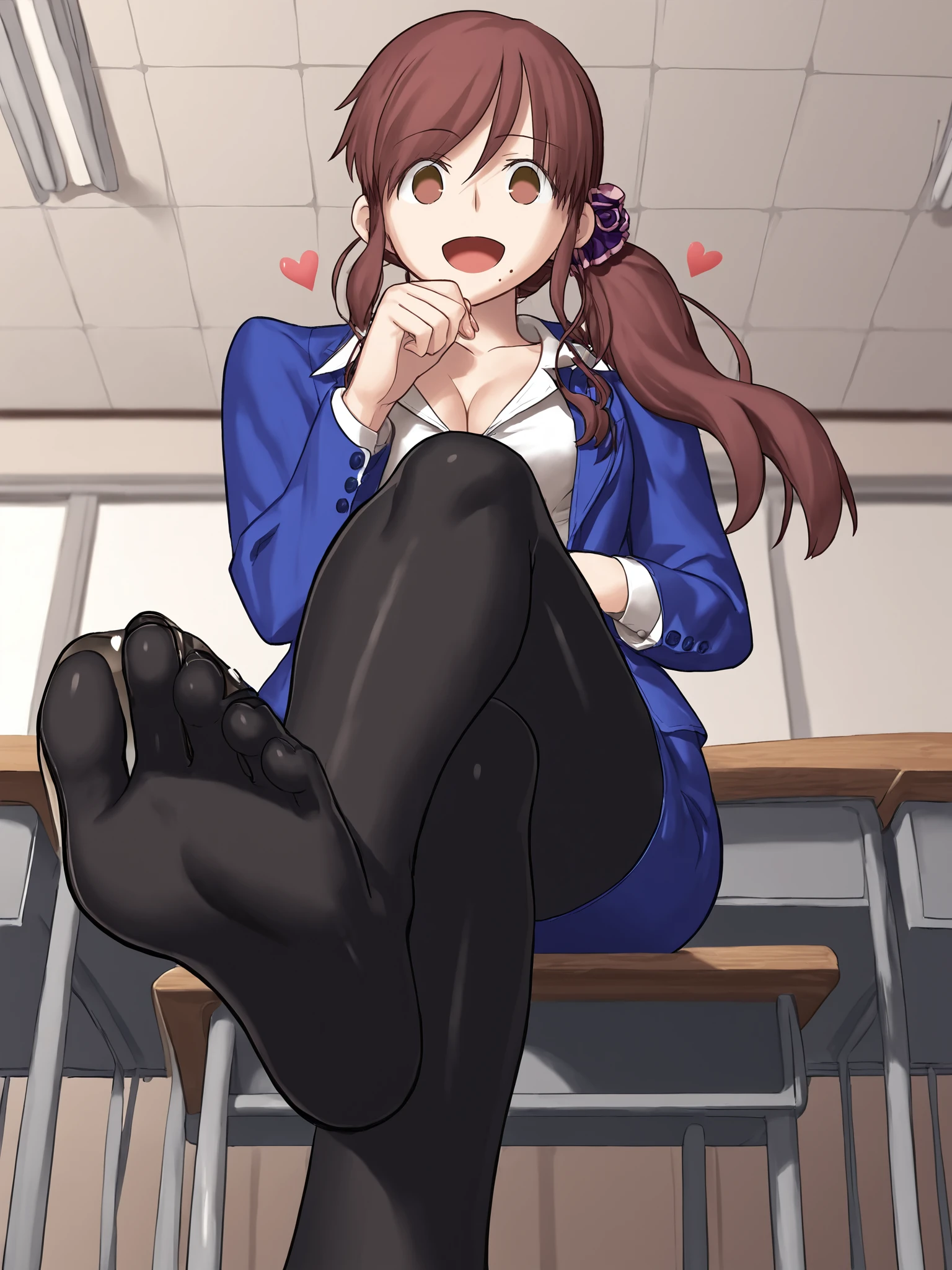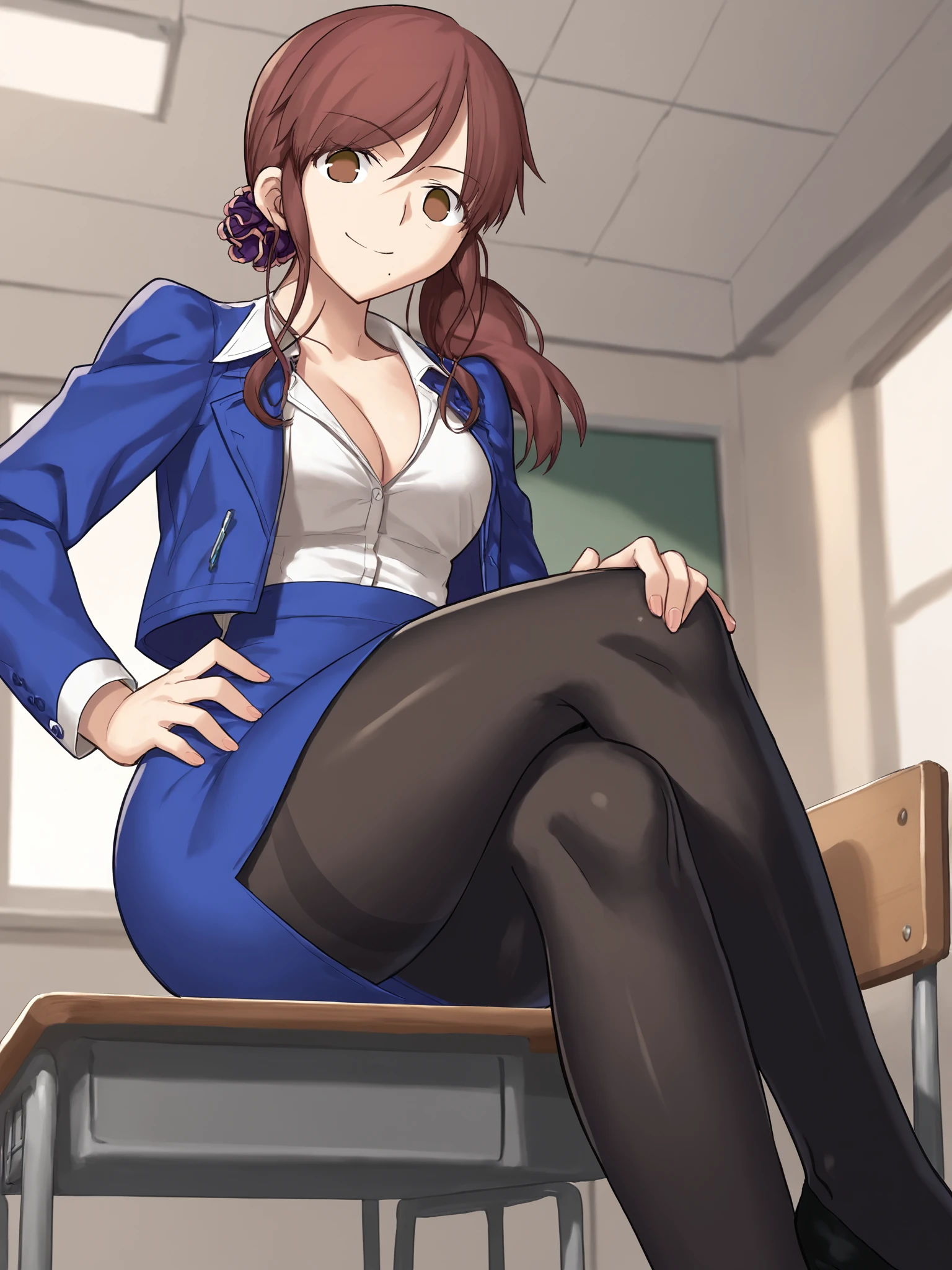 brown hair, brown eyes, side swept bangs, hair between eyes, purple scrunchie, hair scrunchie, side ponytail, low ponytail, mole under mouth, hair over shoulder, ahoge