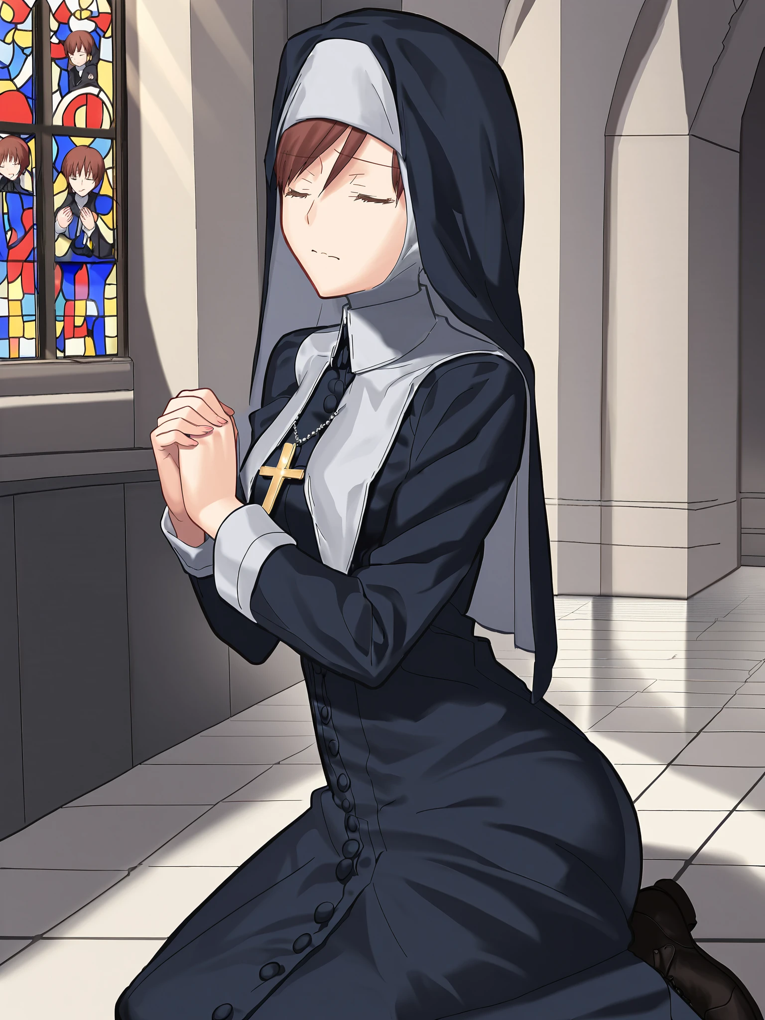 noel_veil, veil, nun, habit, black dress, long sleeves, cross necklace, cross-laced boots, high heel boots, knee boots, black footwear, short hair