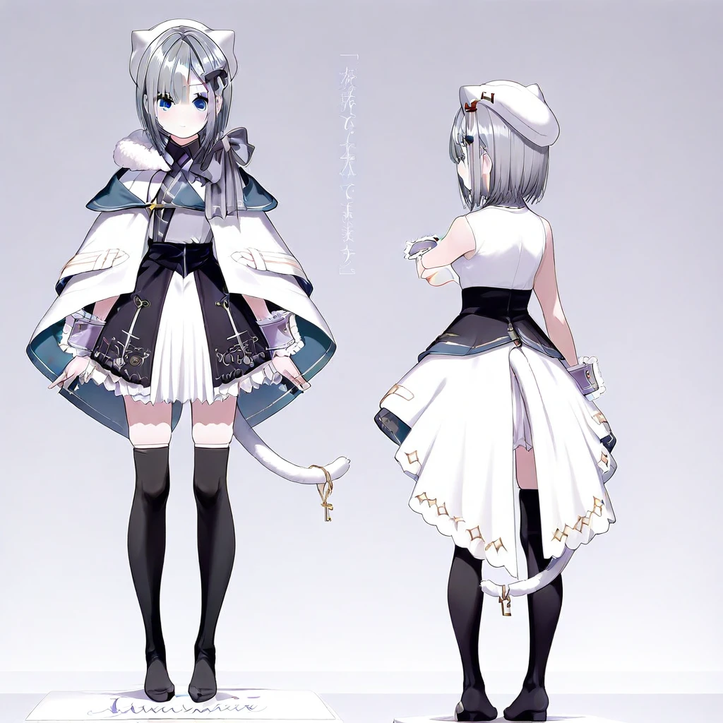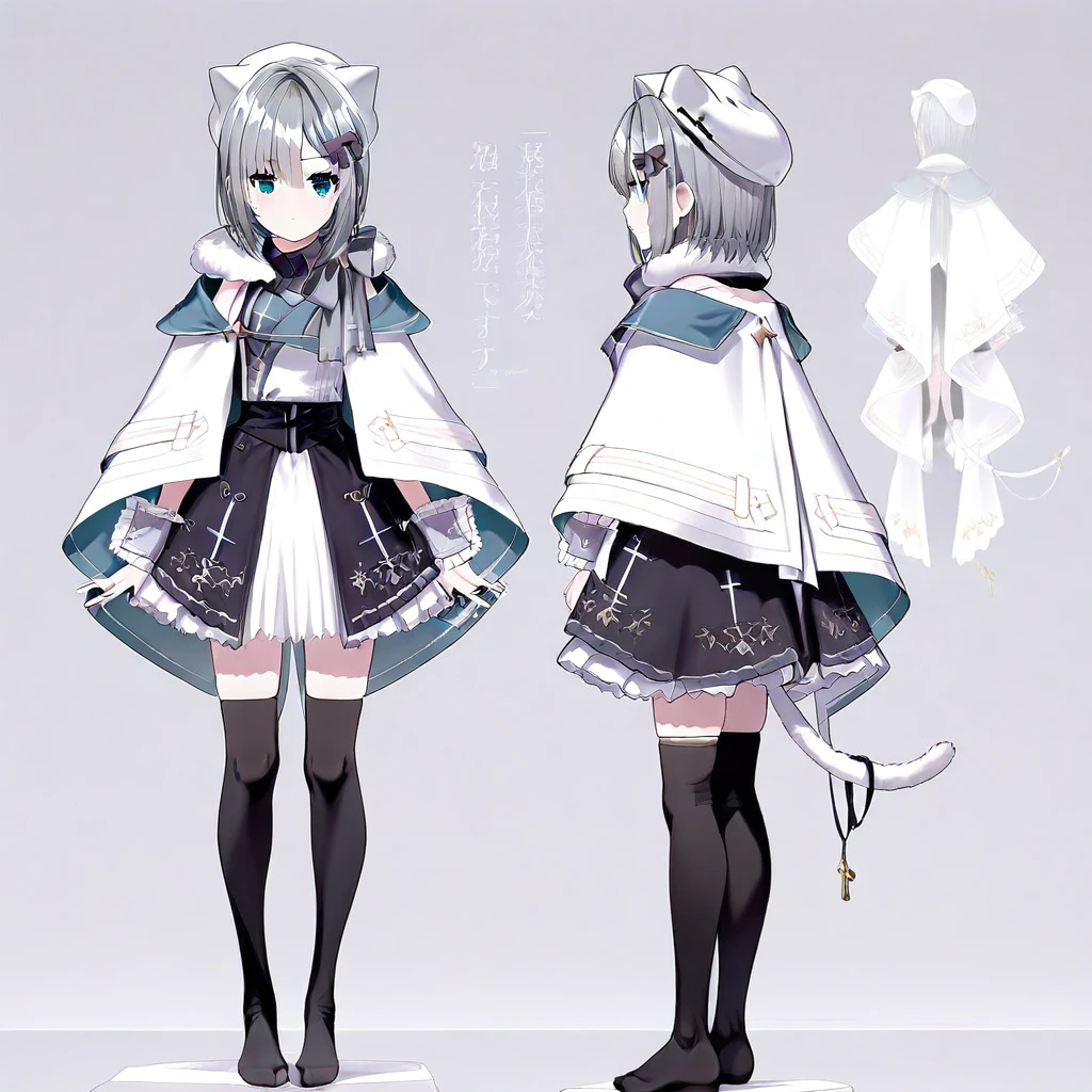 outfit1aasumire, short hair, grey hair, animal hat, white headwear, hair bow, cross hair ornament, blue eyes, tail, fur trim, white cape, white shirt, wrist cuffs, overskirt, black skirt, black thighhighs
