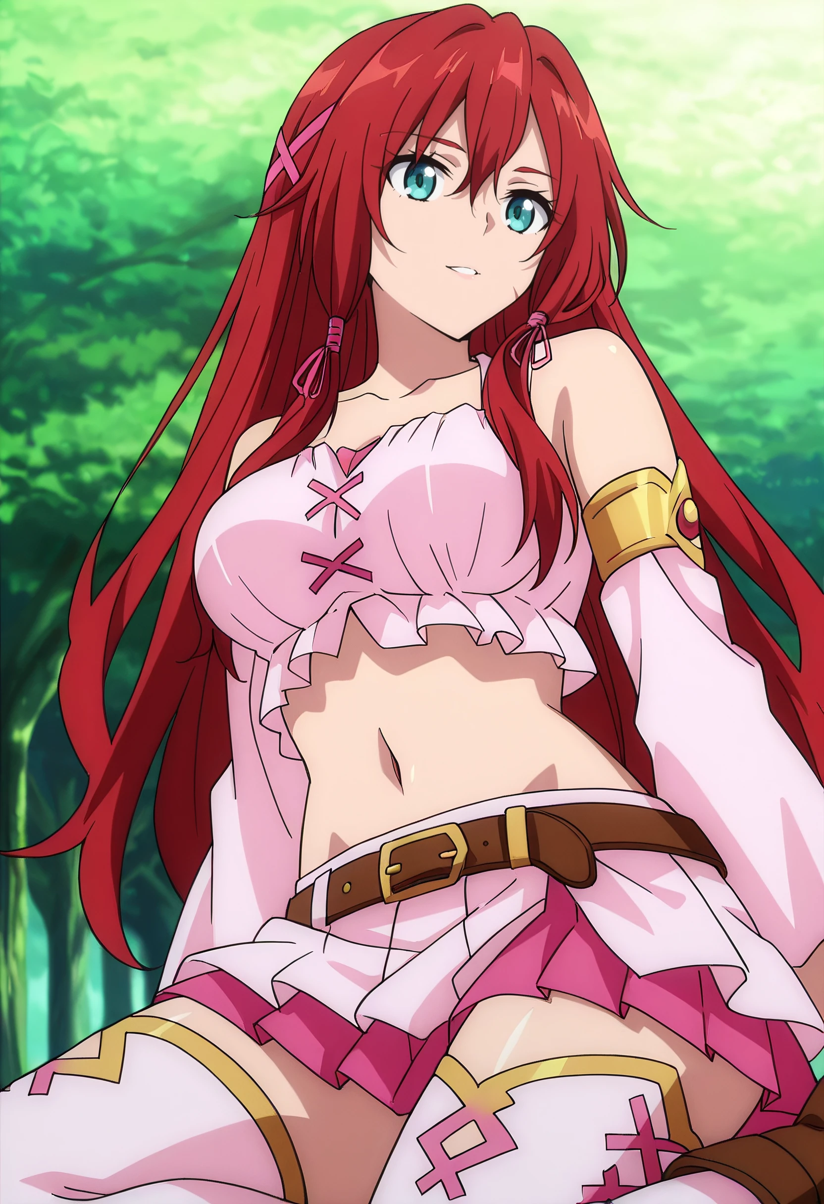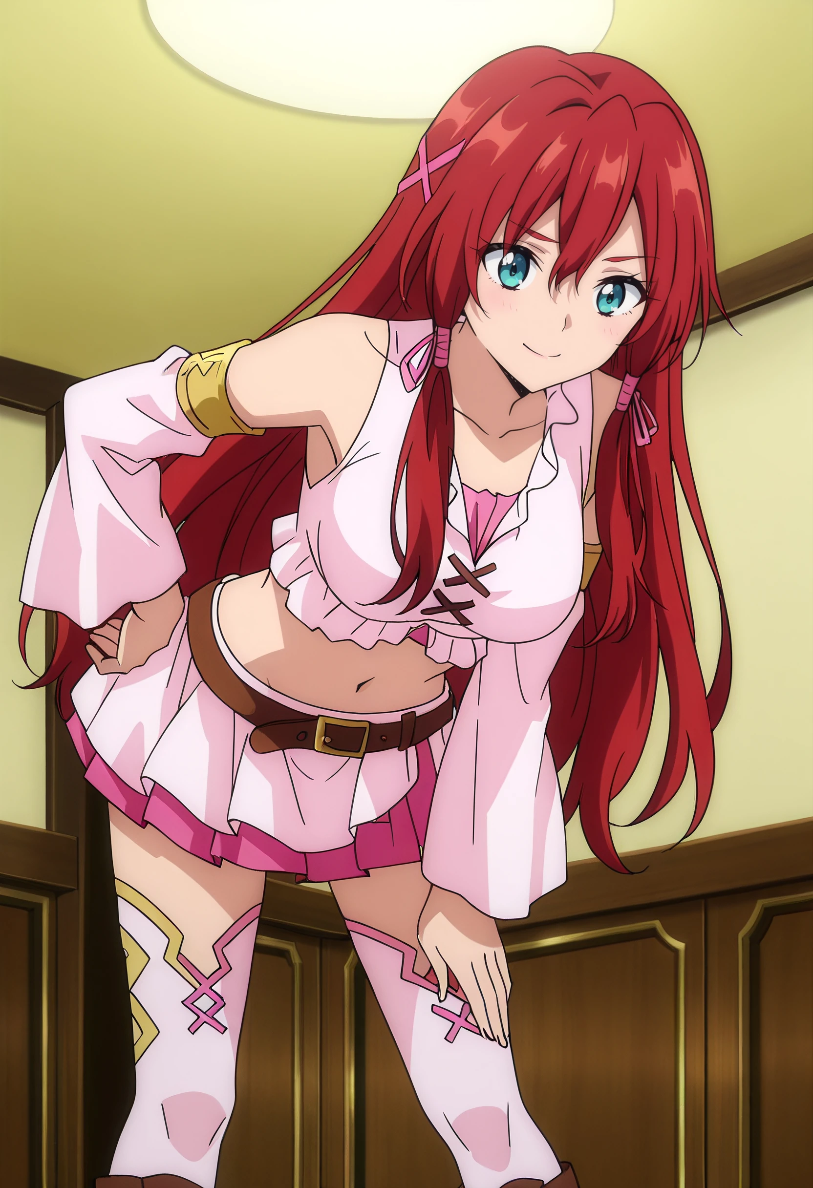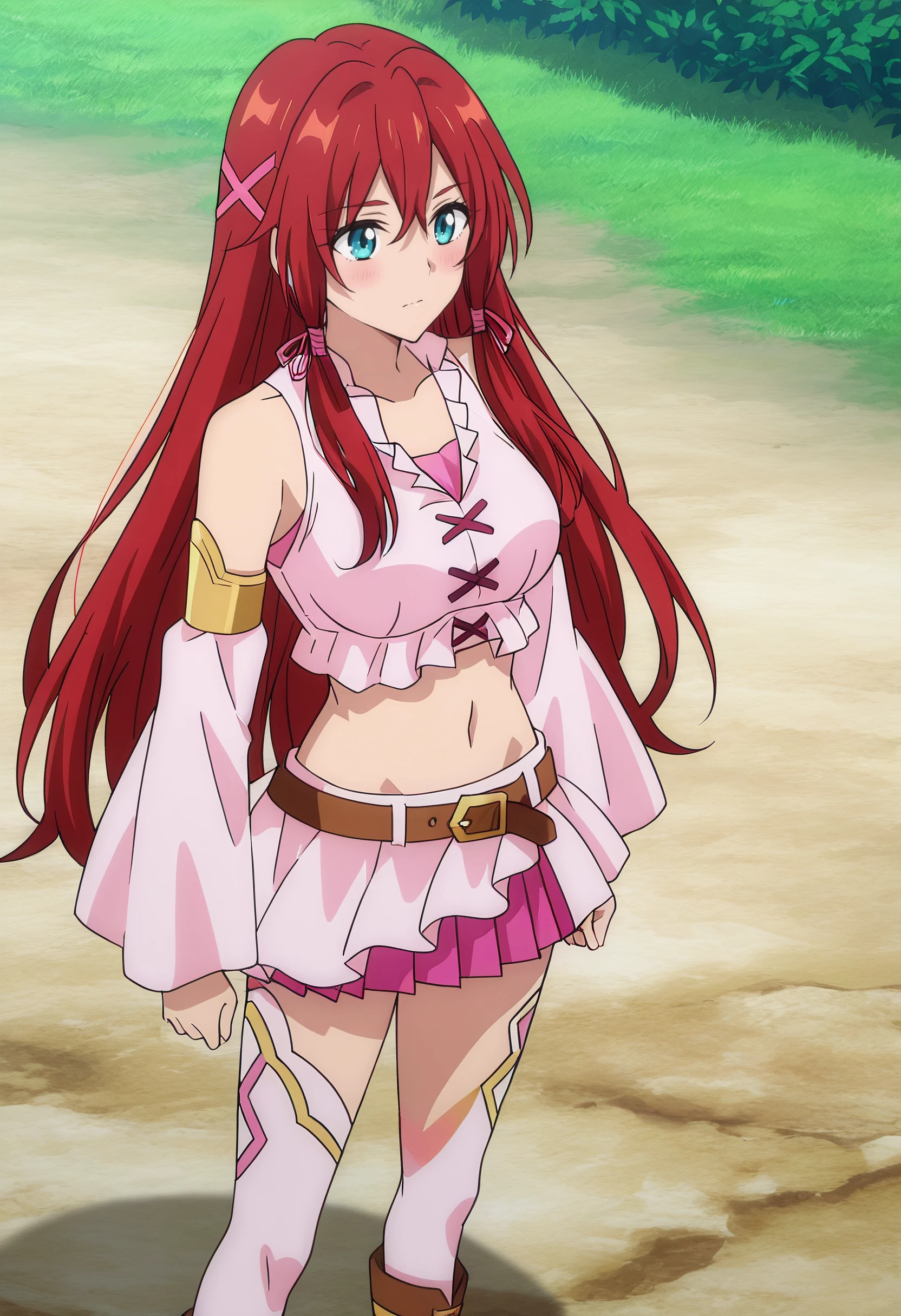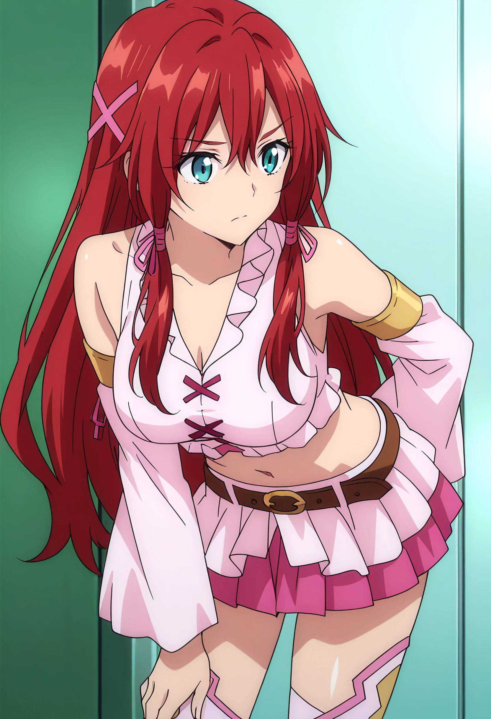 ribbon, hair ornament, hair ribbon, pink shirt, bare shoulders, shirt, sleeveless, pink ribbon, belt, navel, pink skirt, skirt, thighhighs, white shirt, bow, collarbone, detached sleeves, midriff, boots, miniskirt, pleated skirt, x hair ornament,