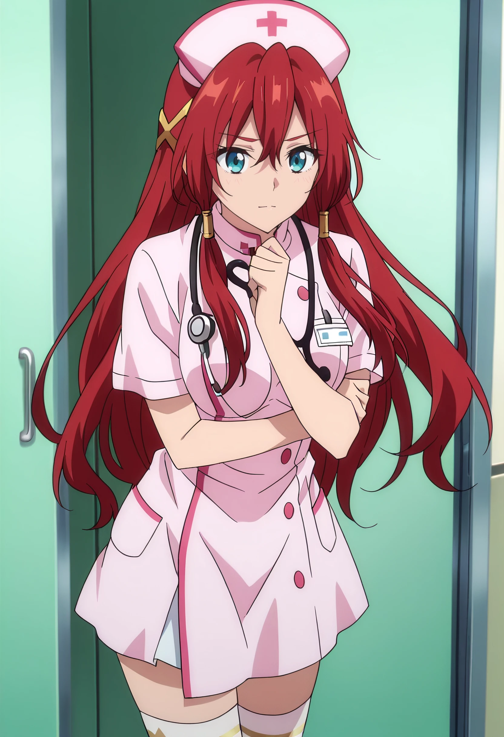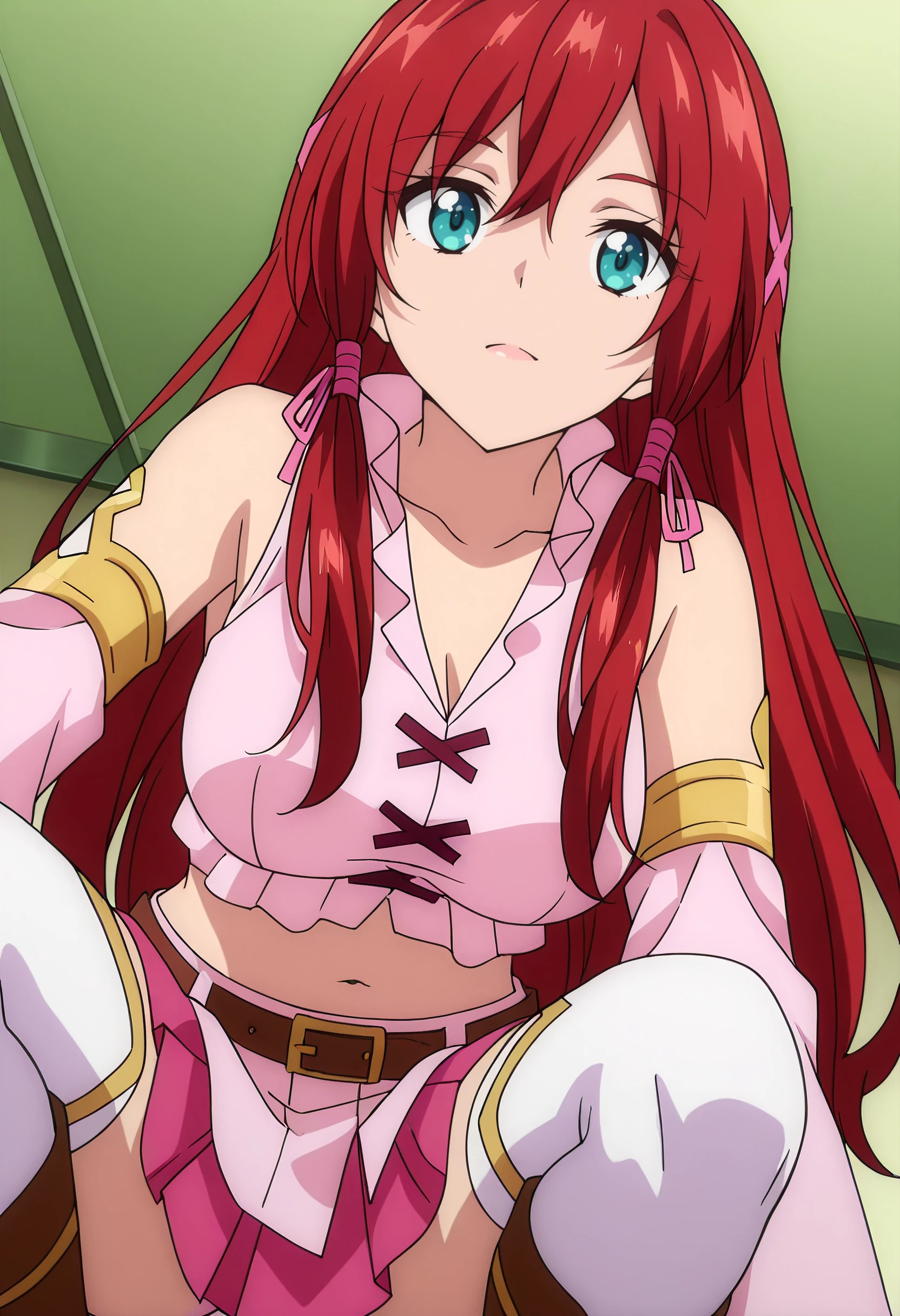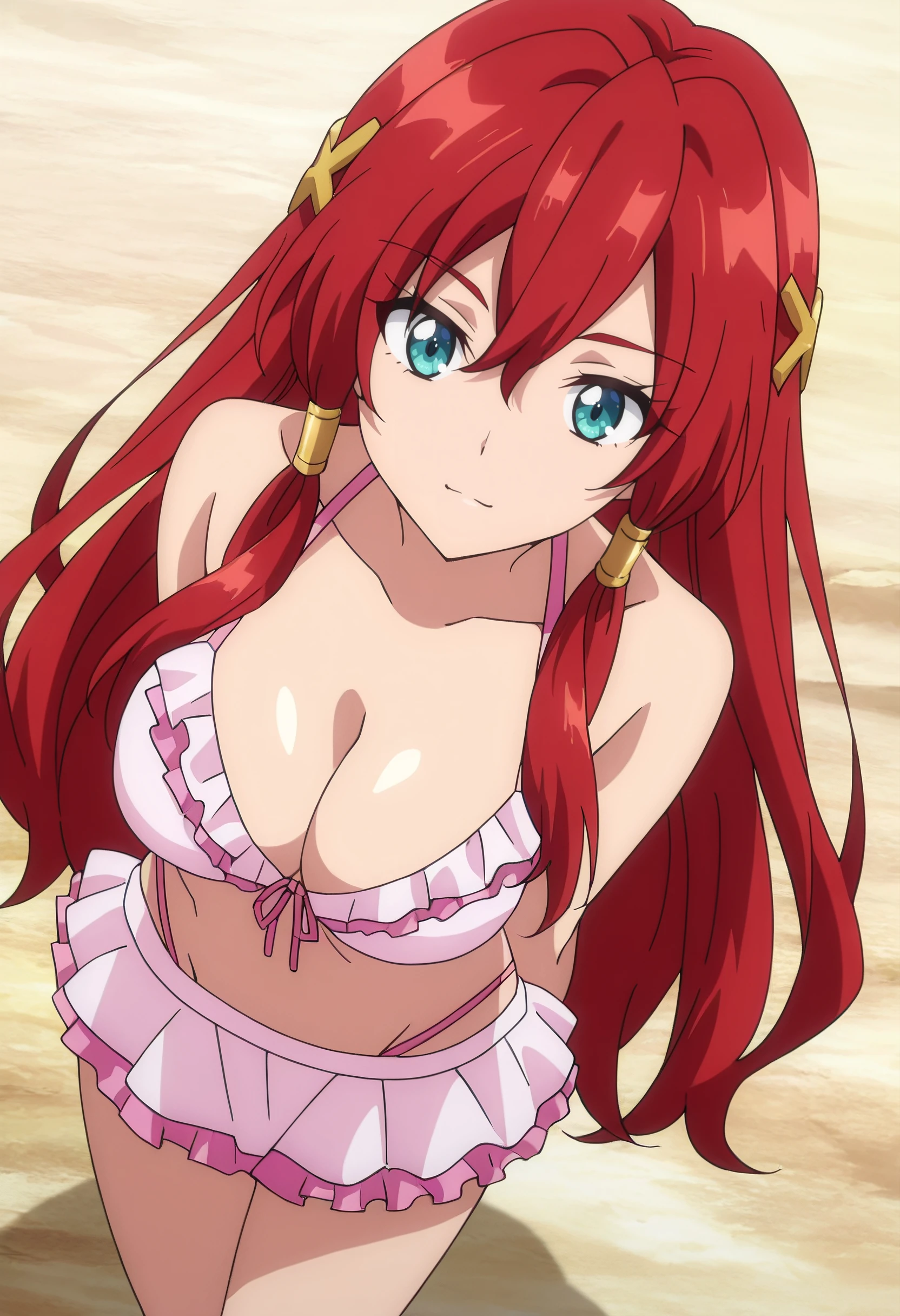 BYNAmelia, red hair, long hair, bangs, blue eyes, hair between eyes, aqua eyes, eyebrows visible through hair, low twintails, hair tubes, twintails,