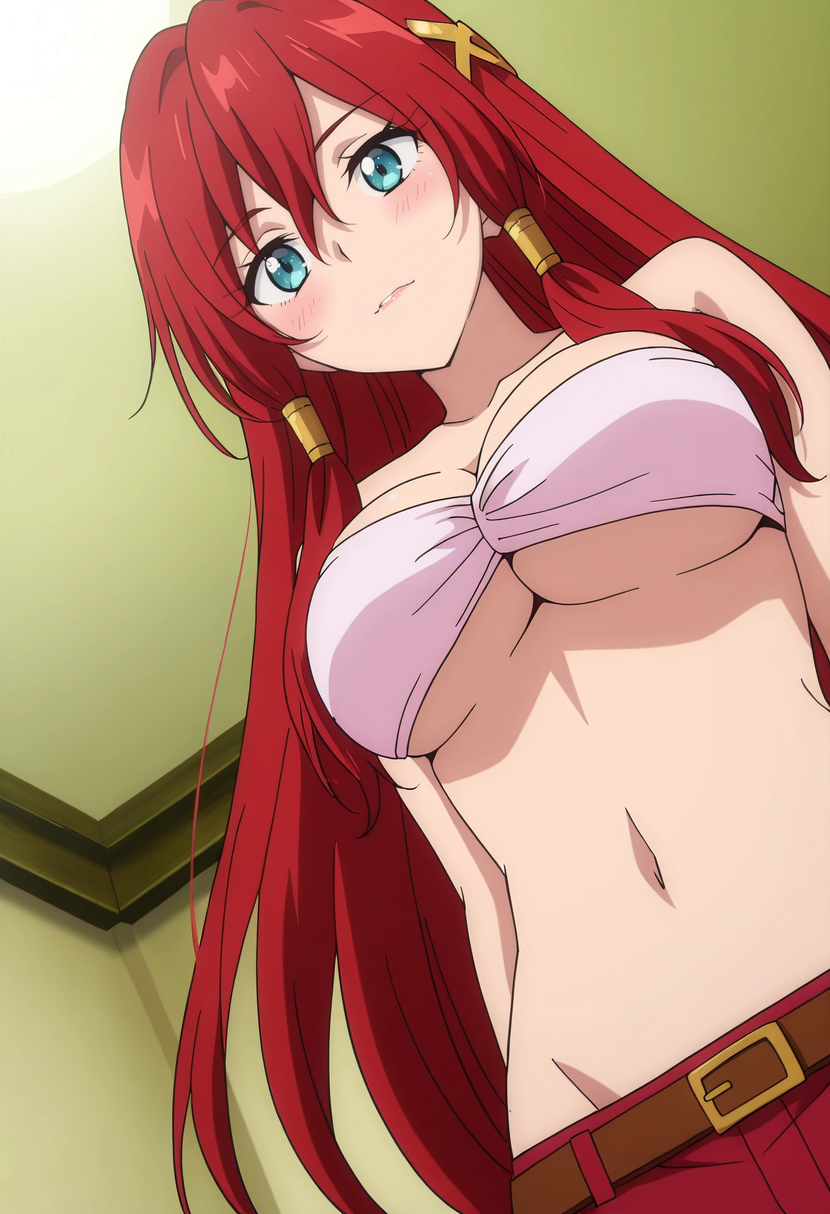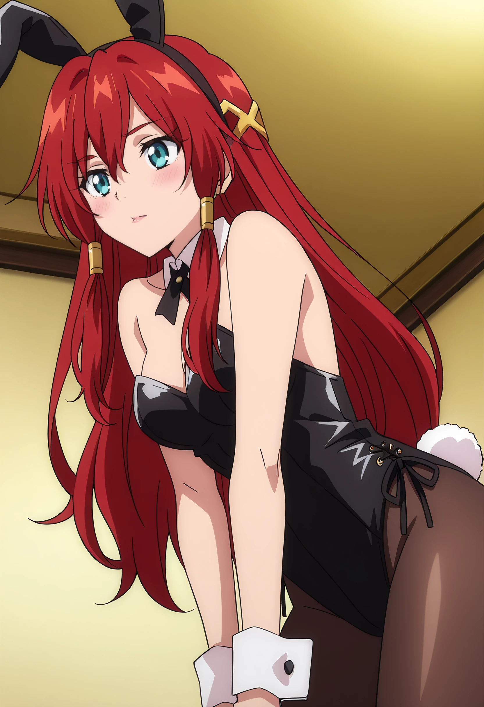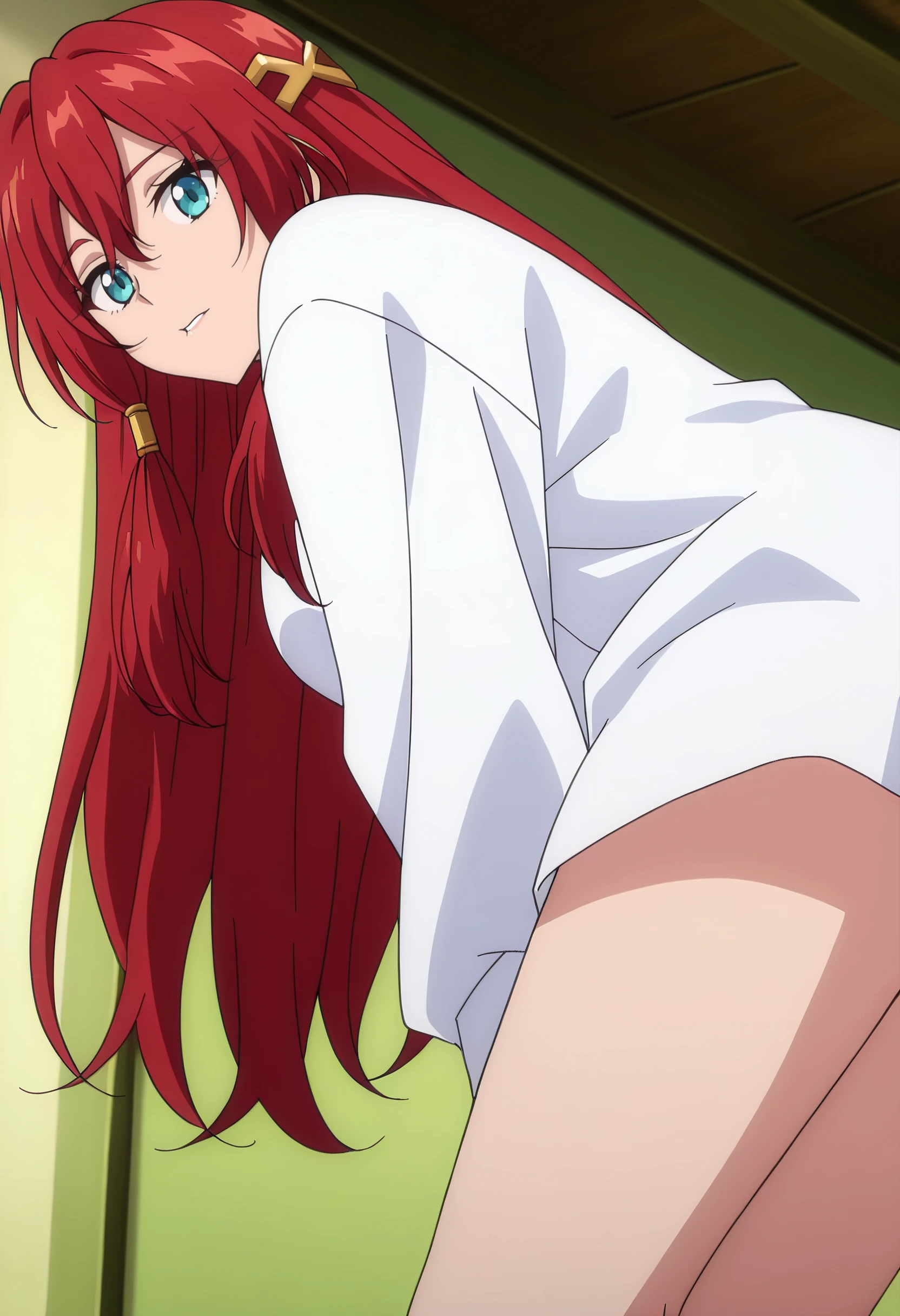 BYNAmelia, red hair, long hair, bangs, blue eyes, hair between eyes, aqua eyes, eyebrows visible through hair, low twintails, hair tubes, twintails,