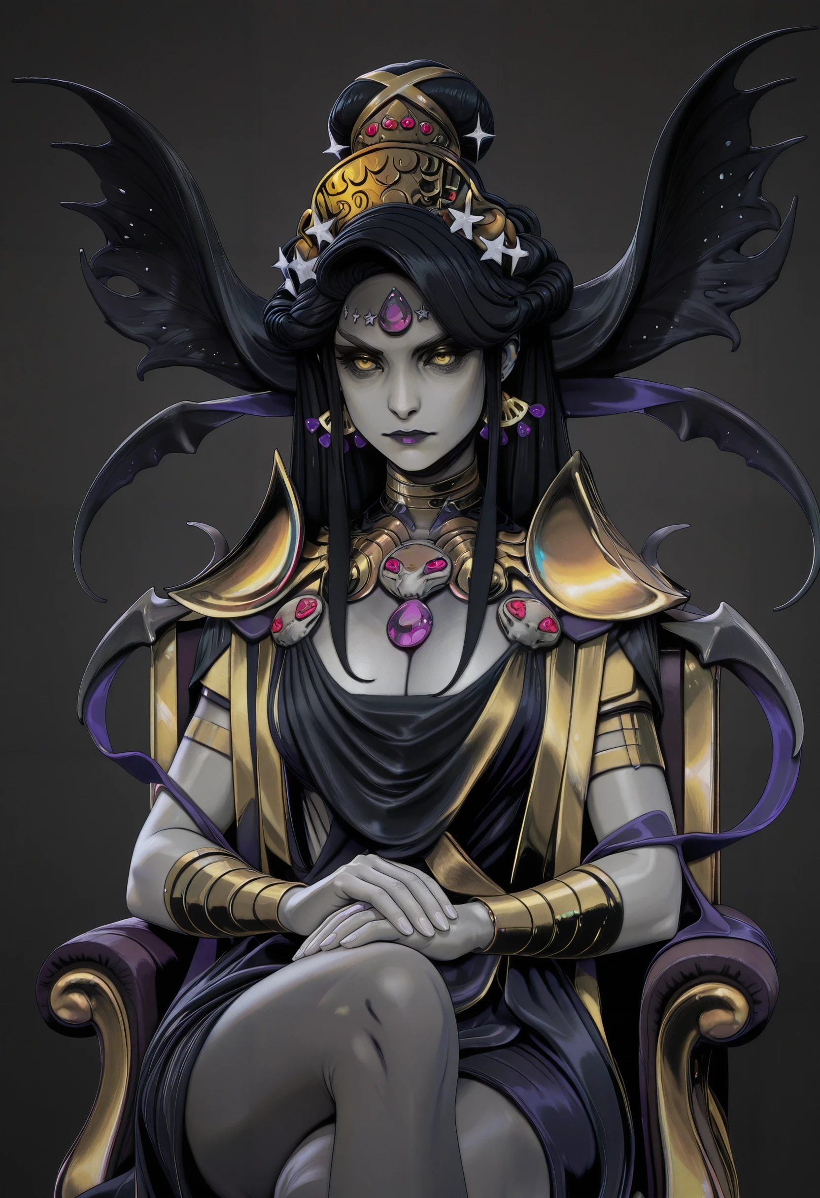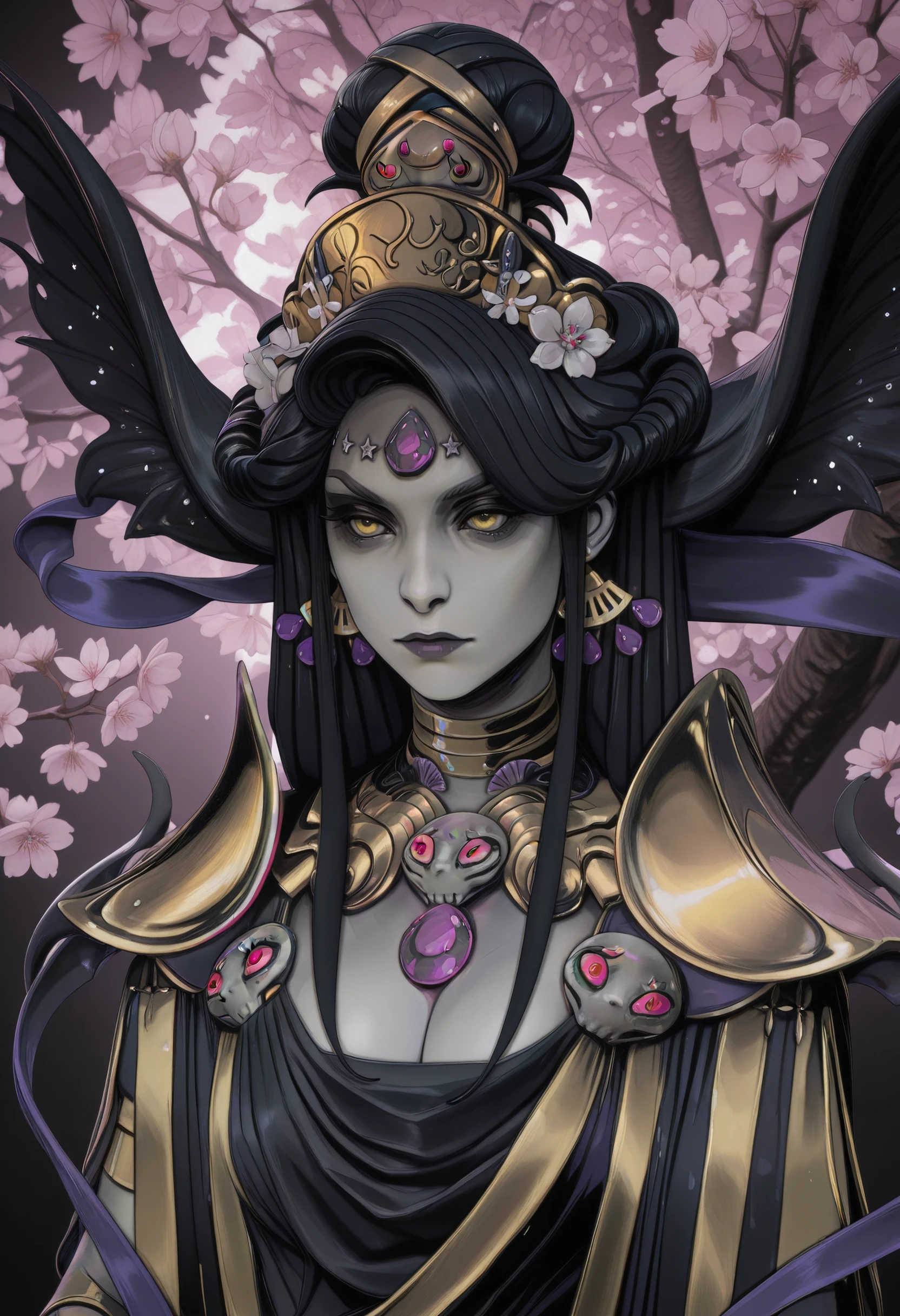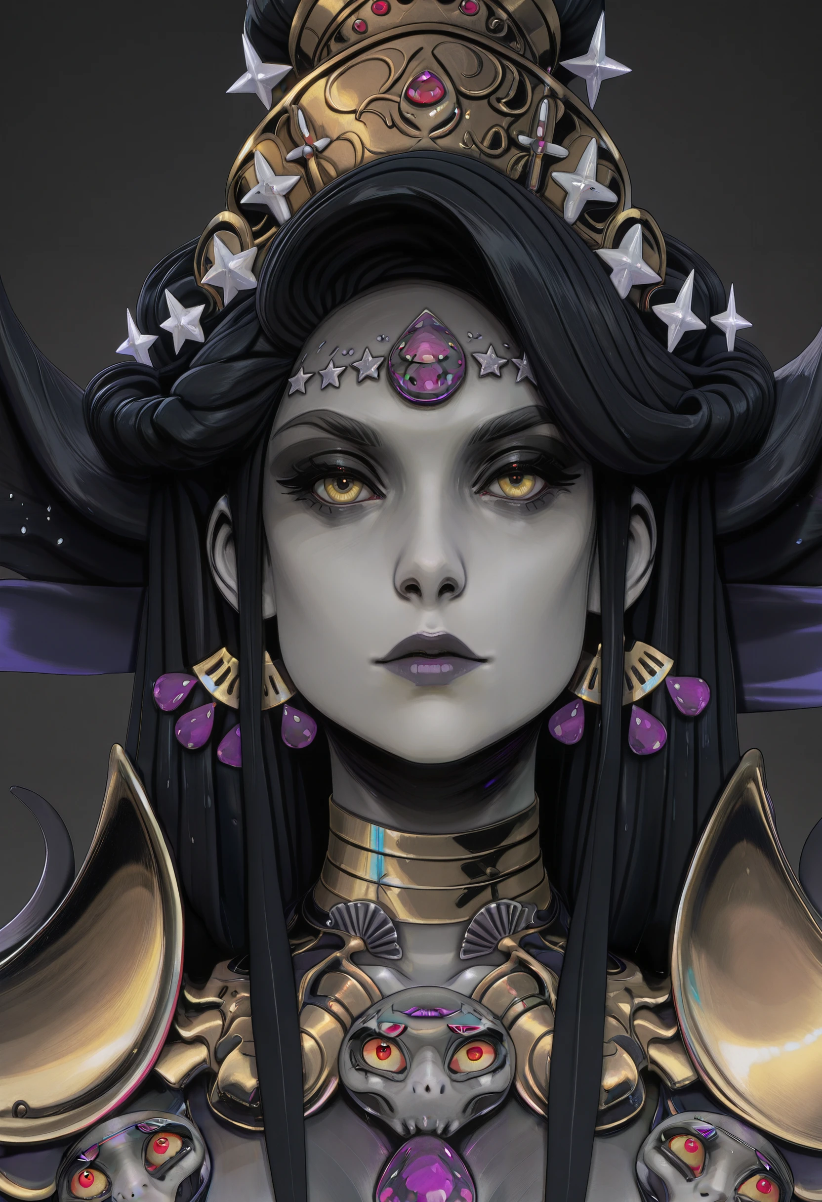 HNyx, 1girl, long hair, black hair, yellow eyes, jewelry, grey skin, forehead jewel, make up