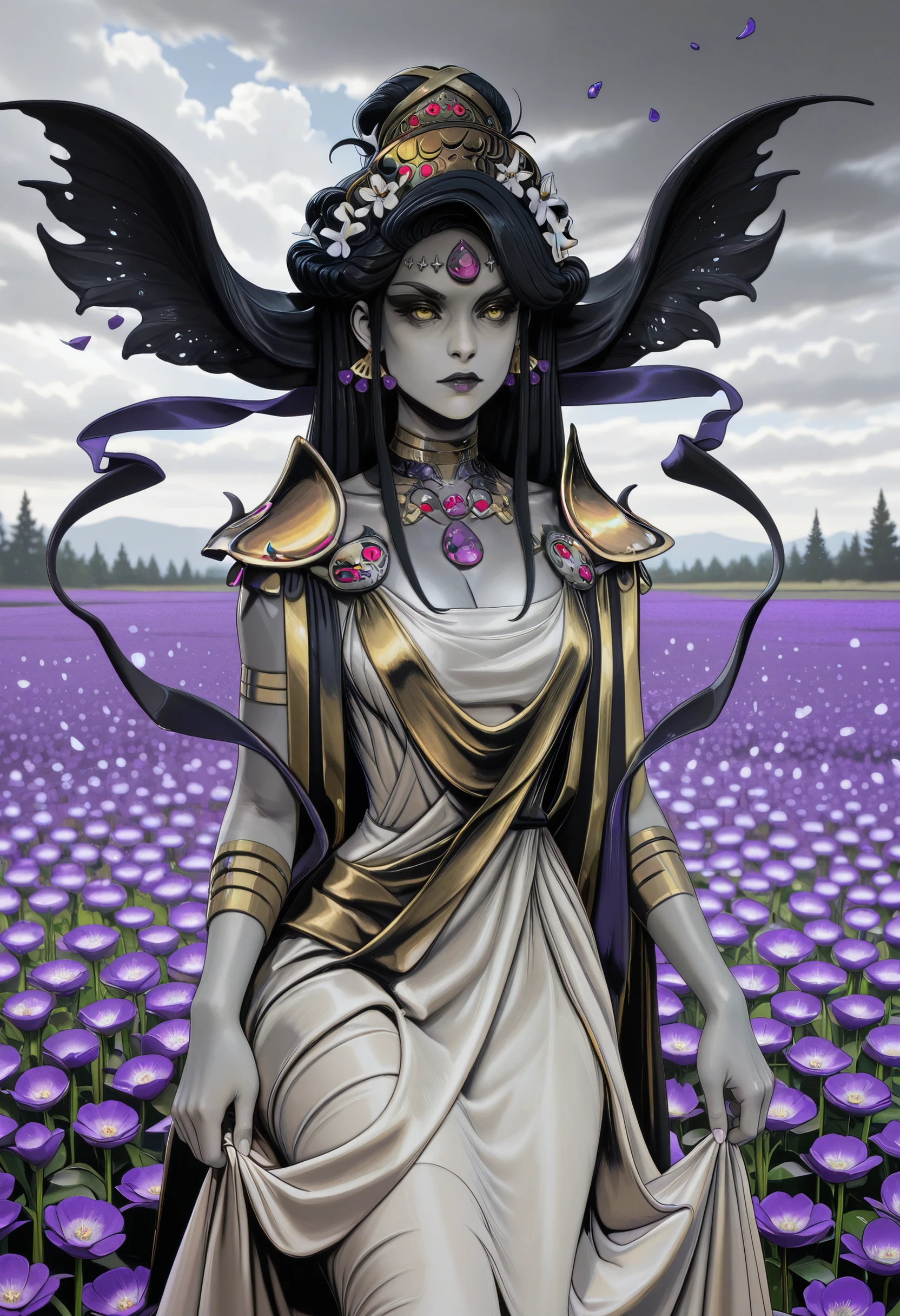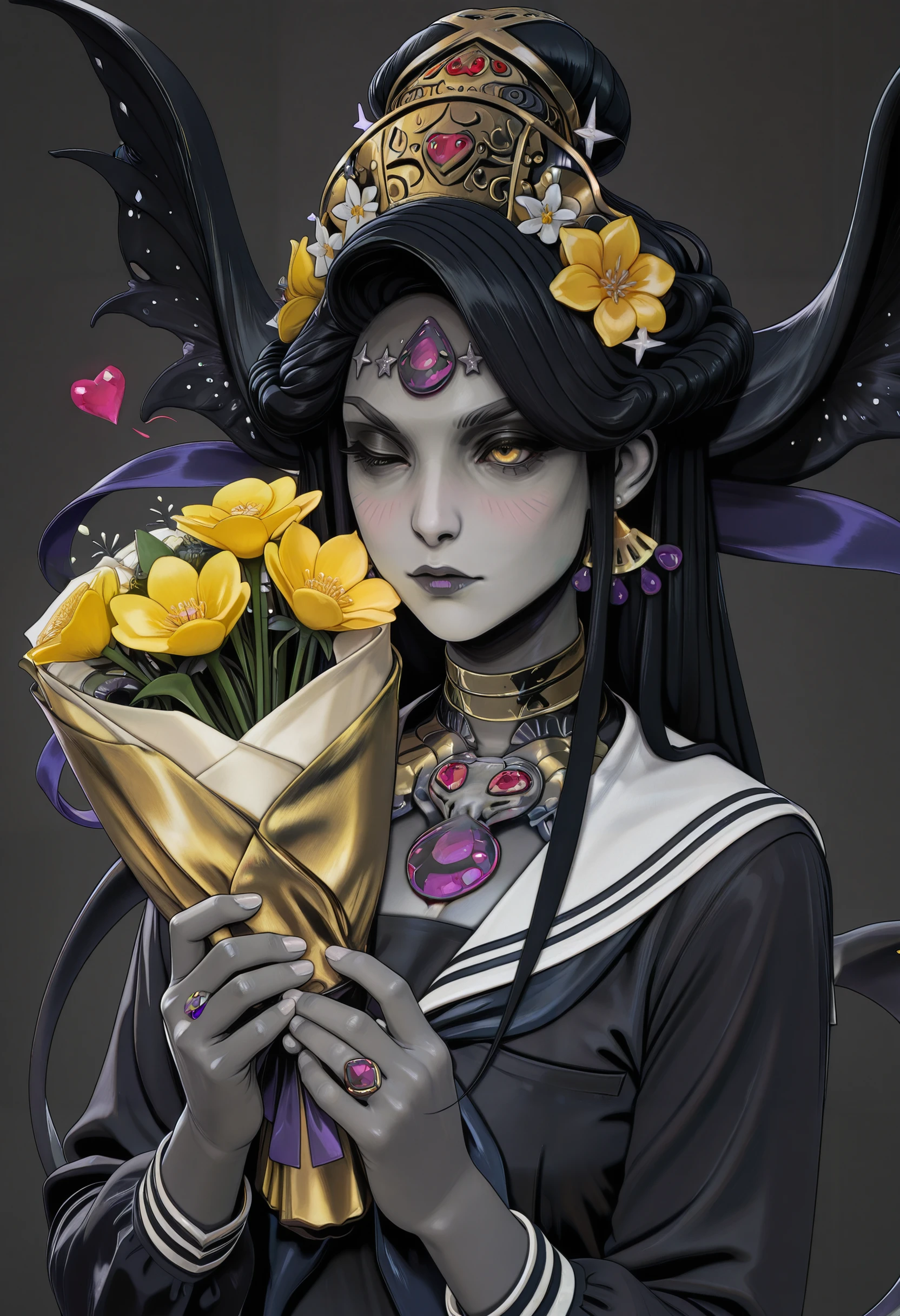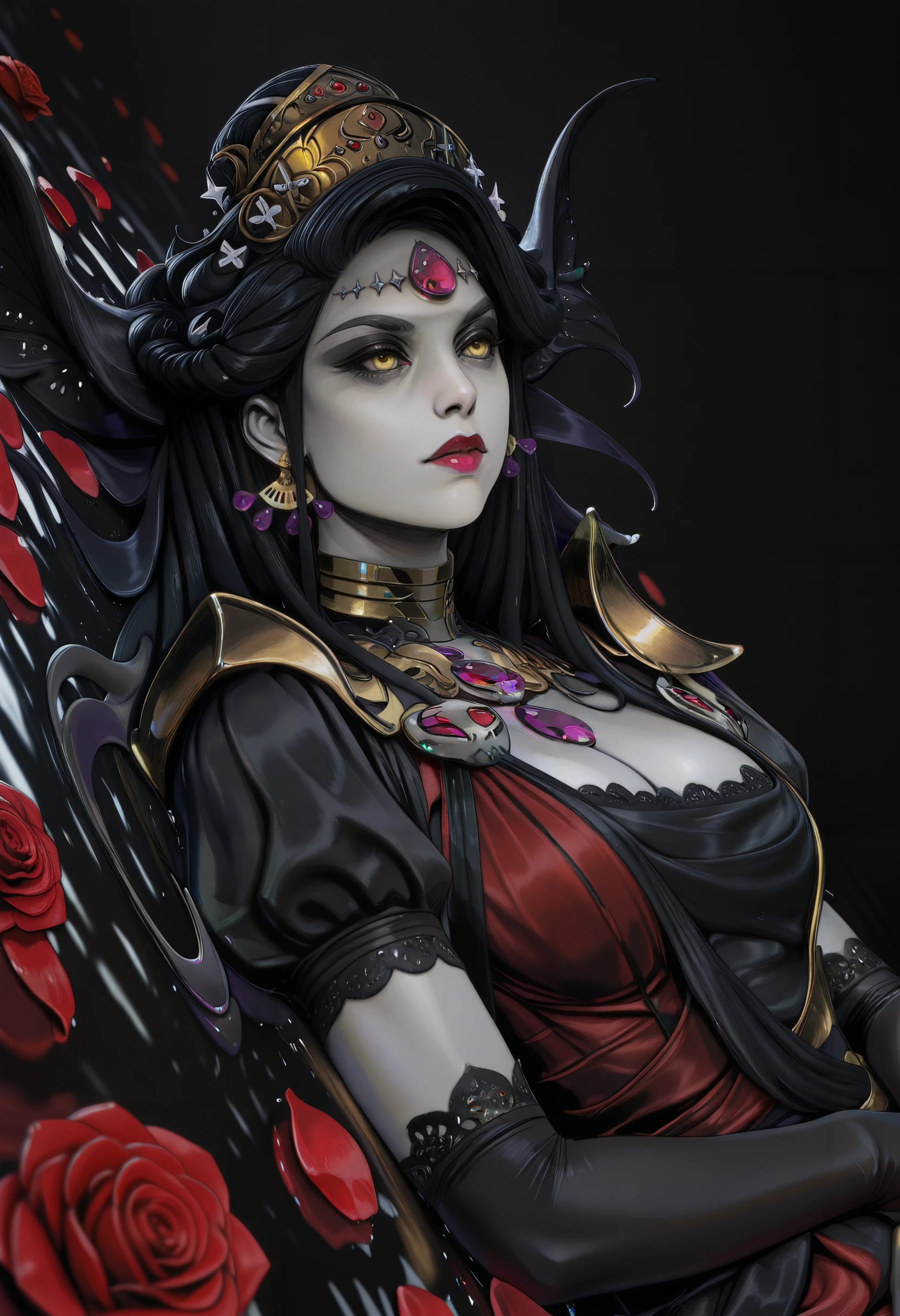 HNyx, 1girl, long hair, black hair, yellow eyes, jewelry, grey skin, forehead jewel, make up