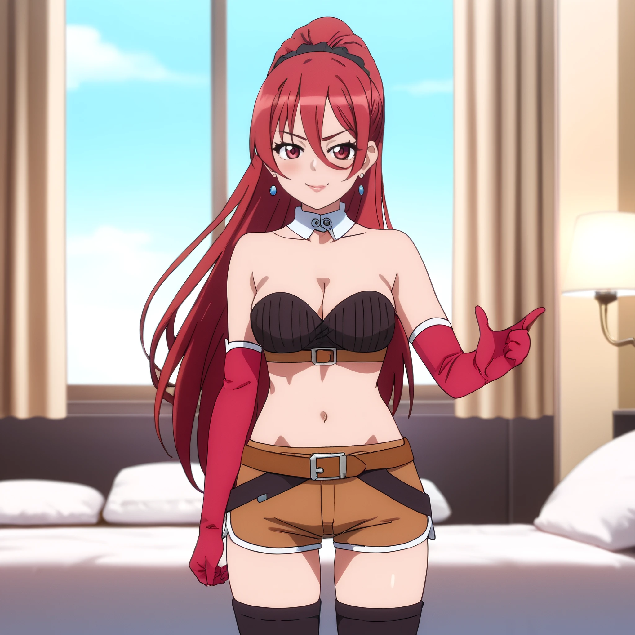 MayaAdventurer, earrings, jewelry, dark-brown scarf, elbow gloves, red gloves, cleavage, navel, belt, brown shorts, midriff, black thighhighs, short shorts, strapless top, brown top, black boots, white collar,
