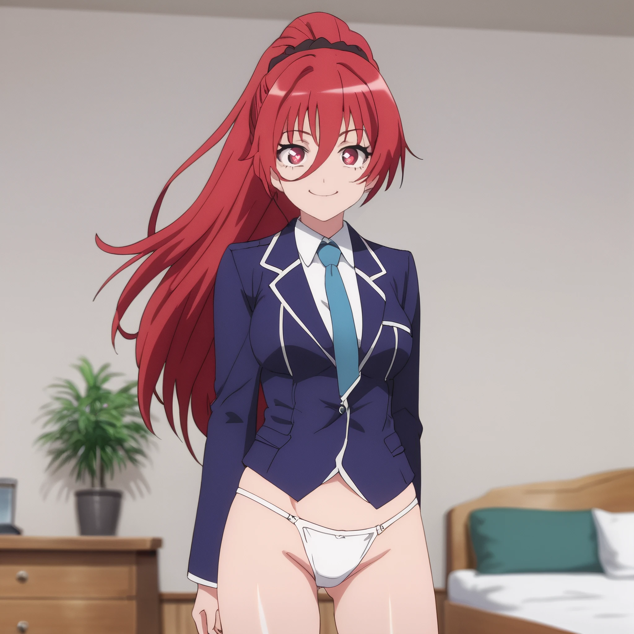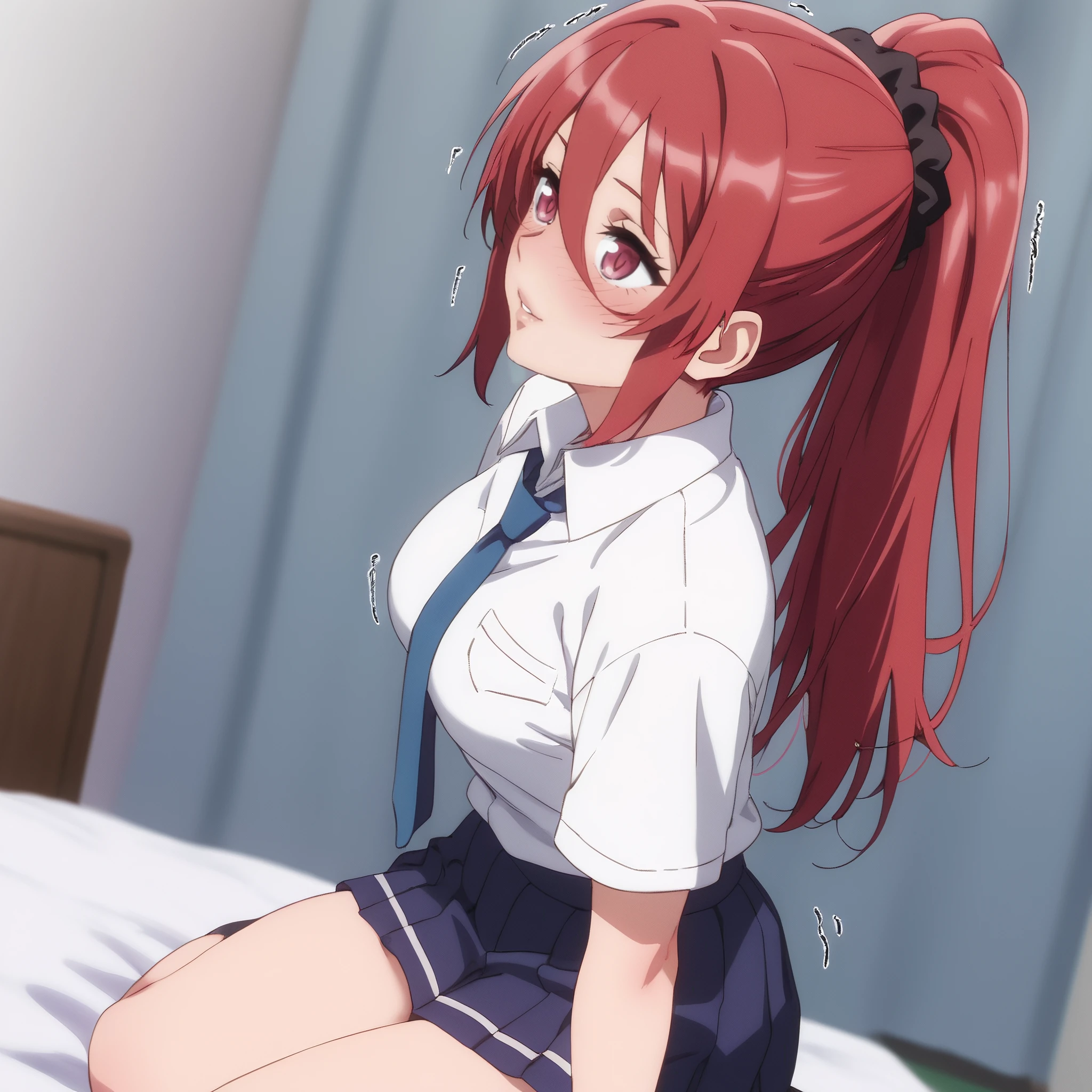 MayaIkusaba, red eyes, red hair, long hair, ponytail, hair between eyes, medium breasts, hair scrunchie,