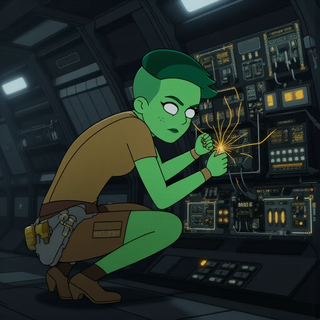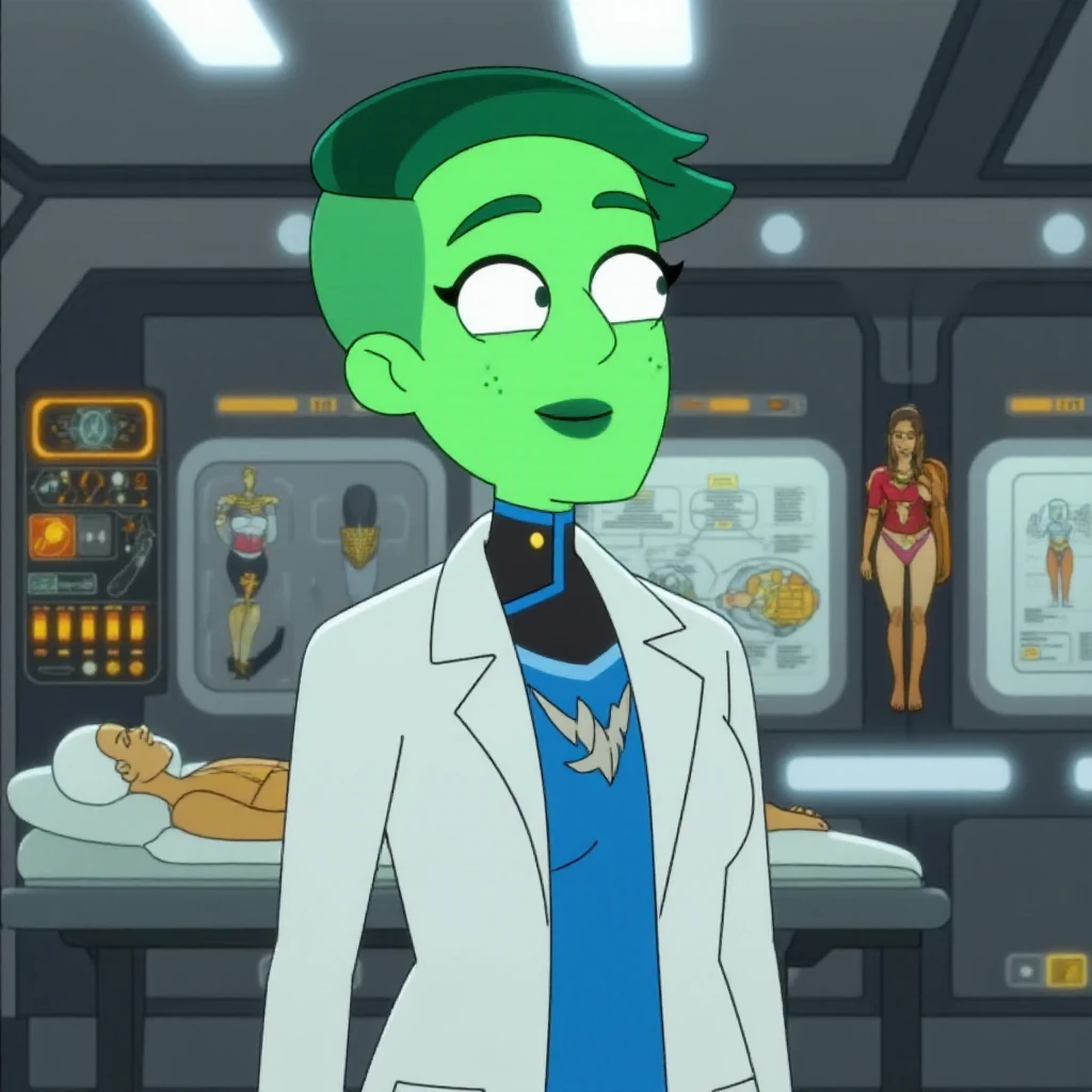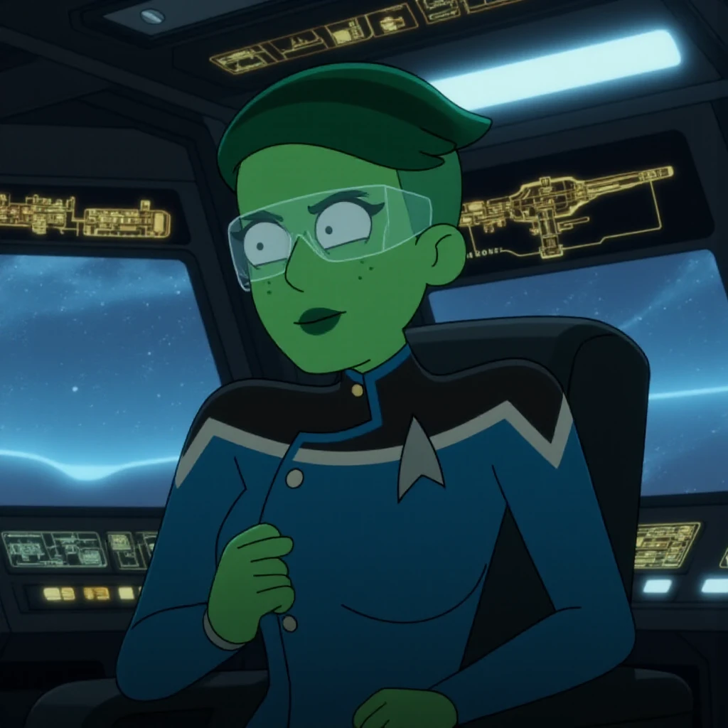 <lora:DVana_Tendi_Star_Trek_Lower_Decks_FLUX:1> D'vana Tendi, green skin, short dark green hair, (Describe the scene) animated, cell shaded, cartoon